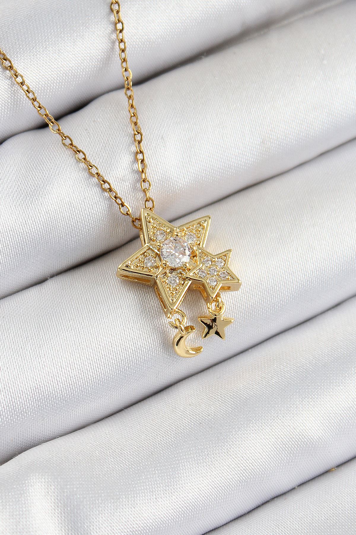 316L Çelik Zirkon Taşlı Sallantılı Yıldız Model Gold Renk Kadın Kolye - TJ-BKO10361