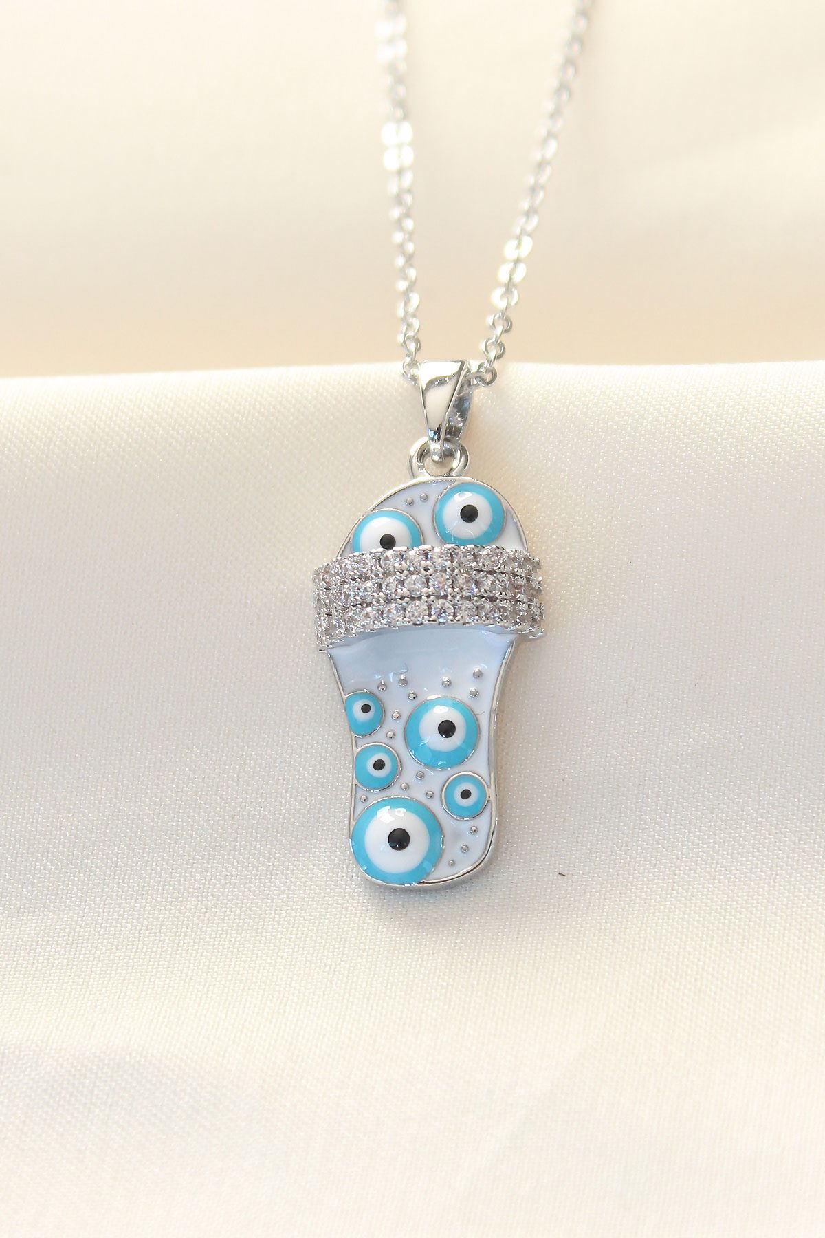 316L Zinciri Çelik Zirkon Taşlı Gümüş Renk Nazar Boncuklu Terlik Kolye - TJ-BKO8495