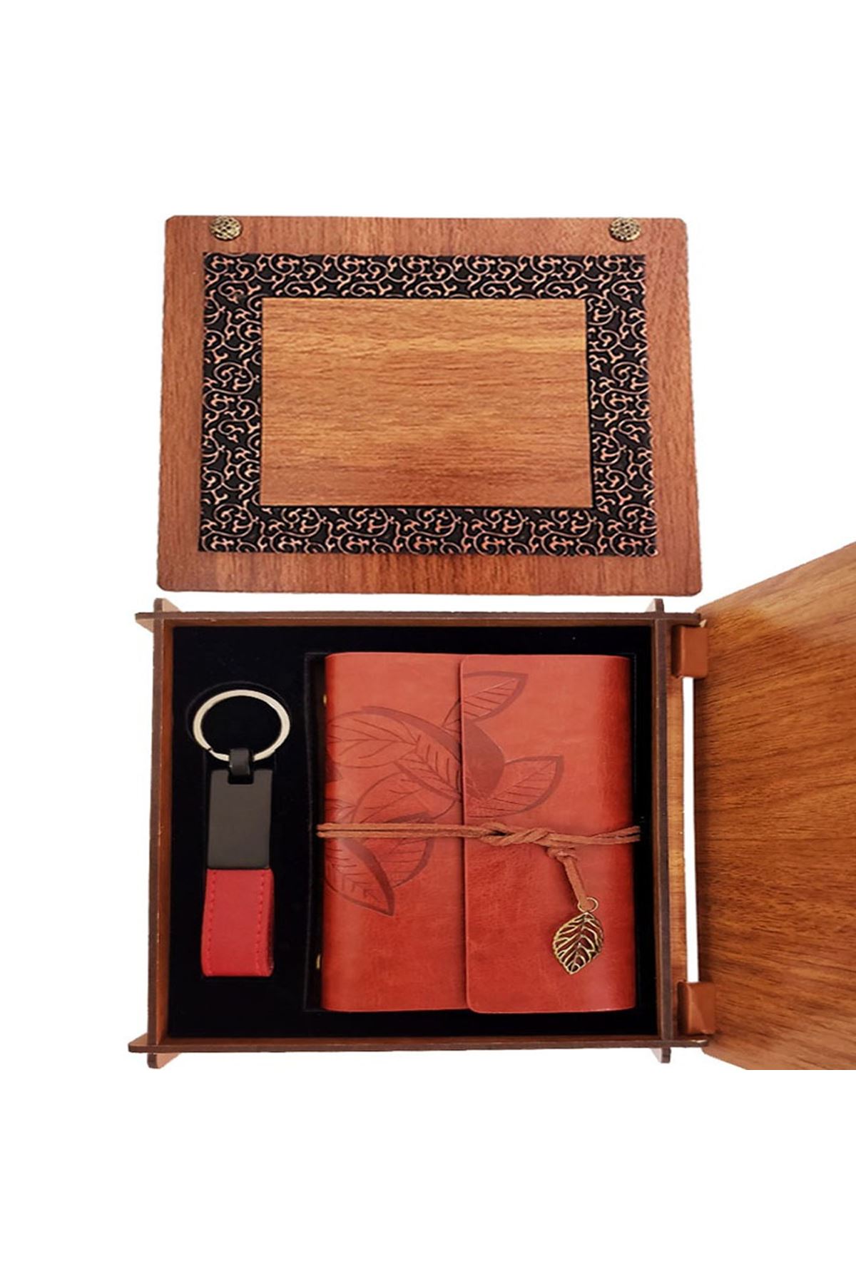 Ahşap Kutulu Kahve Deri Defter ve Anahtarlık Set