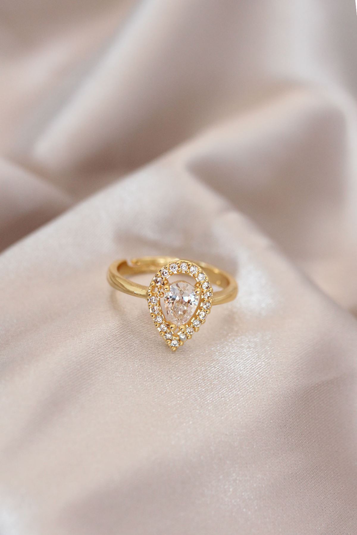 Ayarlamalı Gold Renk Metal Zirkon Taşlı Damla Model Yüzük - TJ-BYK2071