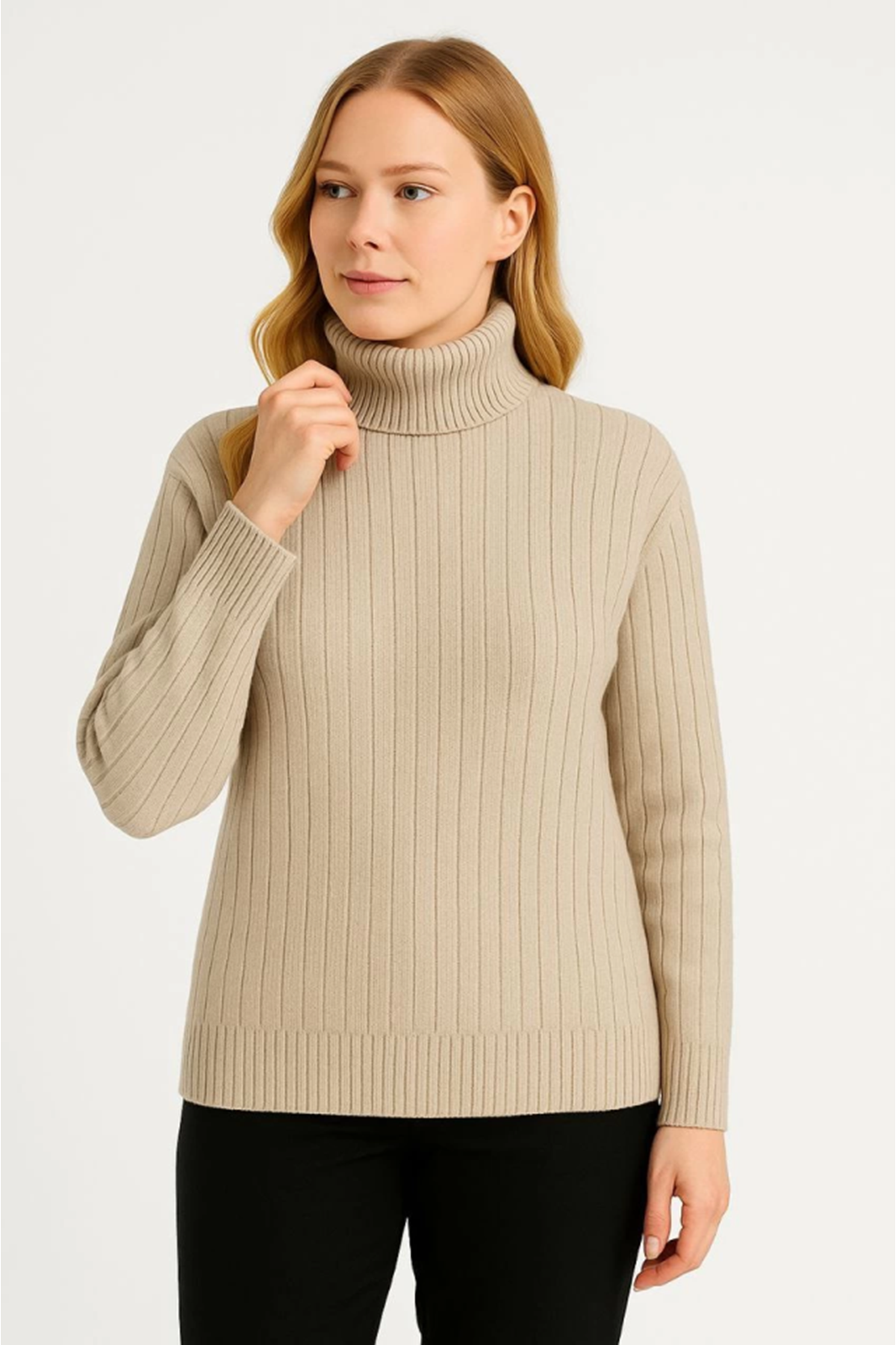 Balıkcı Yaka Bağazlı Triko Kazak Pamuklu Kalın Fitilli Dokuma - Bej