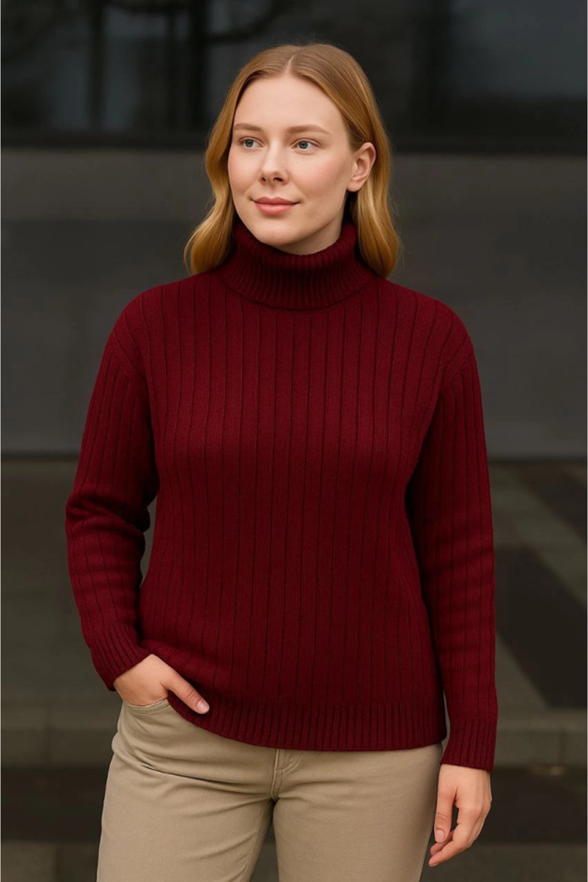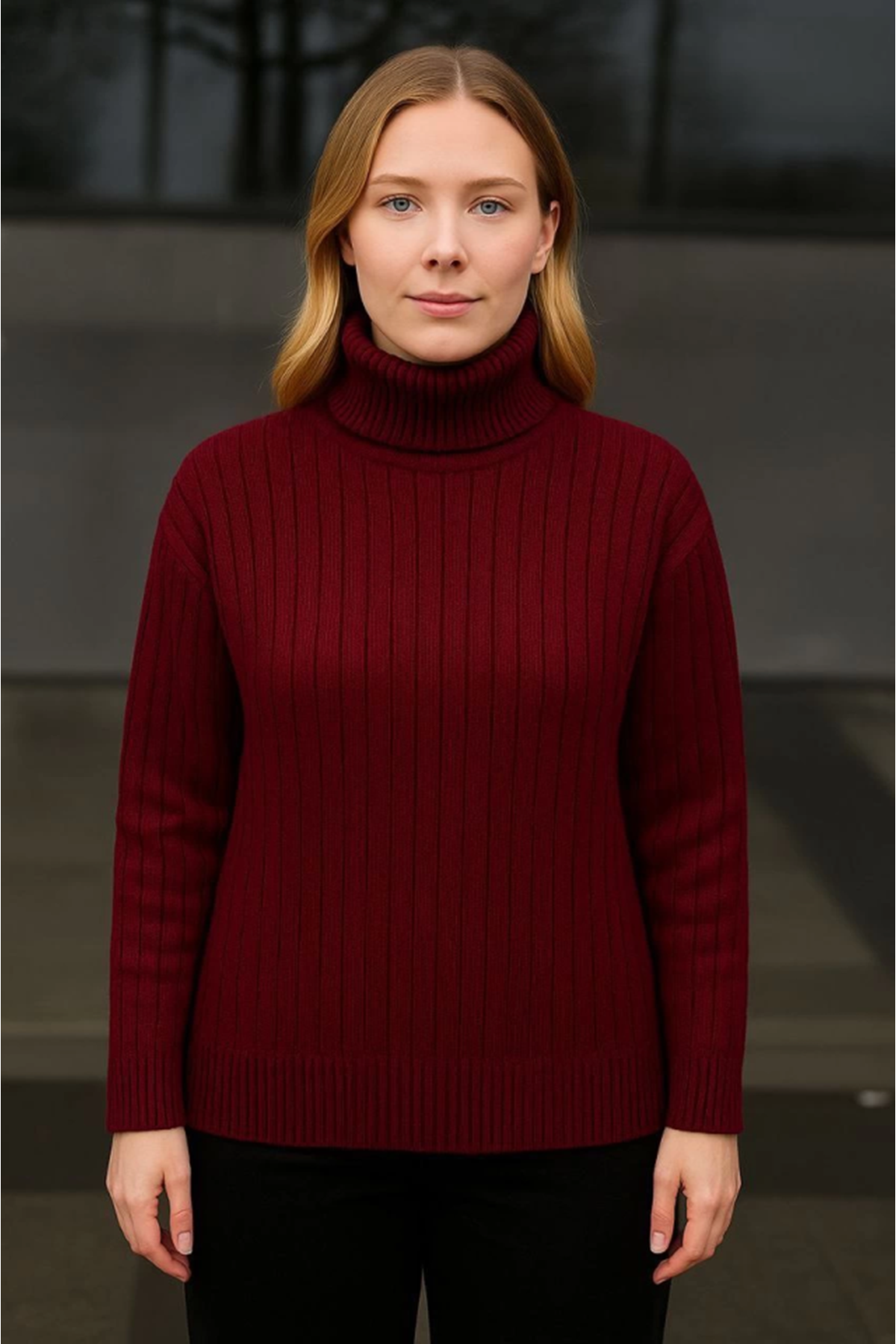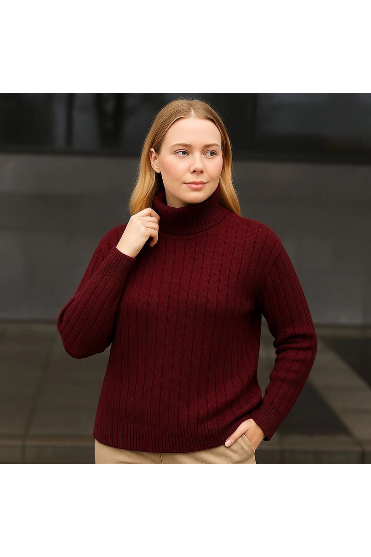 Balıkcı Yaka Bağazlı Triko Kazak Pamuklu Kalın Fitilli Dokuma - Bordo