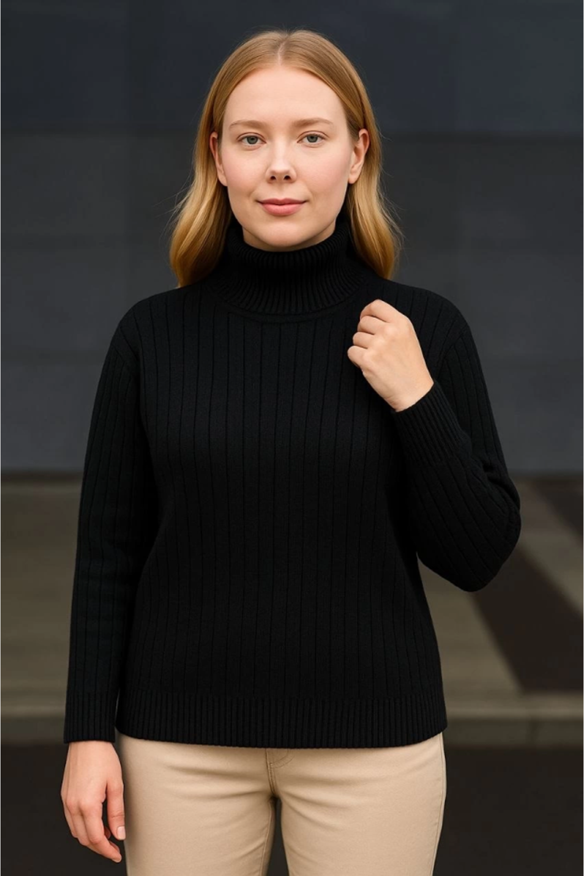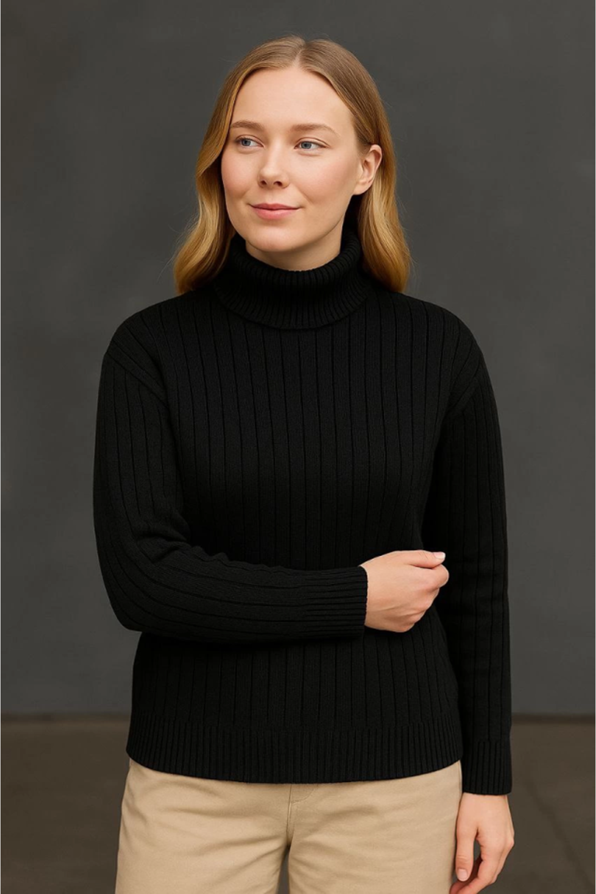 Balıkcı Yaka Bağazlı Triko Kazak Pamuklu Kalın Fitilli Dokuma - Siyah