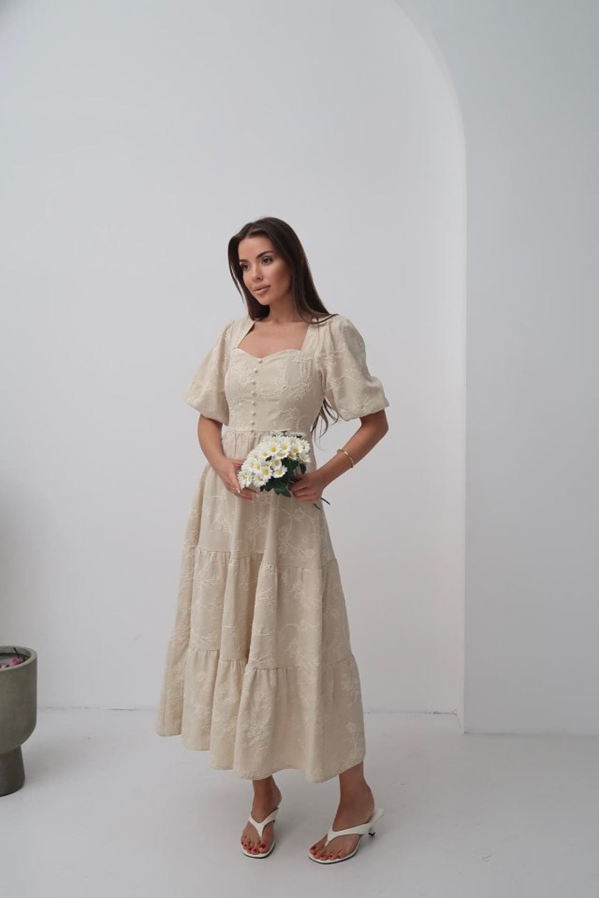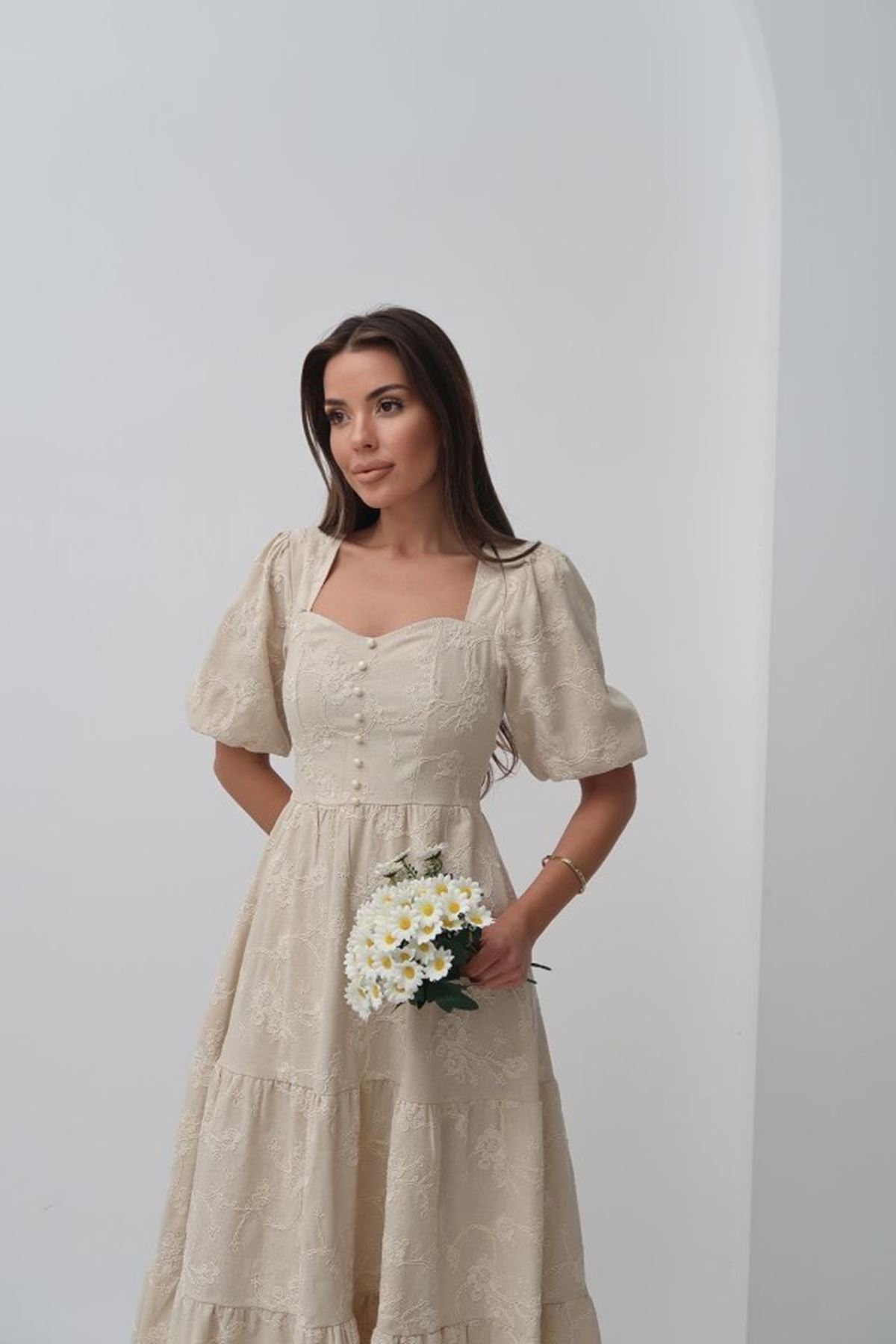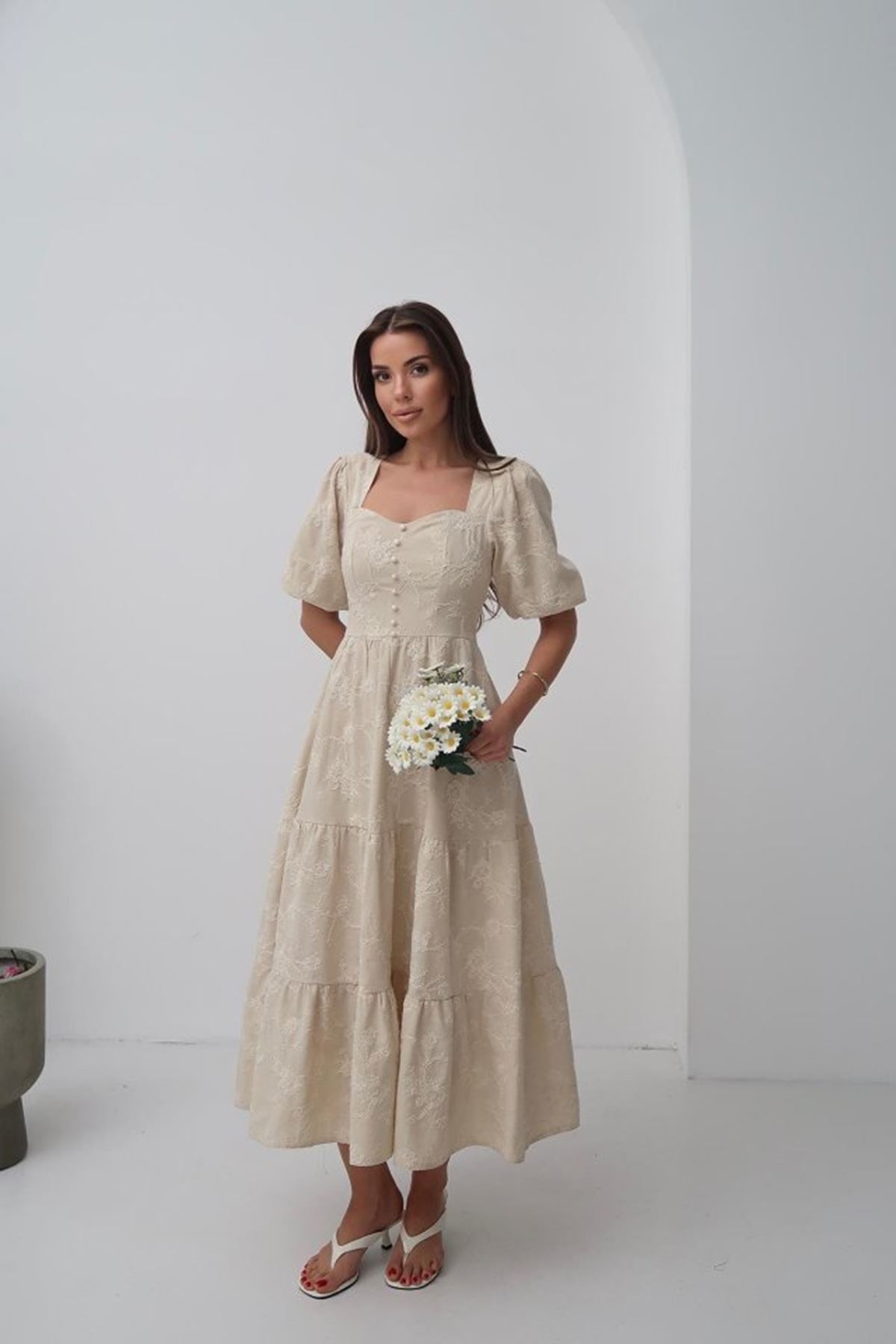 Bej Süs Düğmeli Balon Kollu Elbise