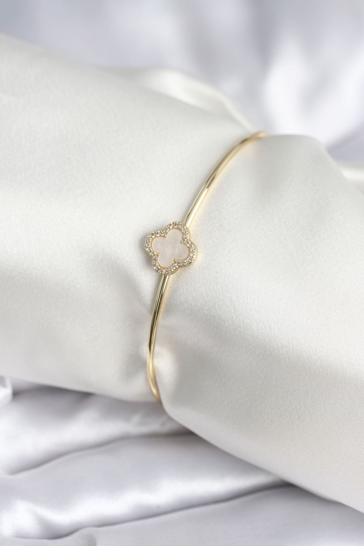 Beyaz Sedefli Yonca Model Gold Renk Kadın Bileklik - TJ-BB8005