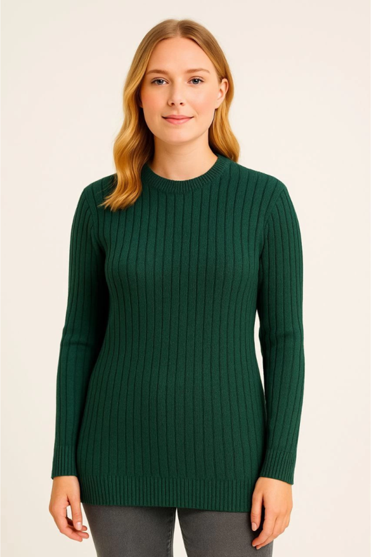 Bisiklet Yuvarlak Yaka Triko Kazak Pamuklu Kalın Fitilli Dokuma, Regular Fit Uzun Kollu Kışlık Model - Haki