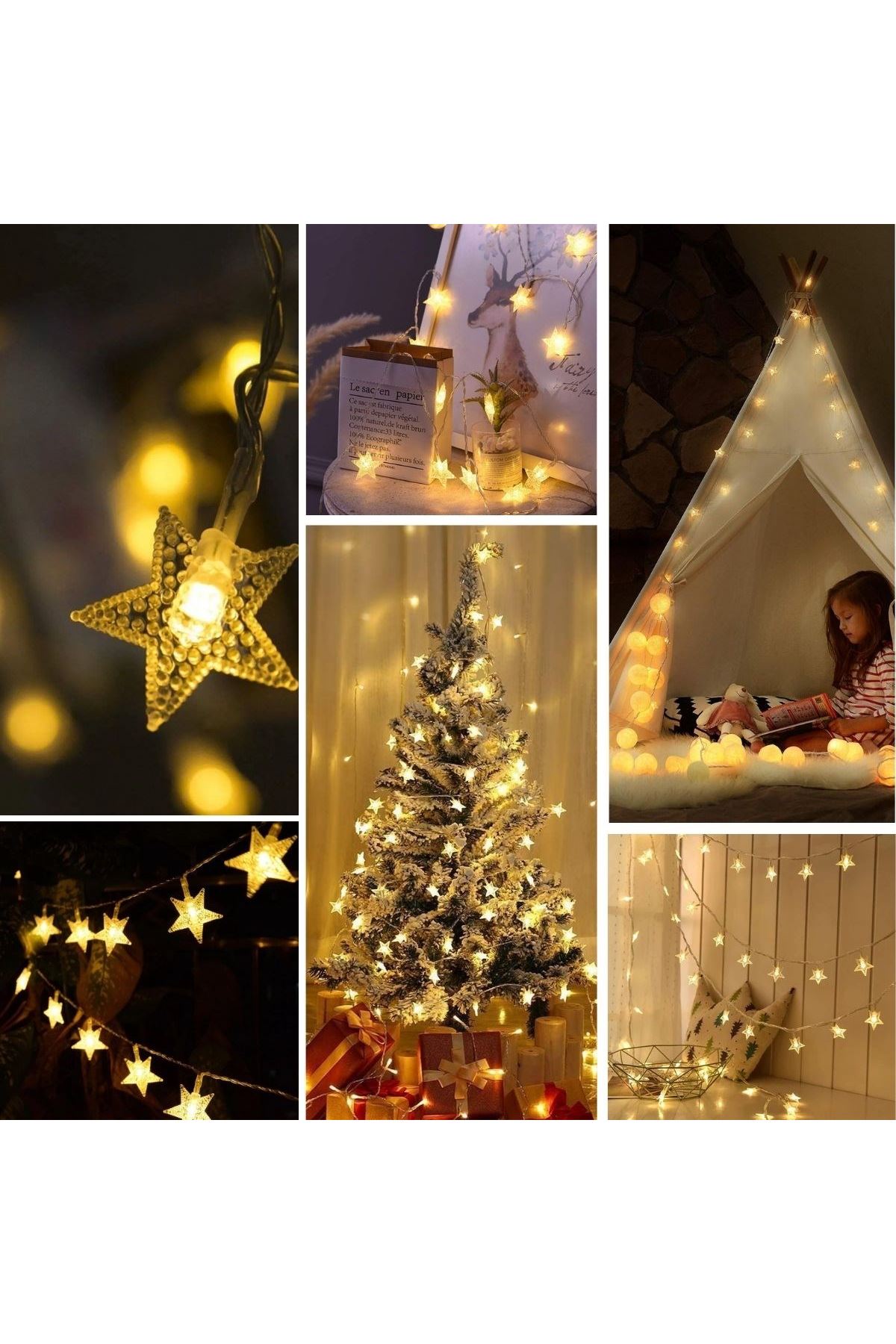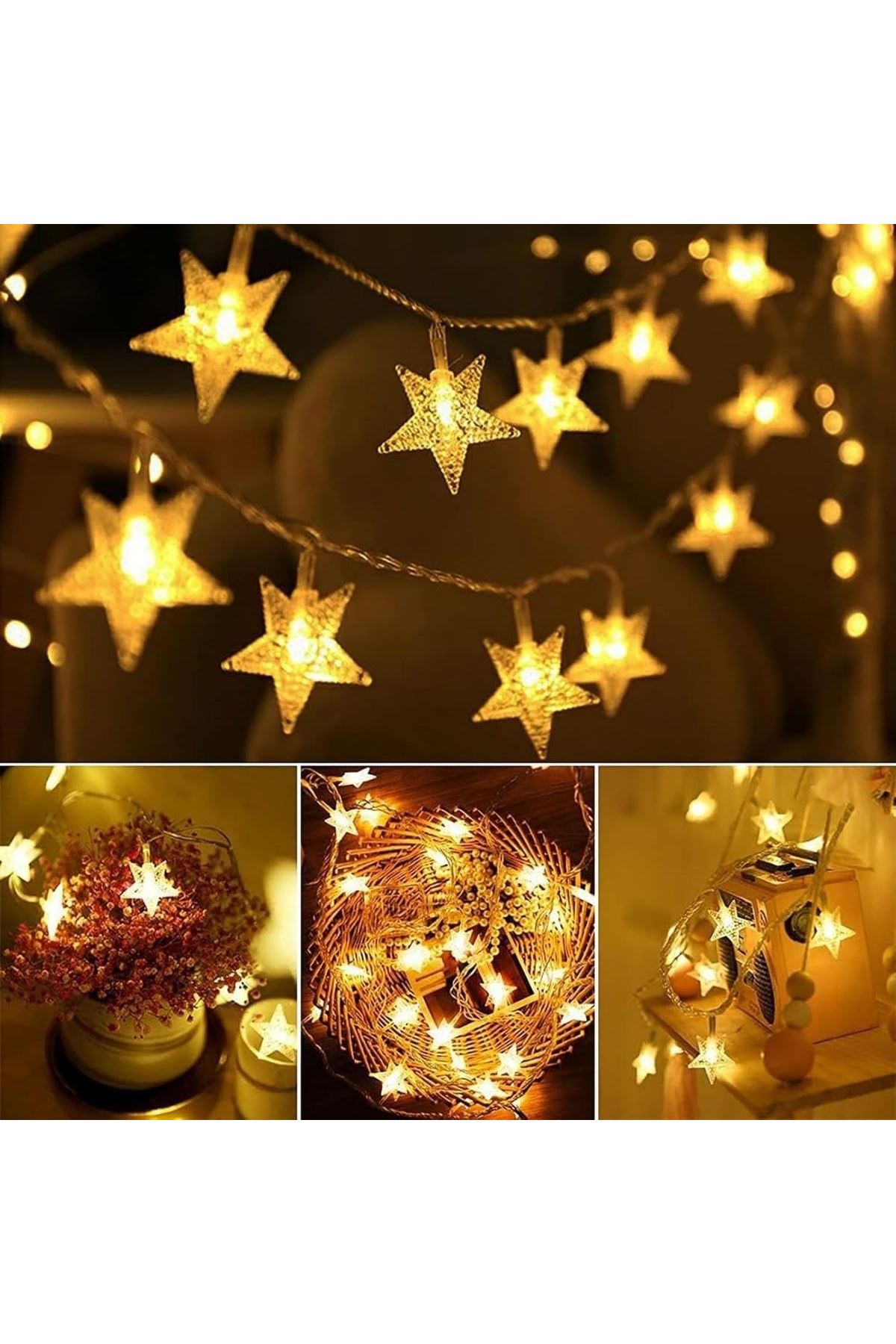 Dekoratif Aydınlatma: Yıldız şekilli 20 LED ampul, 5 metre uzunluğunda kablo üzerinde eşit aralıklarla dizilmiştir.