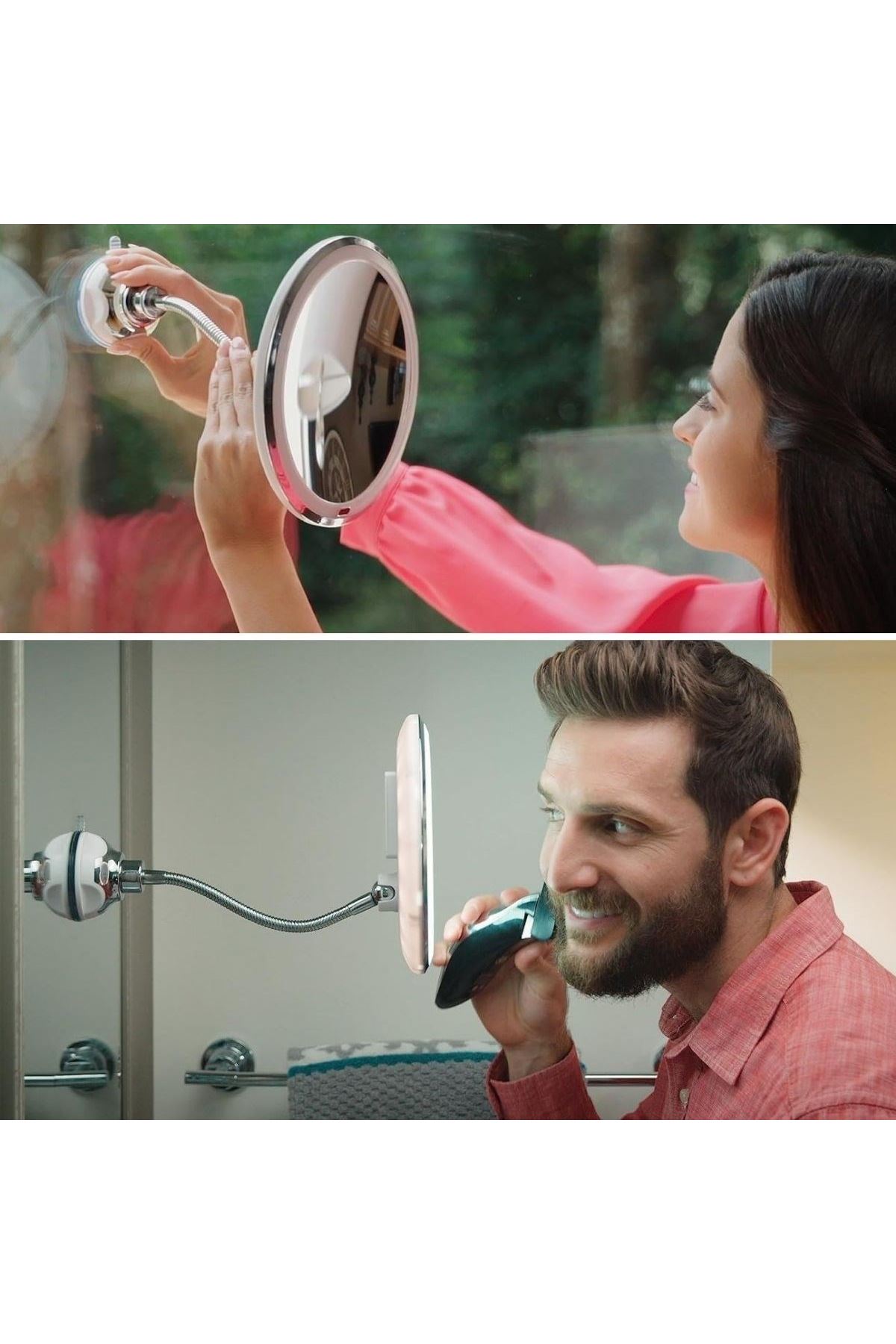 Güçlü vantuz mekanizması sayesinde seramik, cam, mermer, ayna gibi düz yüzeylere sıkıca yapışır ve kayma yapmadan sabit durur. 360° dönebilen esnek boynu ile ister oturarak ister ayakta tüm açılarda rahat kullanım sunar. Kompakt ve hafif tasarımıyla evde, ofiste ve seyahatlerde kolayca taşınabilir yapıdadır.
