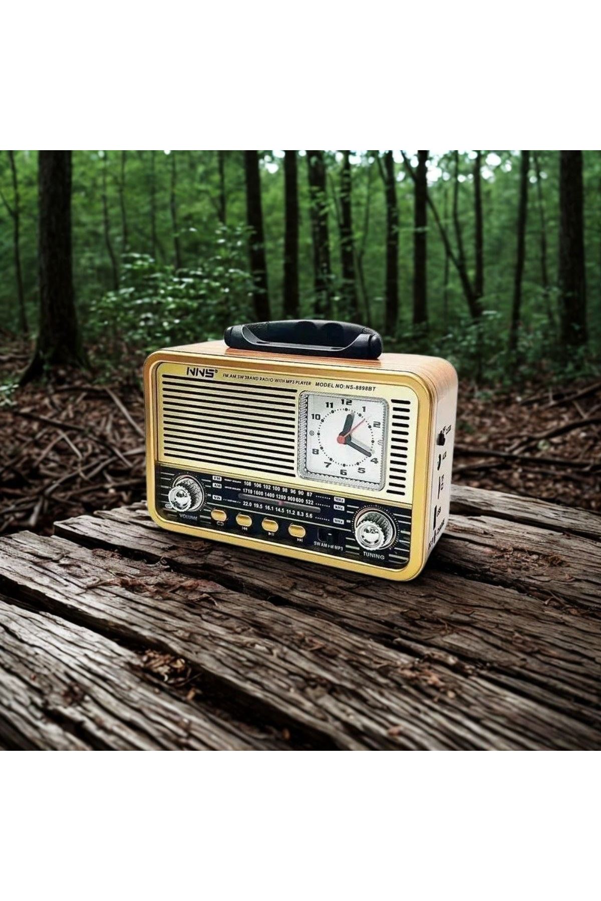 BUFFER® Orta Boy Saat Göstergeli Retro Ahşap Tasarım Bluetooth Hoparlörlü Radyo – FM/AM Destekli, Şarjlı ve Taşınabilir (NS-8898)