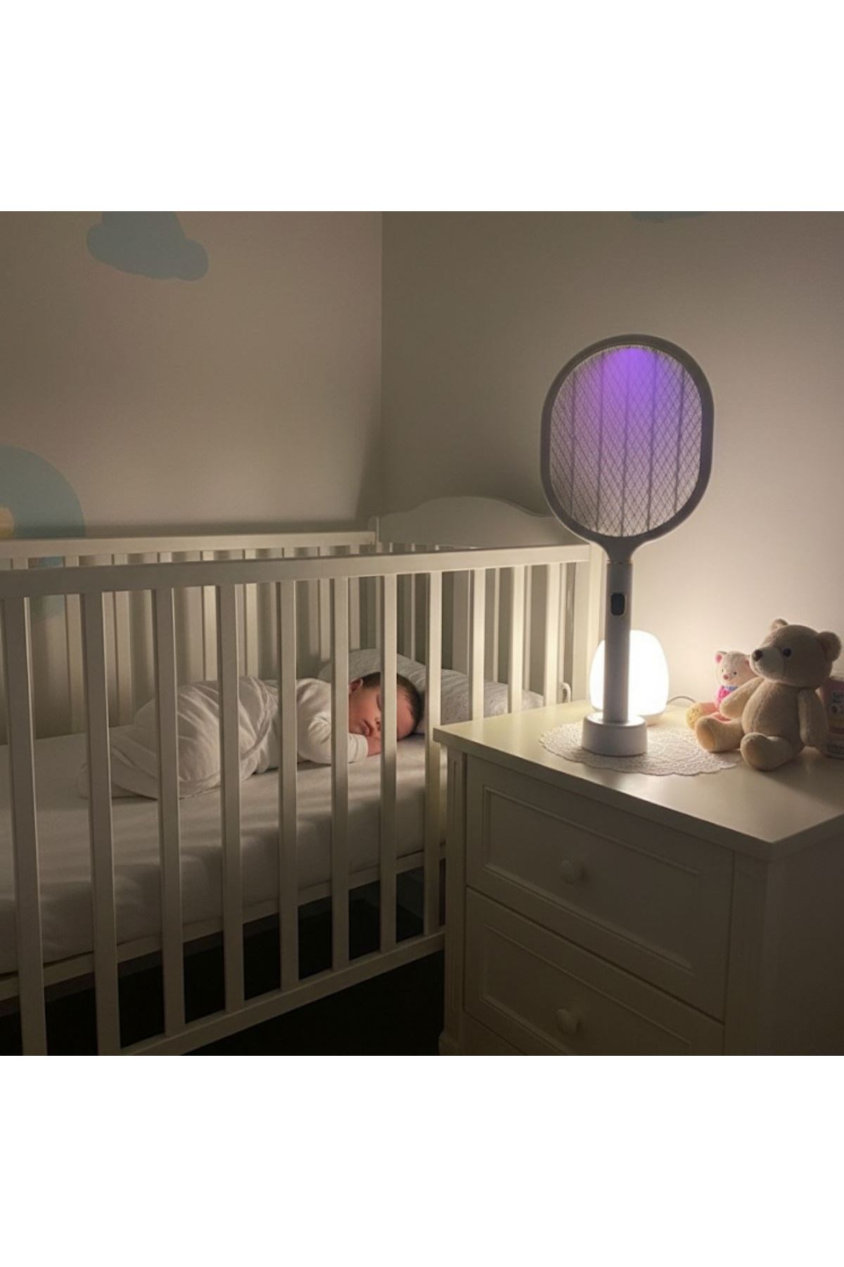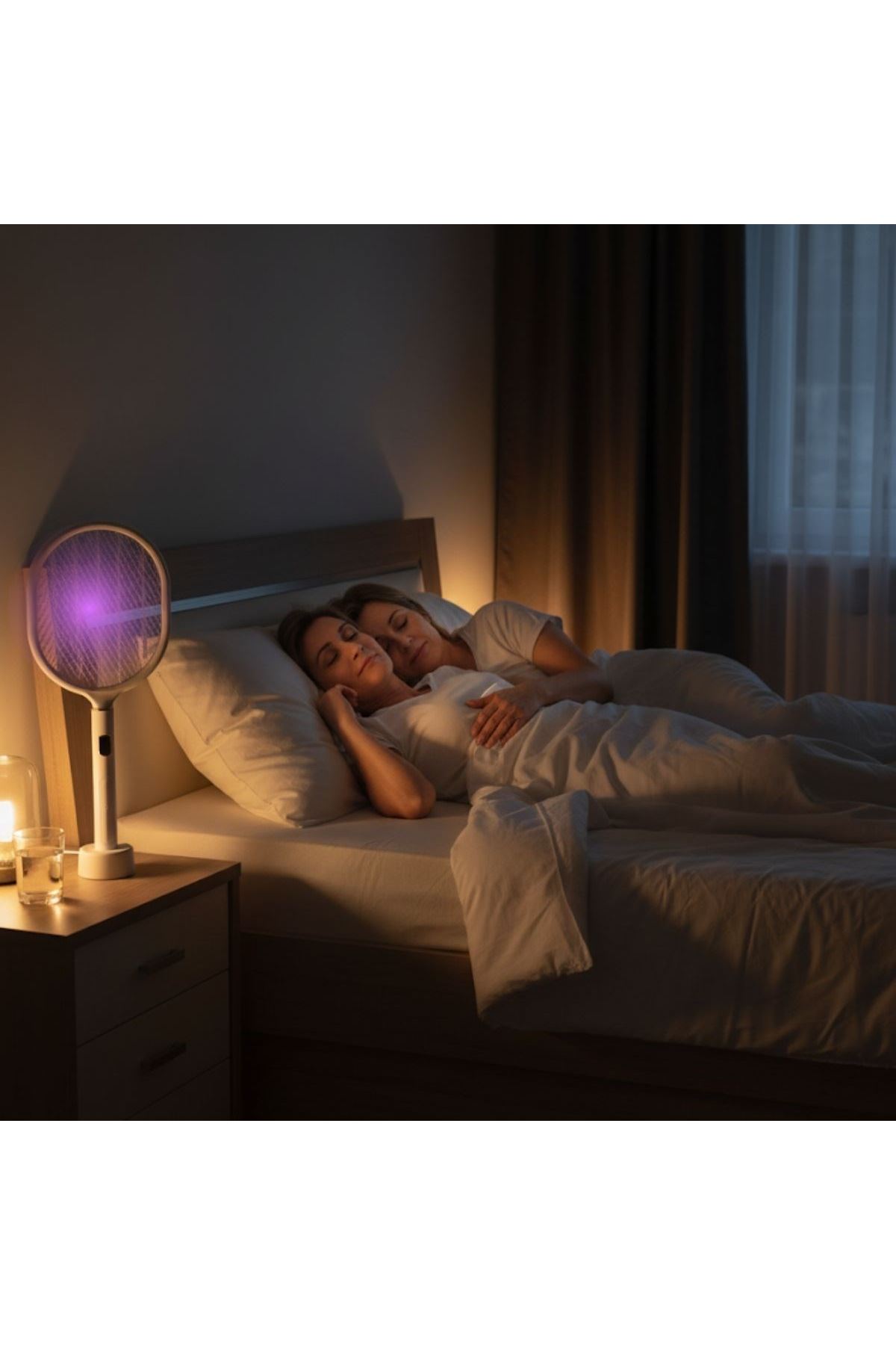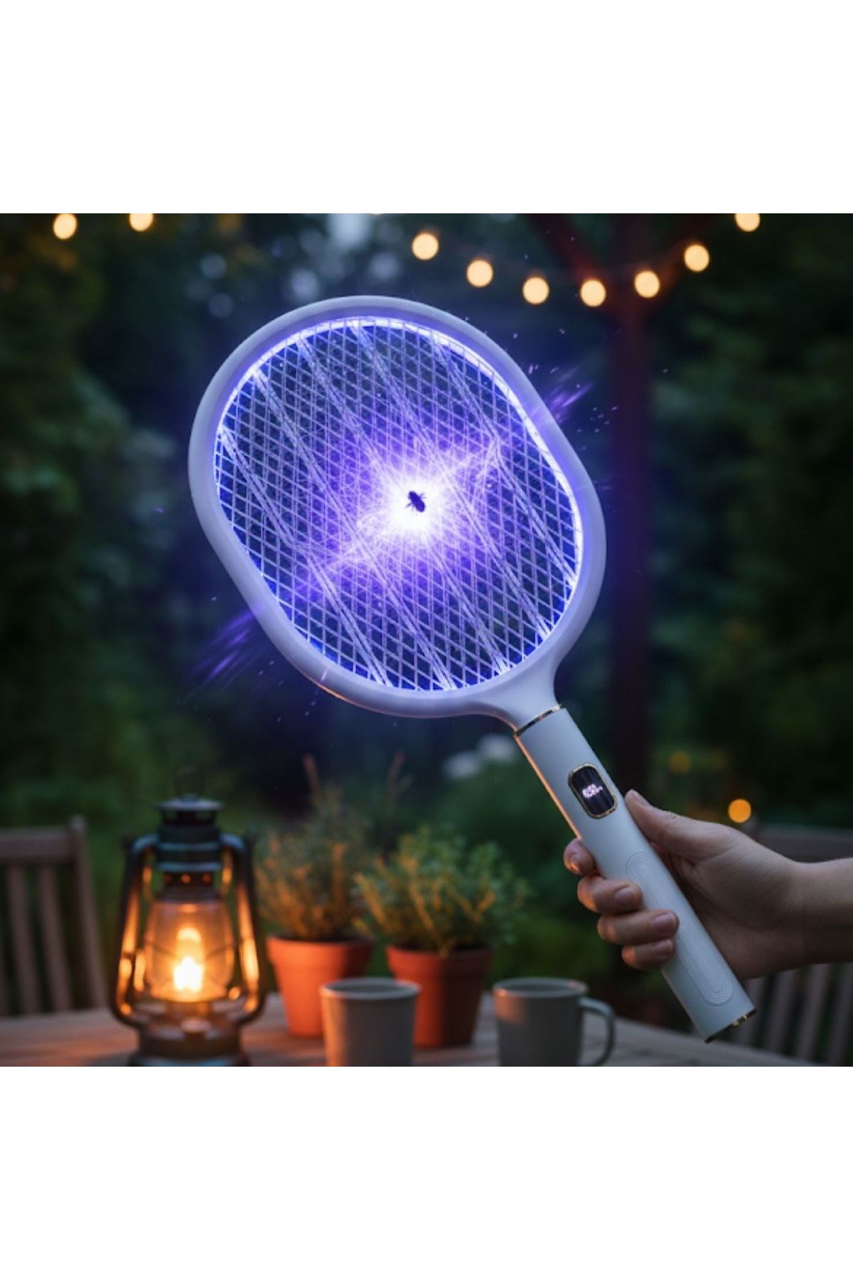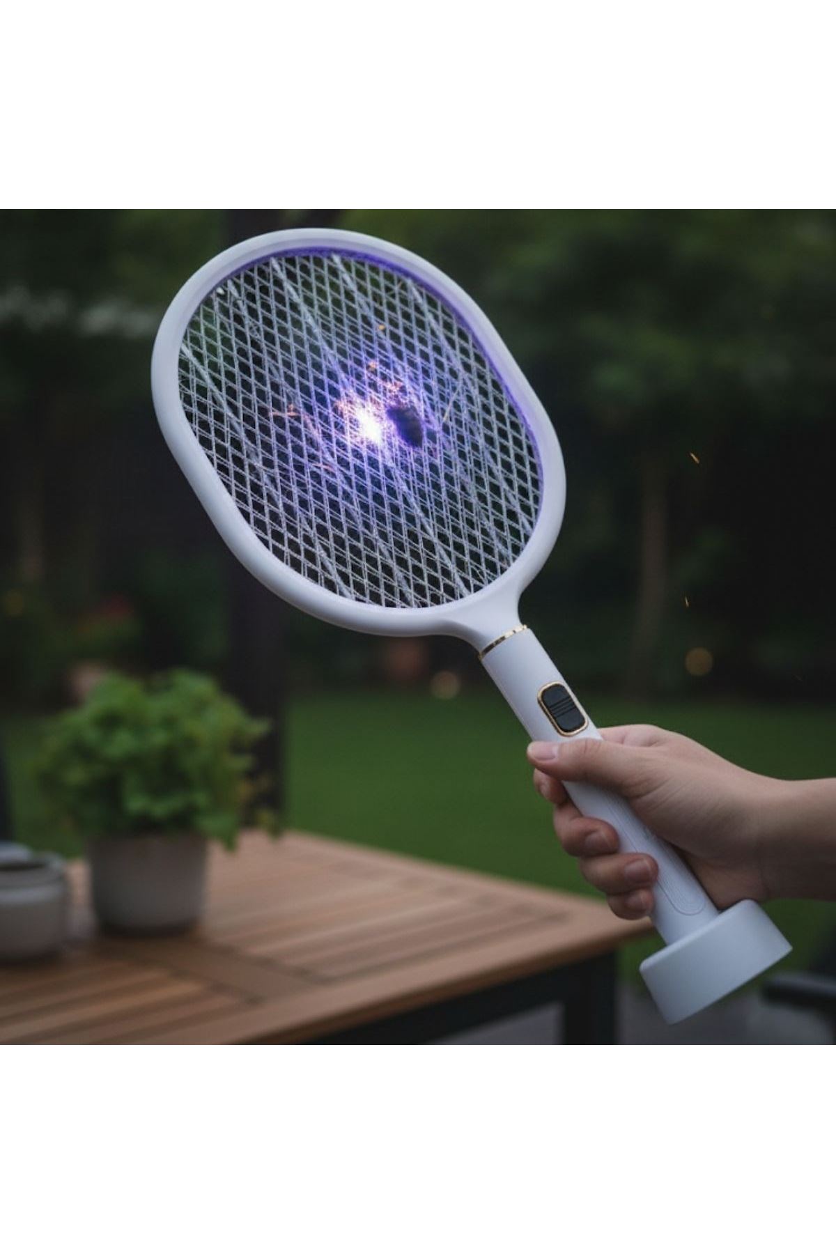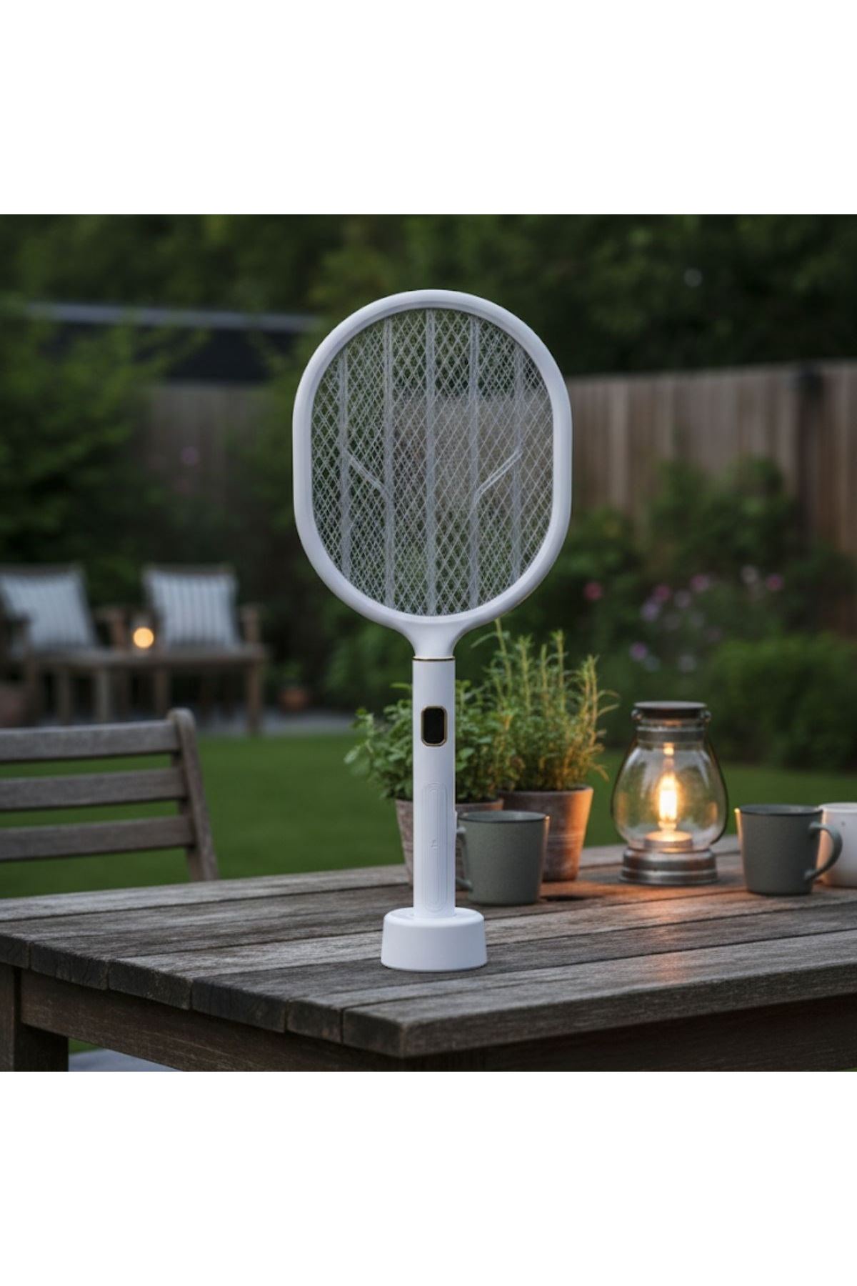 BUFFER® USB Şarjlı Beyaz Renk Kendiliğinden Standlı, Şarj Göstergeli UV Işıklı Sinek Öldürme Raketi