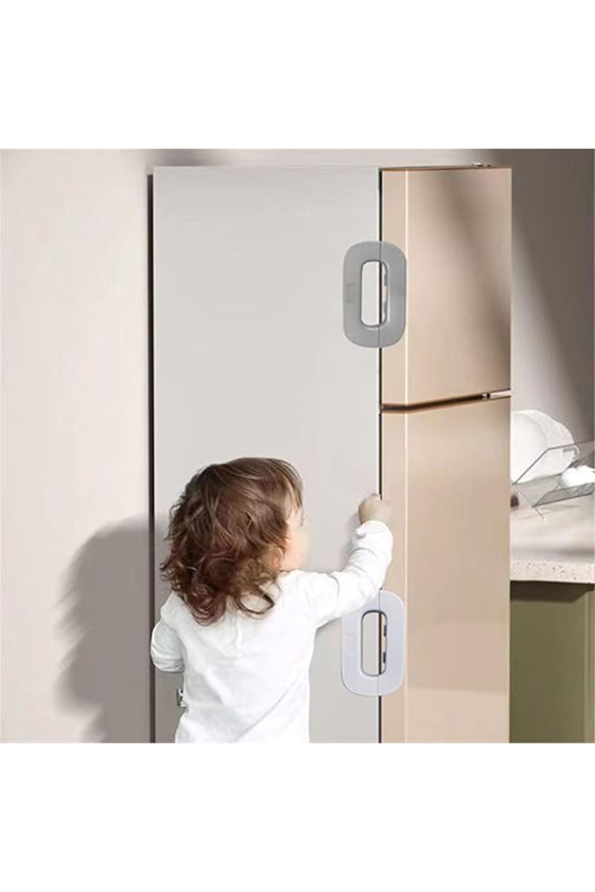 BUZDOLABI ÇOCUK KİLİDİÜrün Özellikleri Evdeki güvenliği artırmak için tasarlanan Buzdolabı Çocuk Kilidi, özellikle küçük çocukların buzdolabı, dolap, derin dondurucu gibi kapaklı alanlara erişimini engellemek amacıyla geliştirilmiştir. 11.1 cm uzunluğunda, 6.6 cm genişliğinde ve 2.3 cm kalınlığında olan bu kompakt tasarım, estetik görünümüyle her tür beyaz eşyaya uyum sağlar.Güçlü yapışkan yüzeyi sayesinde vidalama gerektirmez ve montajı oldukça kolaydır. Yüzeye zarar vermeden takılıp çıkarılabilir. Ergonomik mekanizması, yetişkinlerin kolayca açabileceği ancak çocukların zor erişeceği şekilde tasarlanmıştır. Sağlam ABS plastik malzemeden üretilmiştir ve uzun ömürlü kullanım sunar. Kapak açıldığında otomatik kilit sistemi devreye girer ve güvenliği sağlar.Buzdolaplarının yanı sıra mutfak dolapları, çekmeceler, derin dondurucular, çamaşır makineleri veya ilaç dolapları gibi alanlarda da kullanılabilir. Şık beyaz tasarımı sayesinde ev dekorasyonuna uyum sağlar ve pratik bir güvenlik çözümü sunar. Paket İçeriği 1 adet buzdolabı çocuk kilidi