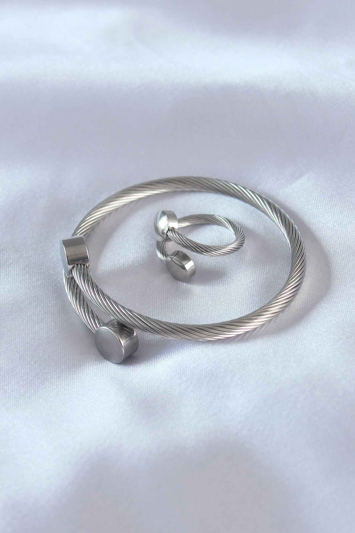 Çelik Gümüş Renk Sıkı Burgu Model Erkek Bileklik Yüzük Seti - TJ-EB3591