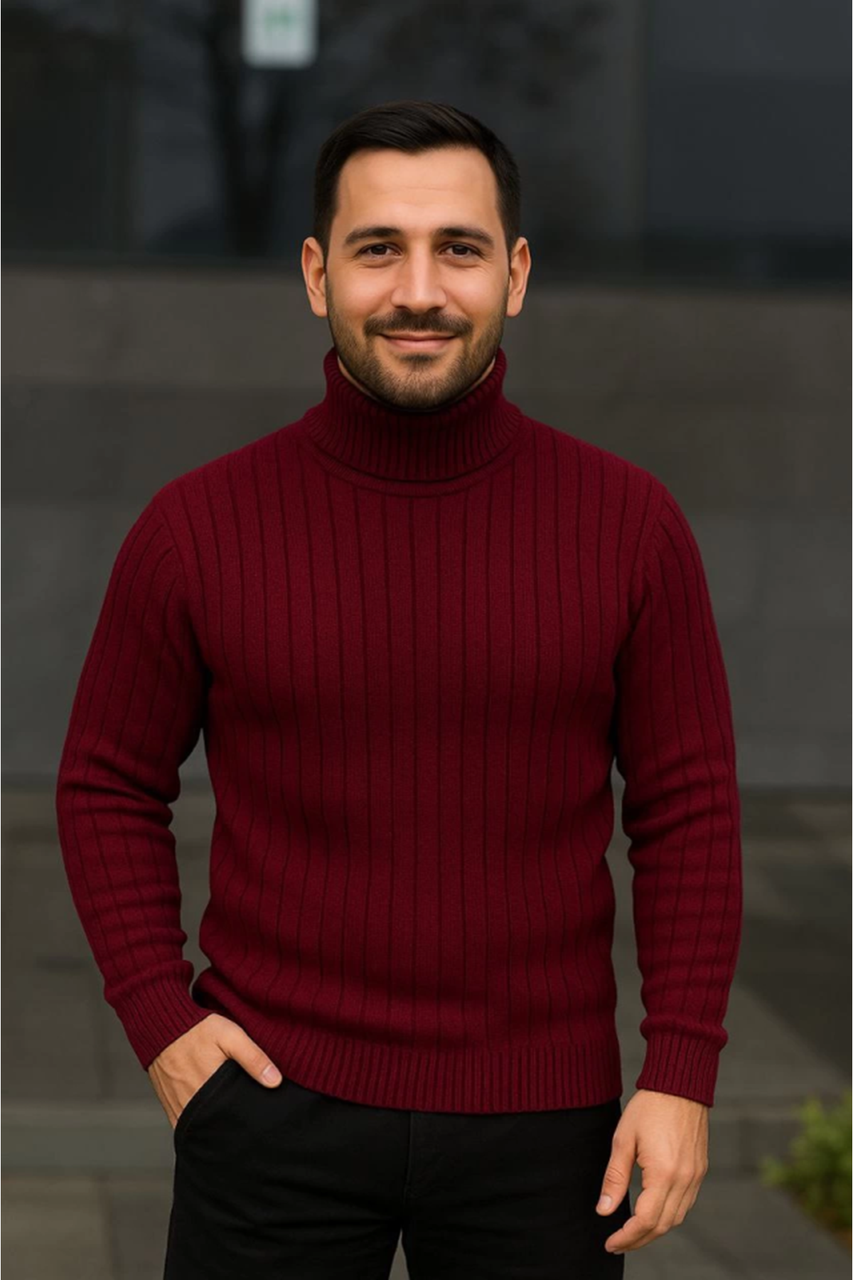 Erkek Balıkcı Yaka Bağazlı Triko Kazak Pamuklu Kalın Fitilli Dokuma, Regular Fit Uzun Kollu Kışlık Model - Bordo