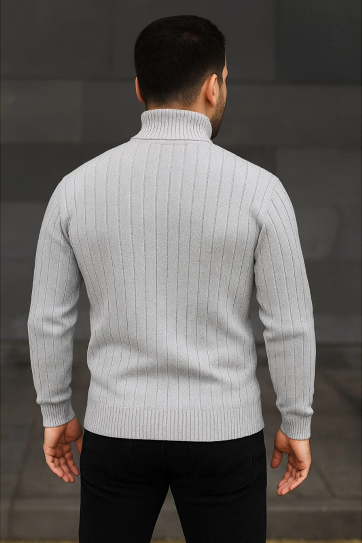 Erkek Balıkcı Yaka Bağazlı Triko Kazak Pamuklu Kalın Fitilli Dokuma, Regular Fit Uzun Kollu Kışlık Model - Gri
