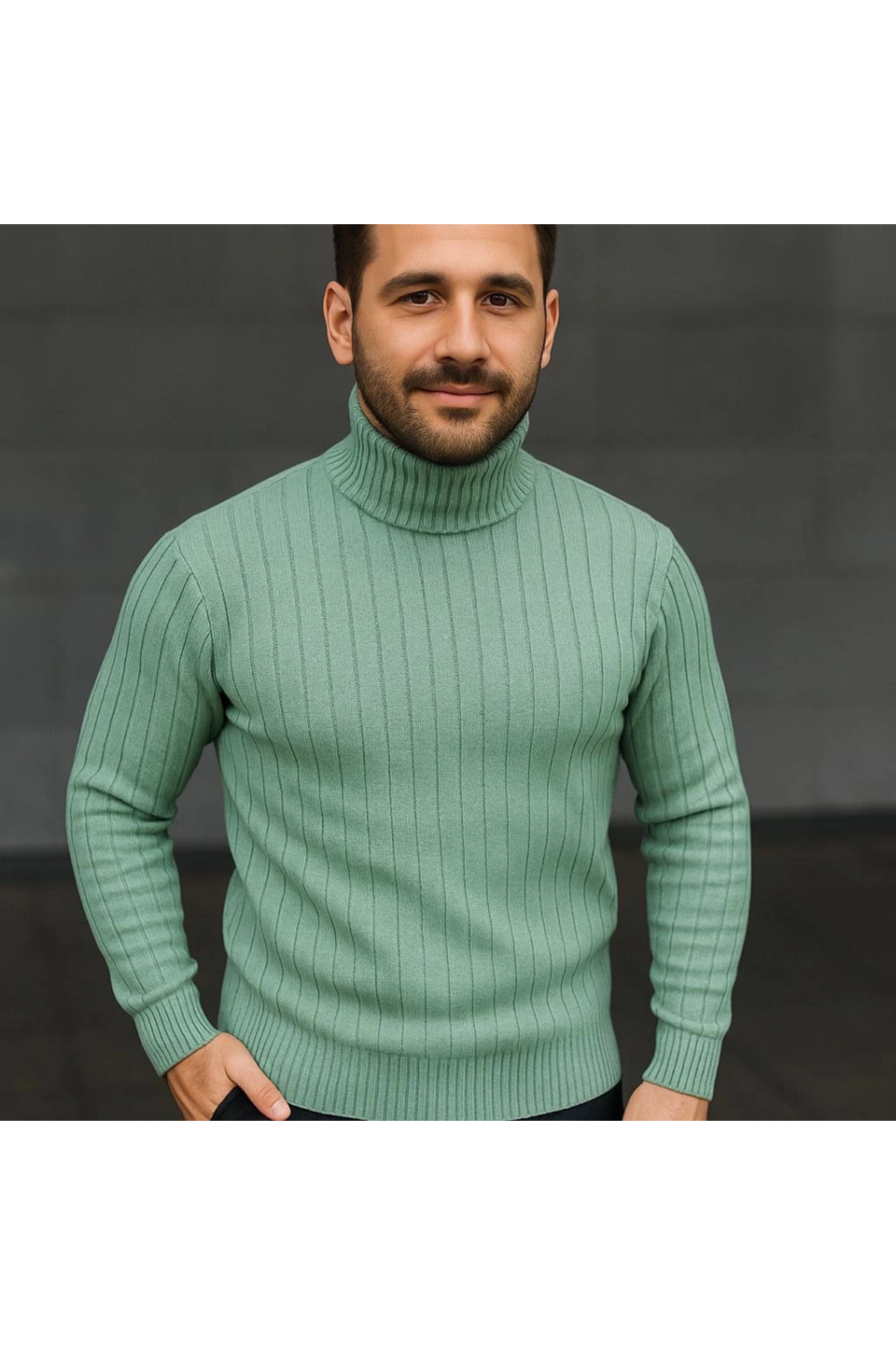 Erkek Balıkcı Yaka Bağazlı Triko Kazak Pamuklu Kalın Fitilli Dokuma, Regular Fit Uzun Kollu Kışlık Model - Mint Yeşili