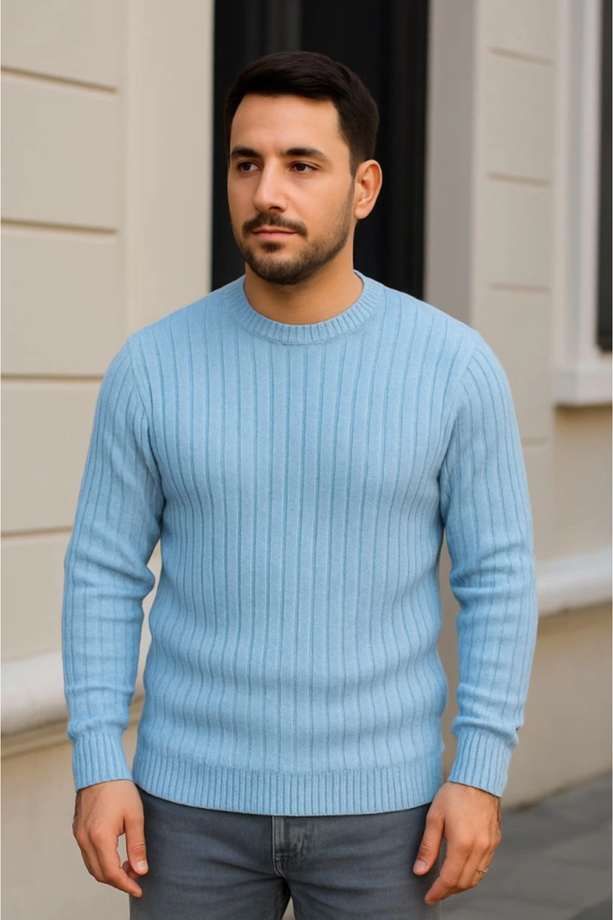 Erkek Bisiklet Yuvarlak Yaka Triko Kazak Pamuklu Kalın Fitilli Dokuma, Regular Fit Uzun Kollu Kışlık Model - Bebe Mavisi