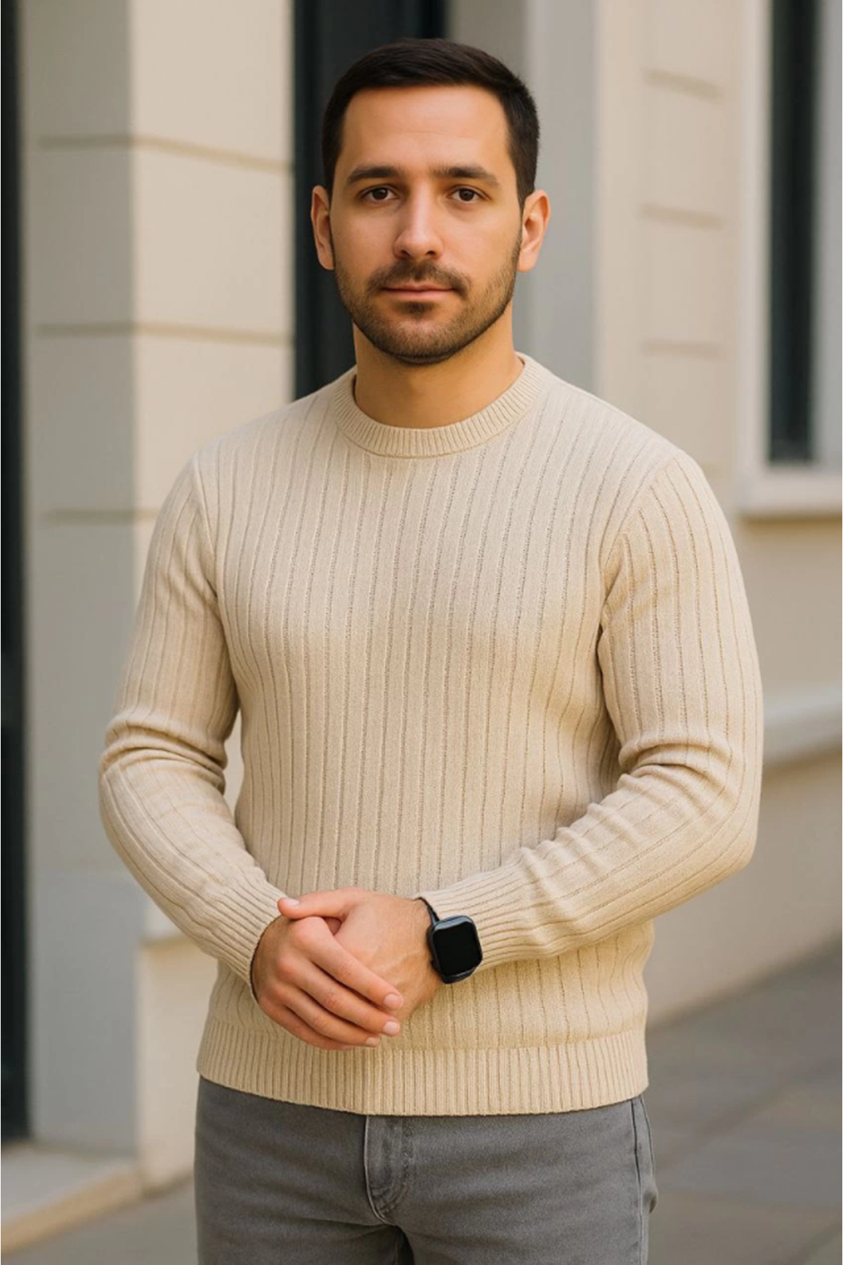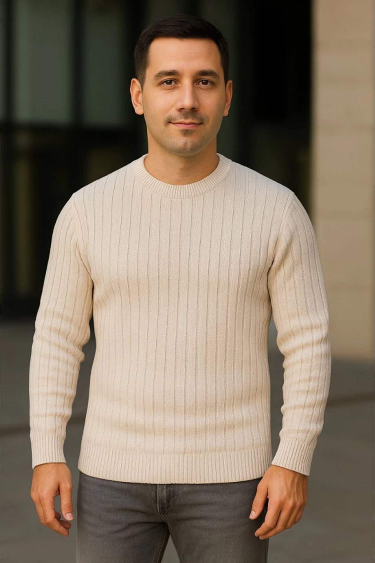 Erkek Bisiklet Yuvarlak Yaka Triko Kazak Pamuklu Kalın Fitilli Dokuma, Regular Fit Uzun Kollu Kışlık Model - Bej