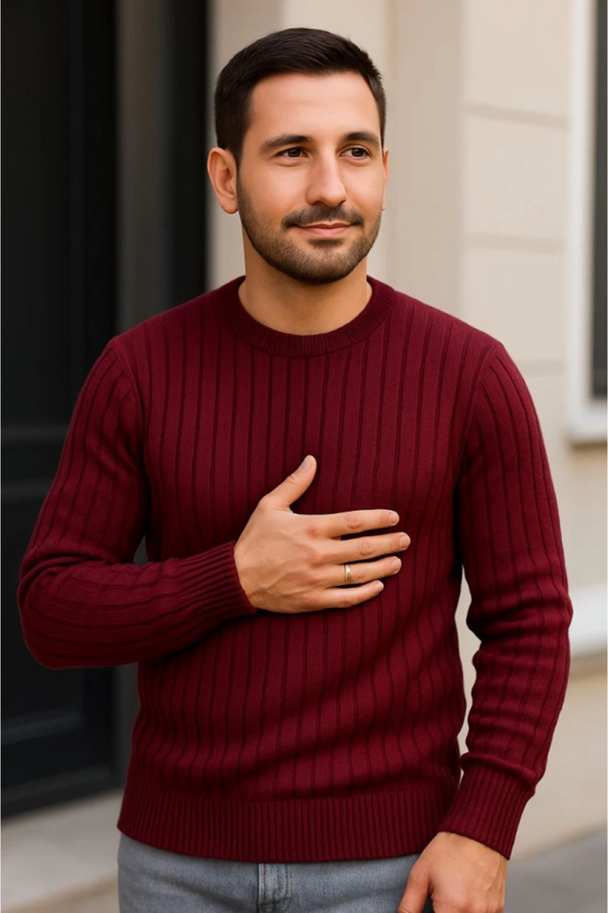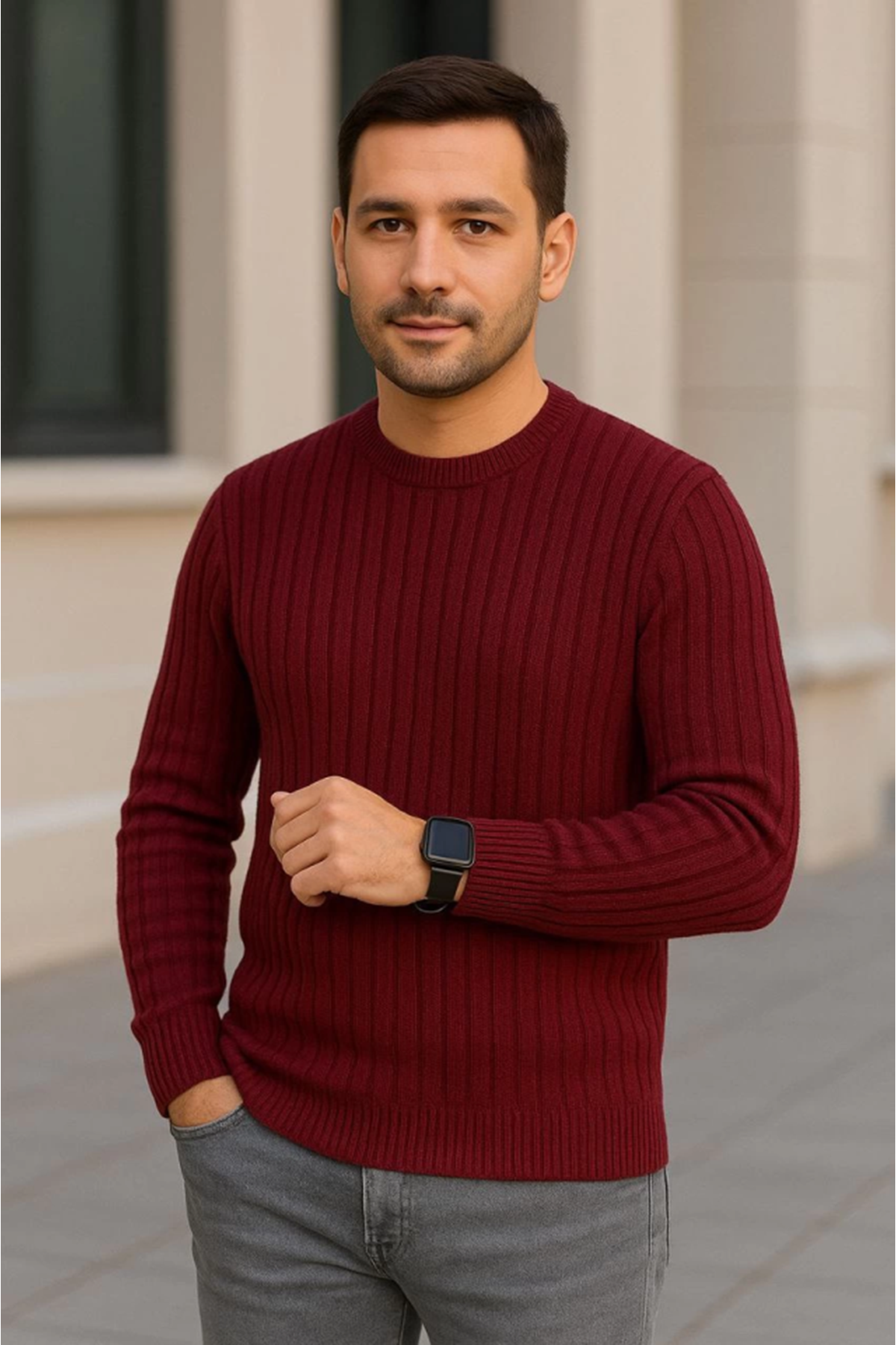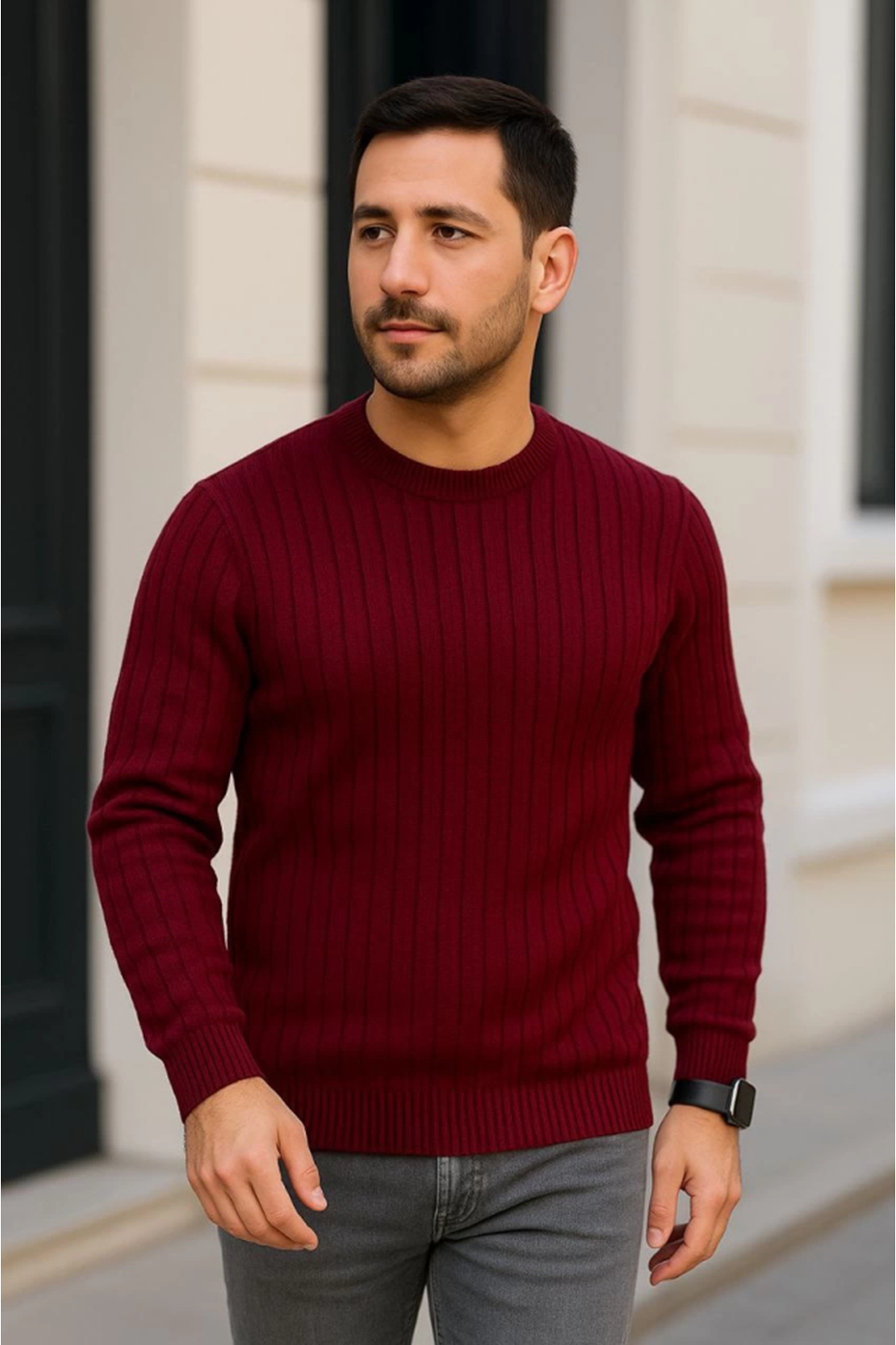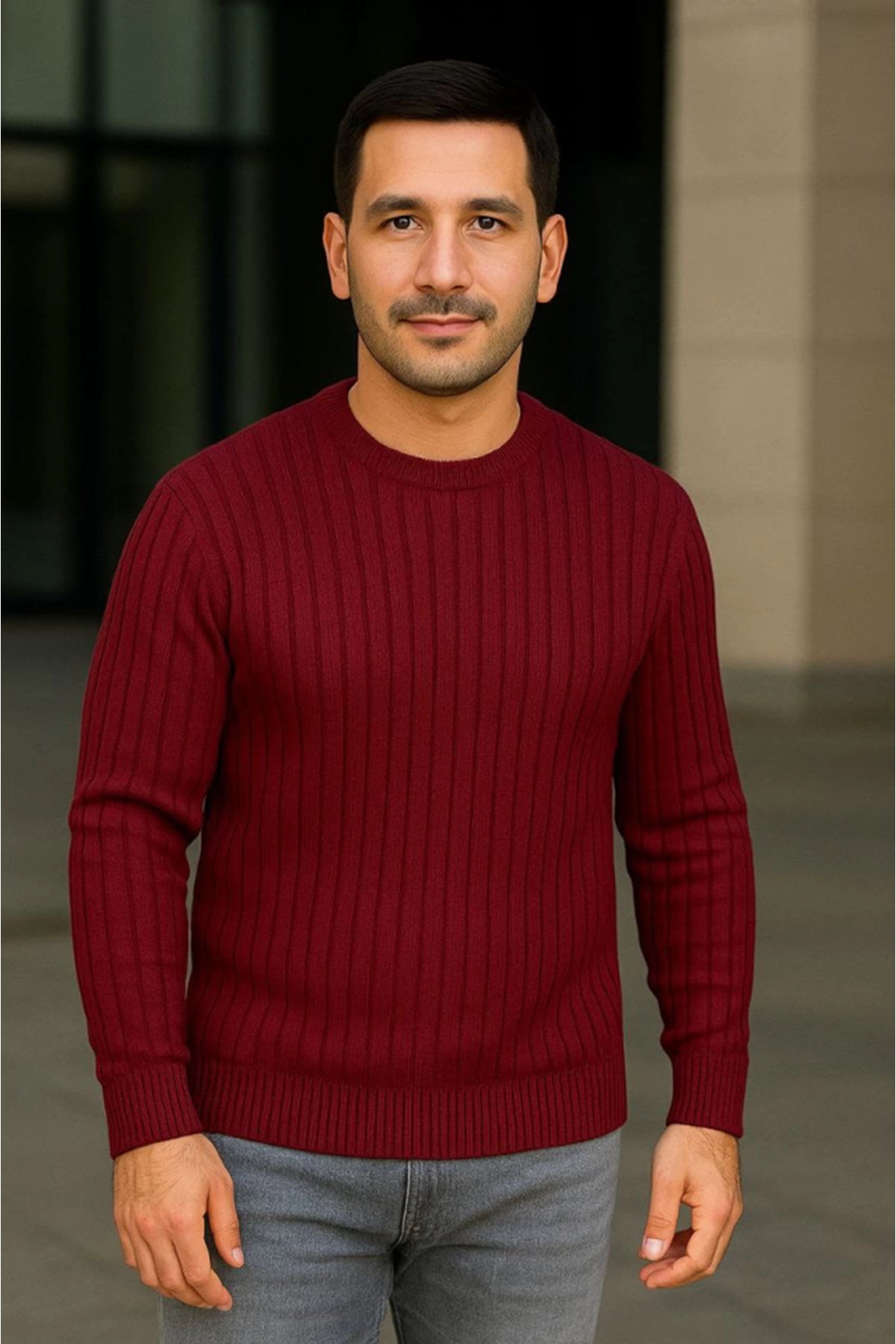 Erkek Bisiklet Yuvarlak Yaka Triko Kazak Pamuklu Kalın Fitilli Dokuma, Regular Fit Uzun Kollu Kışlık Model - Bordo