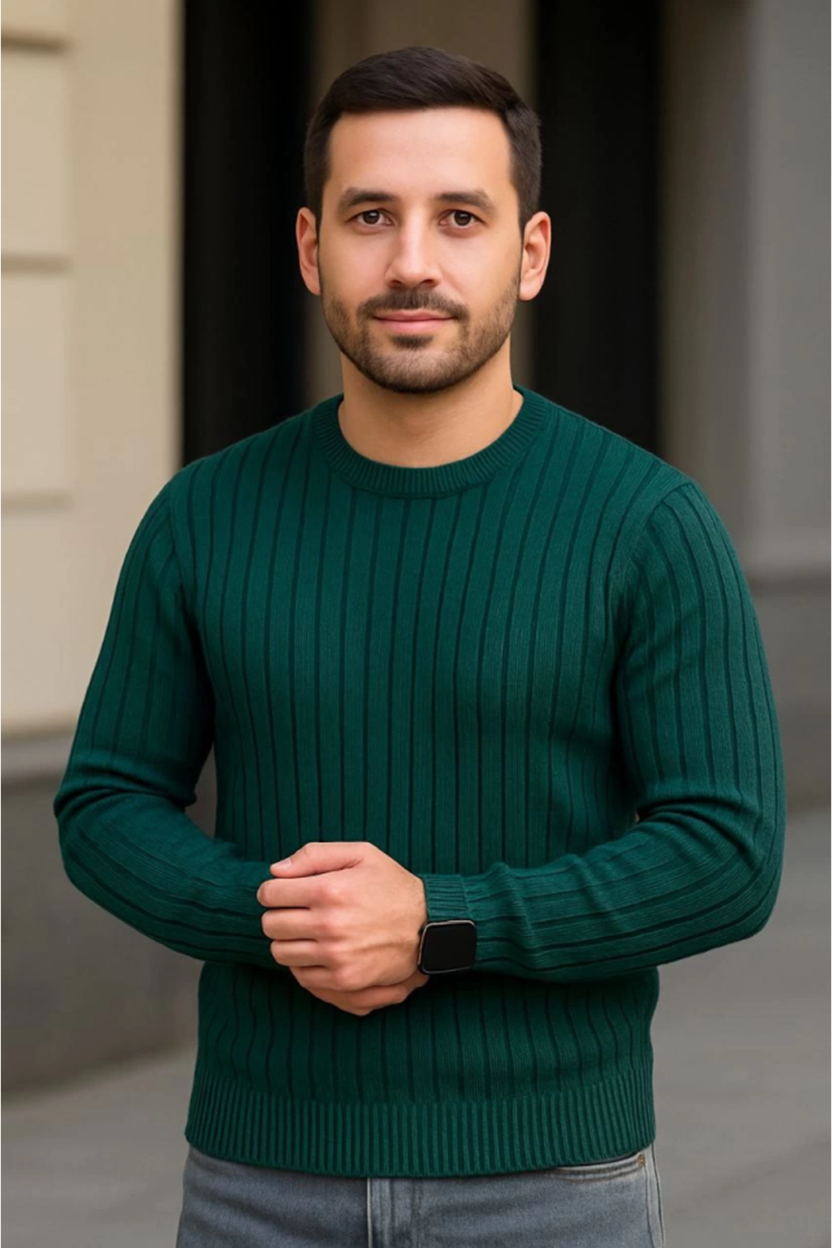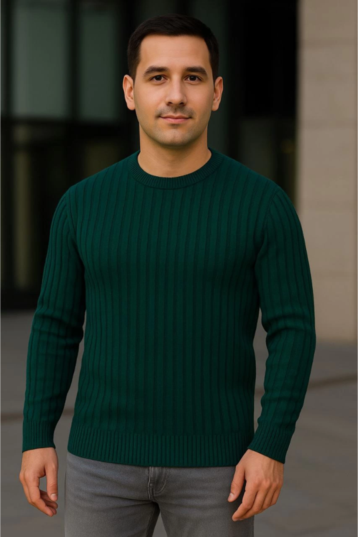 Erkek Bisiklet Yuvarlak Yaka Triko Kazak Pamuklu Kalın Fitilli Dokuma, Regular Fit Uzun Kollu Kışlık Model - Haki