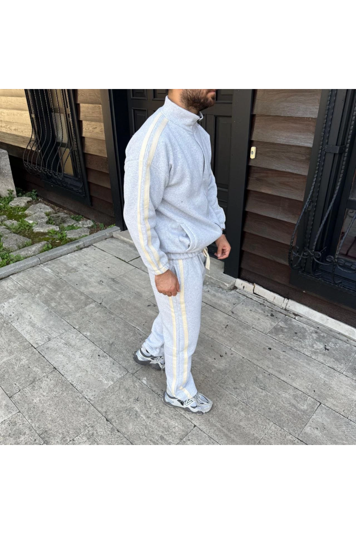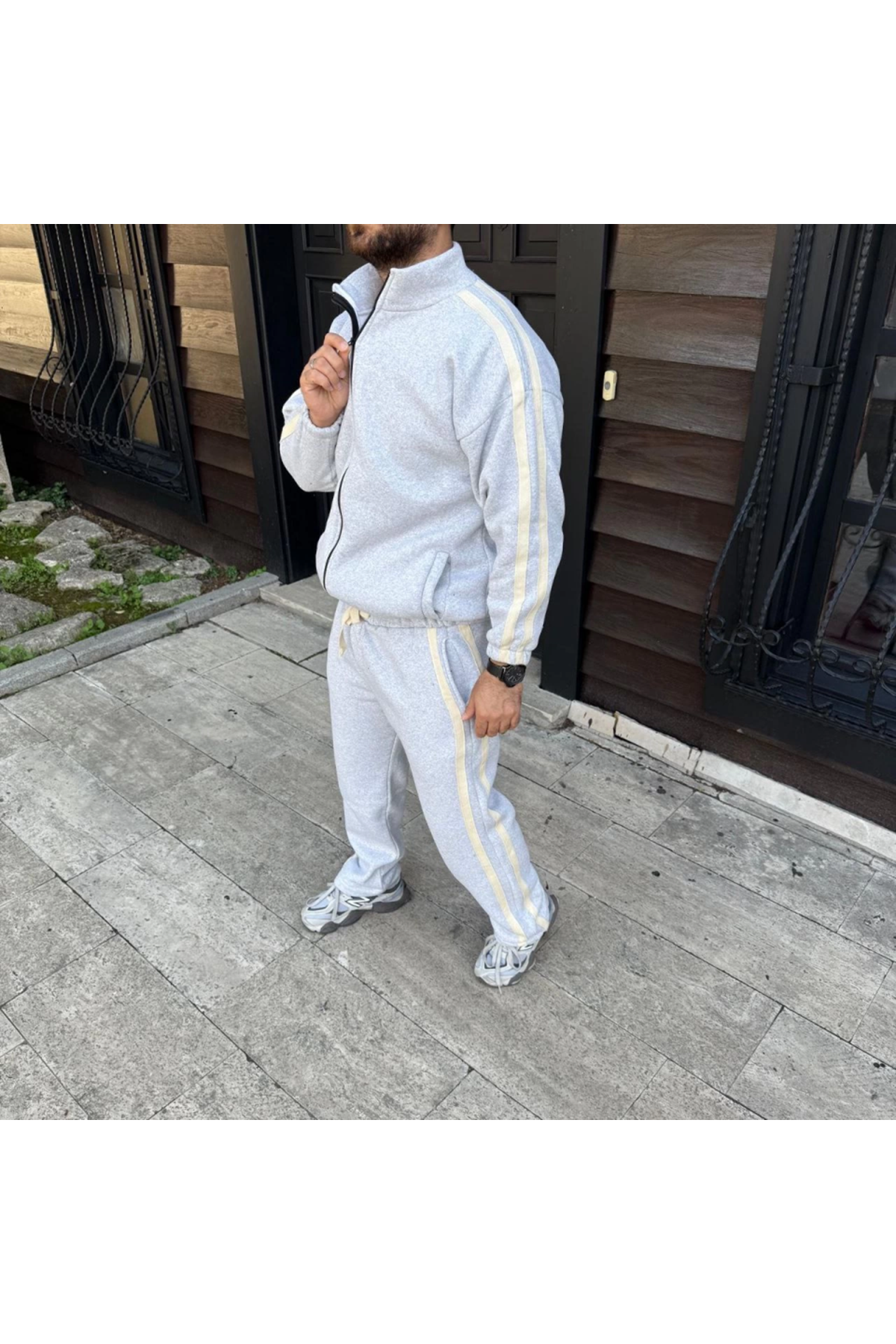 Erkek Çift Şeritli Eşofman Takım Dik Yaka Fermuarlı Sweatshirt Boru Paça Alt, Oversize 3 Iplik Pamuklu - Gri