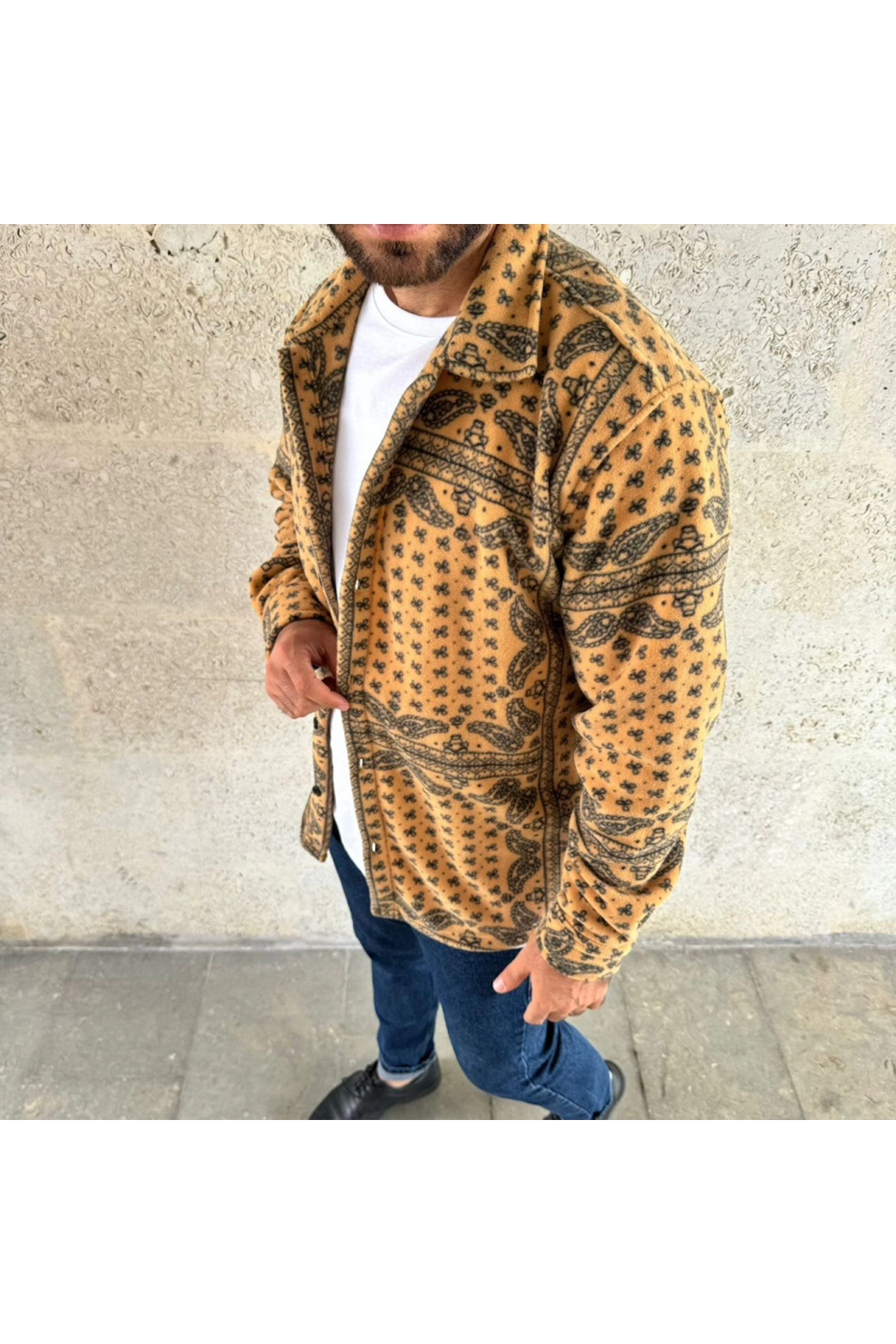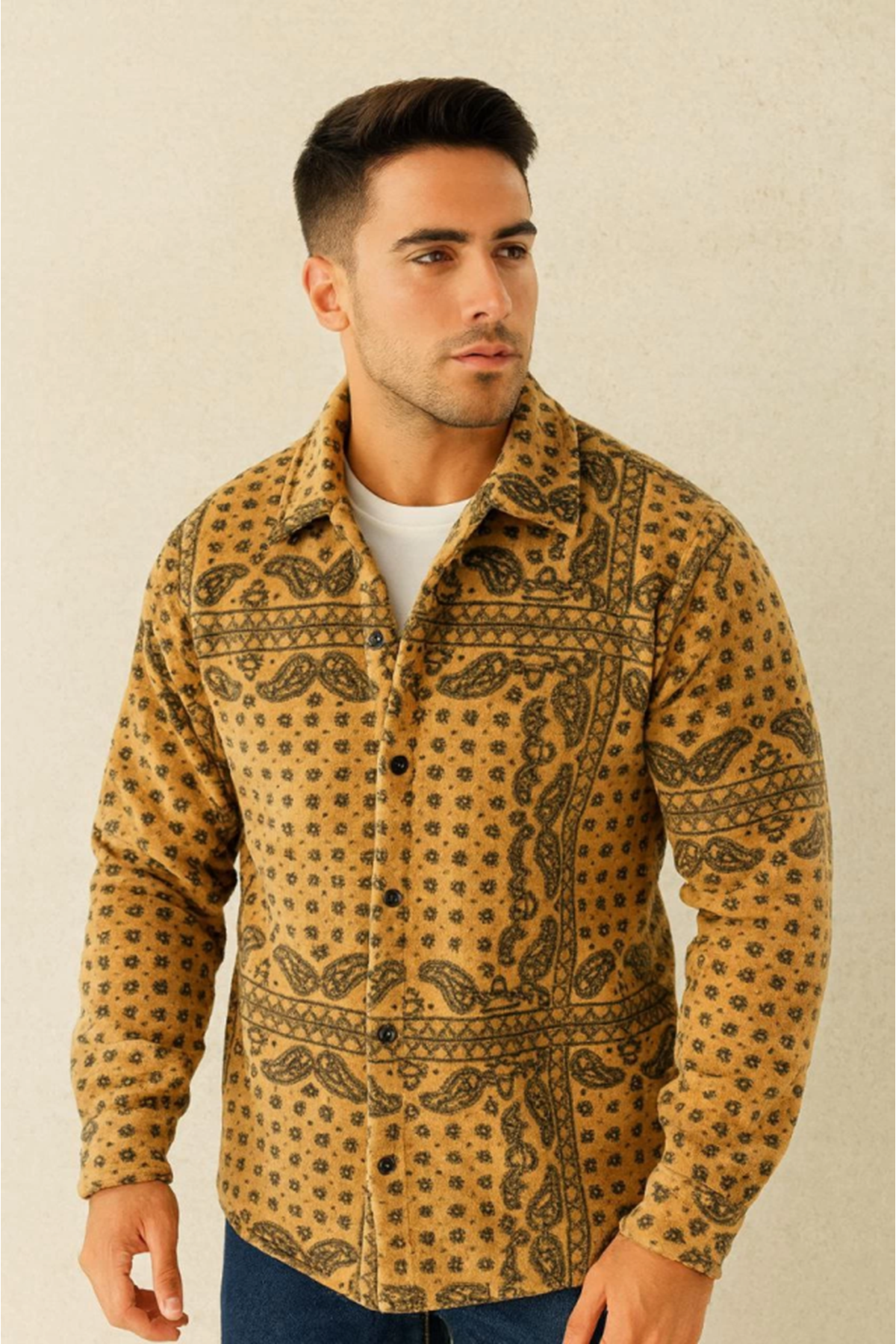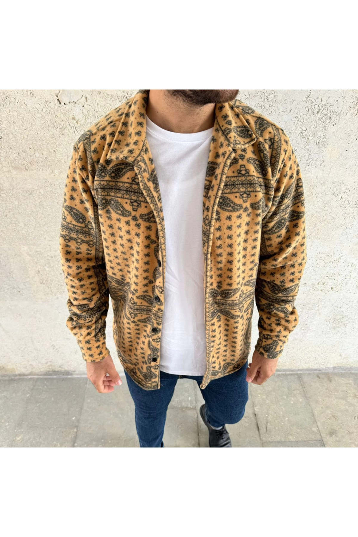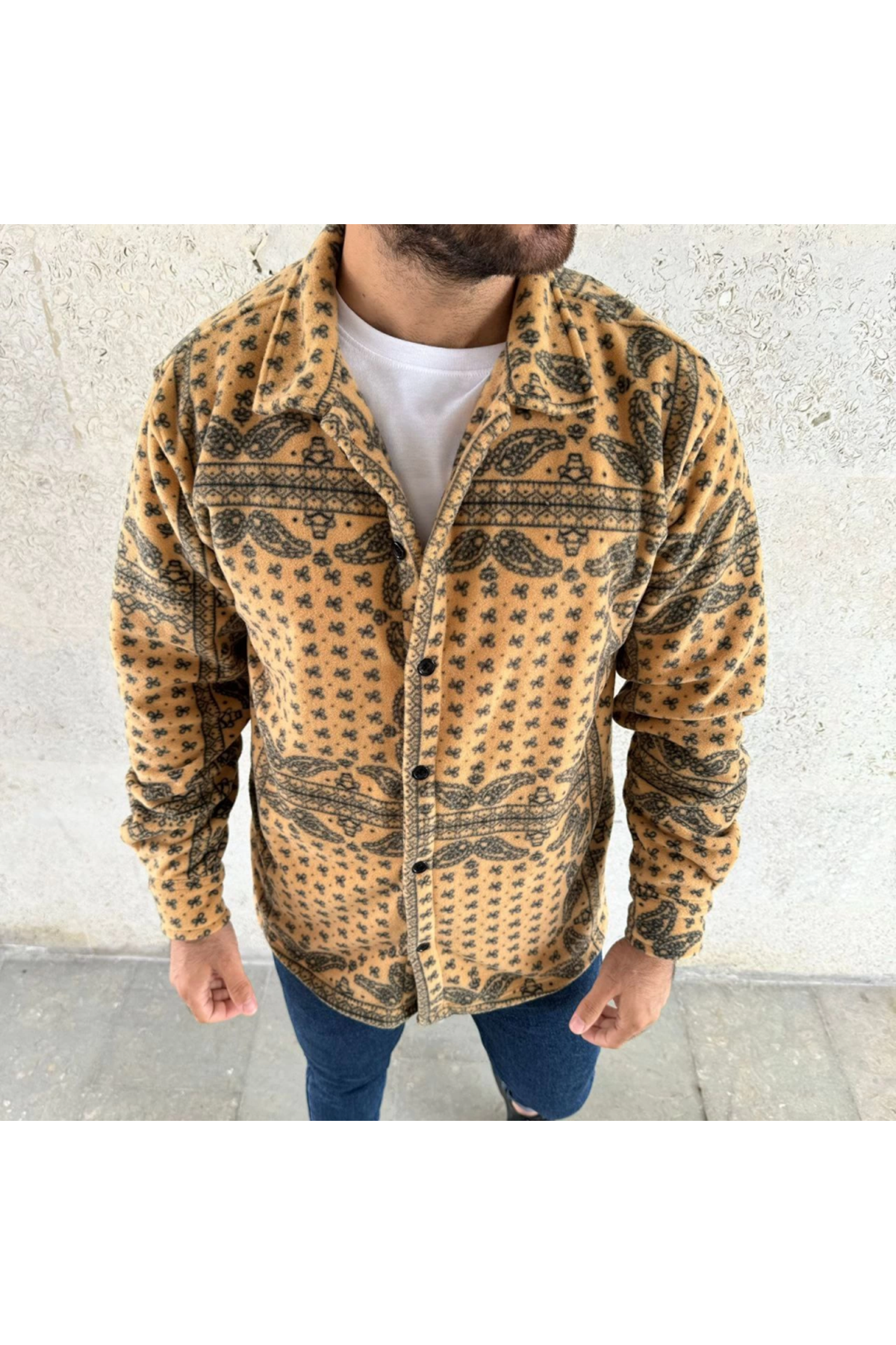 Erkek Desenli Düğmeli Polar Gömlek – Hardal Paisley Desen Yakalı, Uzun Kollu, Oversize Rahat Kalıp - Sarı