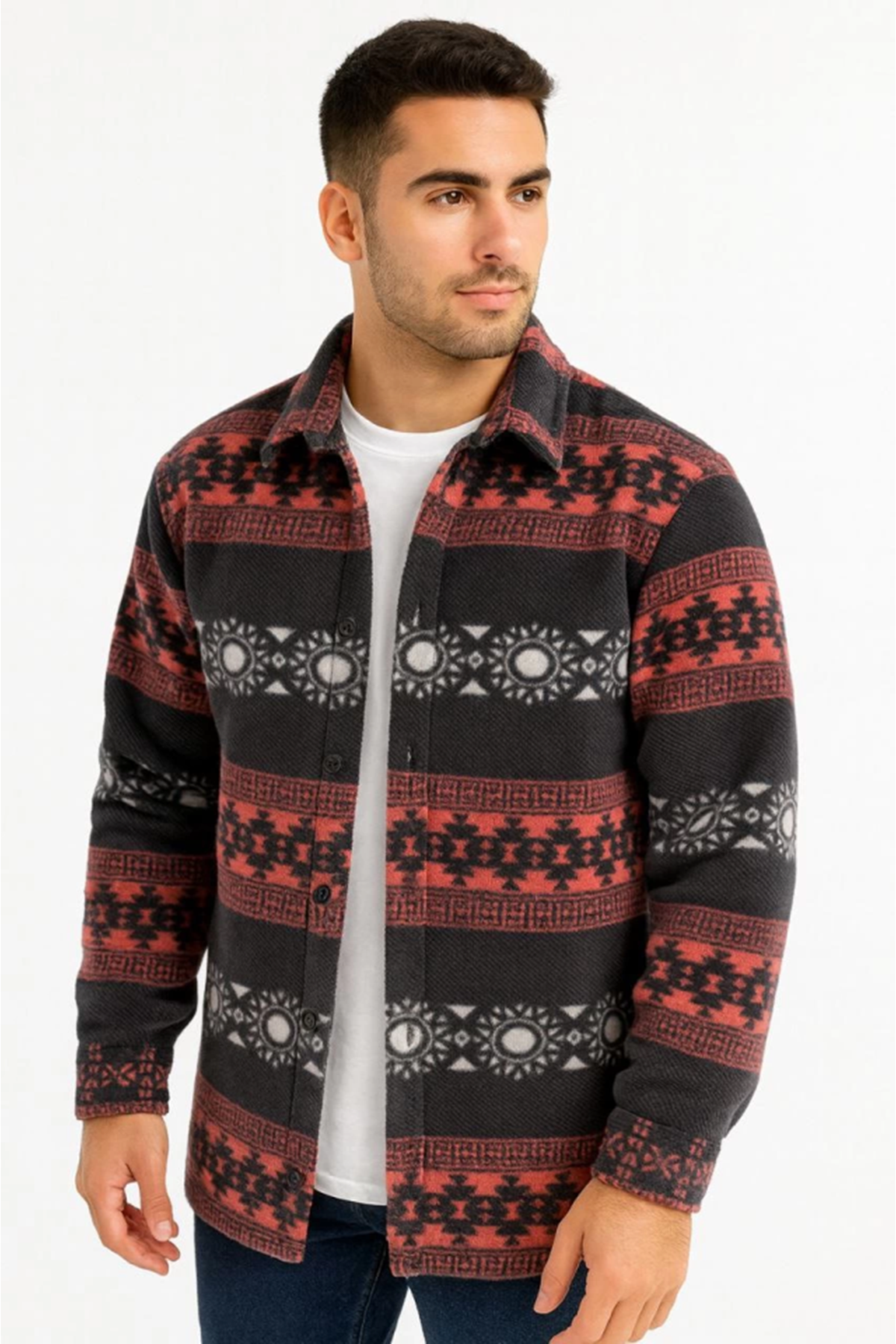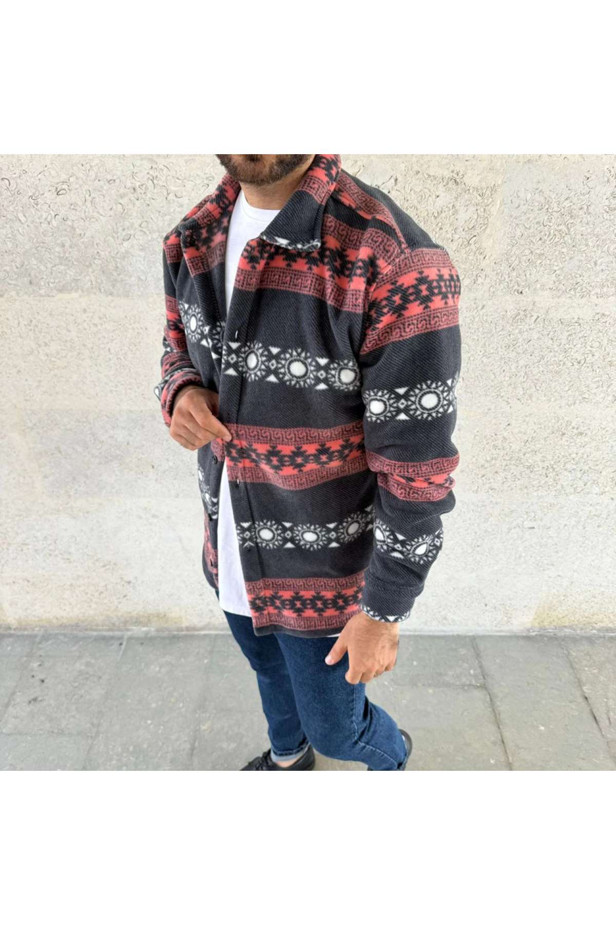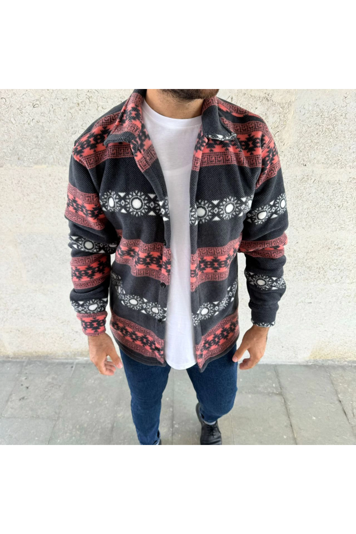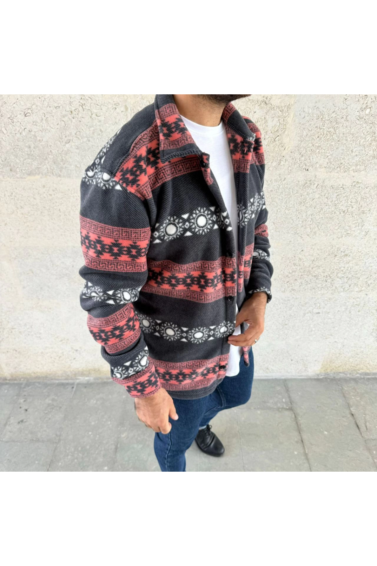 Erkek Desenli Polar Gömlek – Etnik Şerit Desen Yakalı, Uzun Kollu, Düğmeli, Oversize Rahat Kalıp - Füme