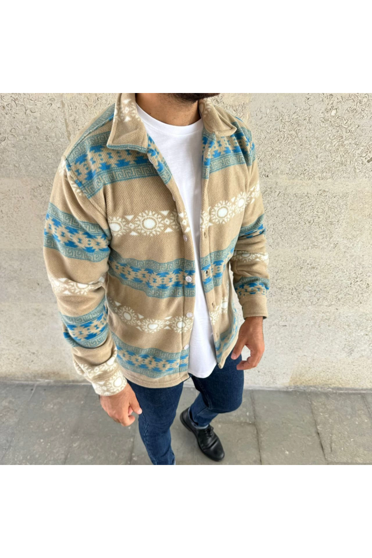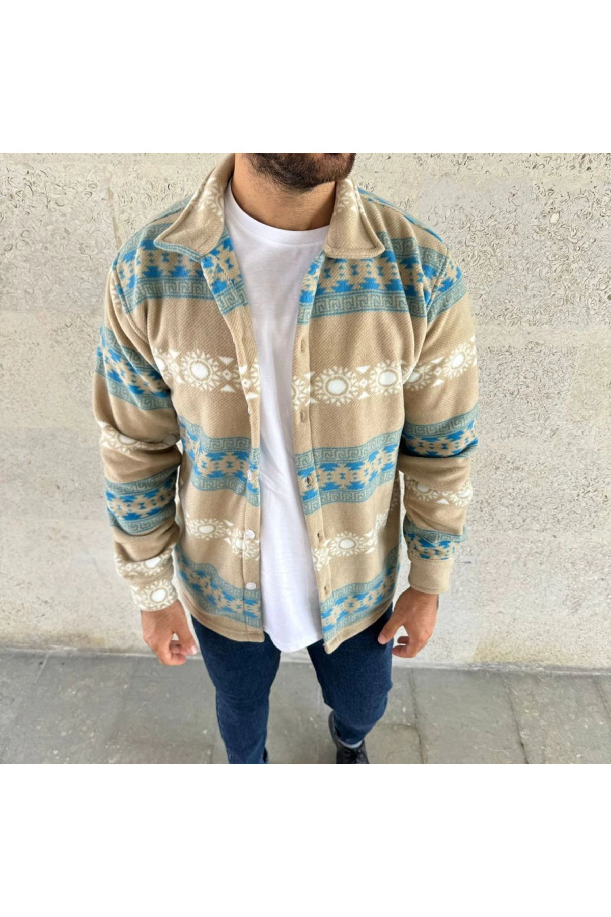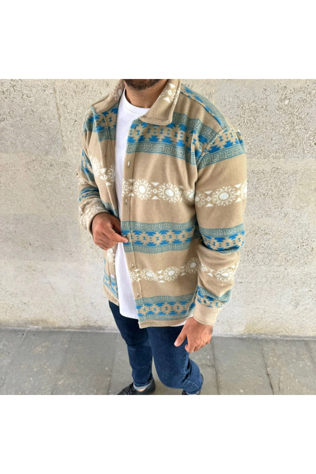Erkek Desenli Polar Gömlek – Etnik Şerit Desen Yakalı, Uzun Kollu, Düğmeli, Oversize Rahat Kalıp - Sarı