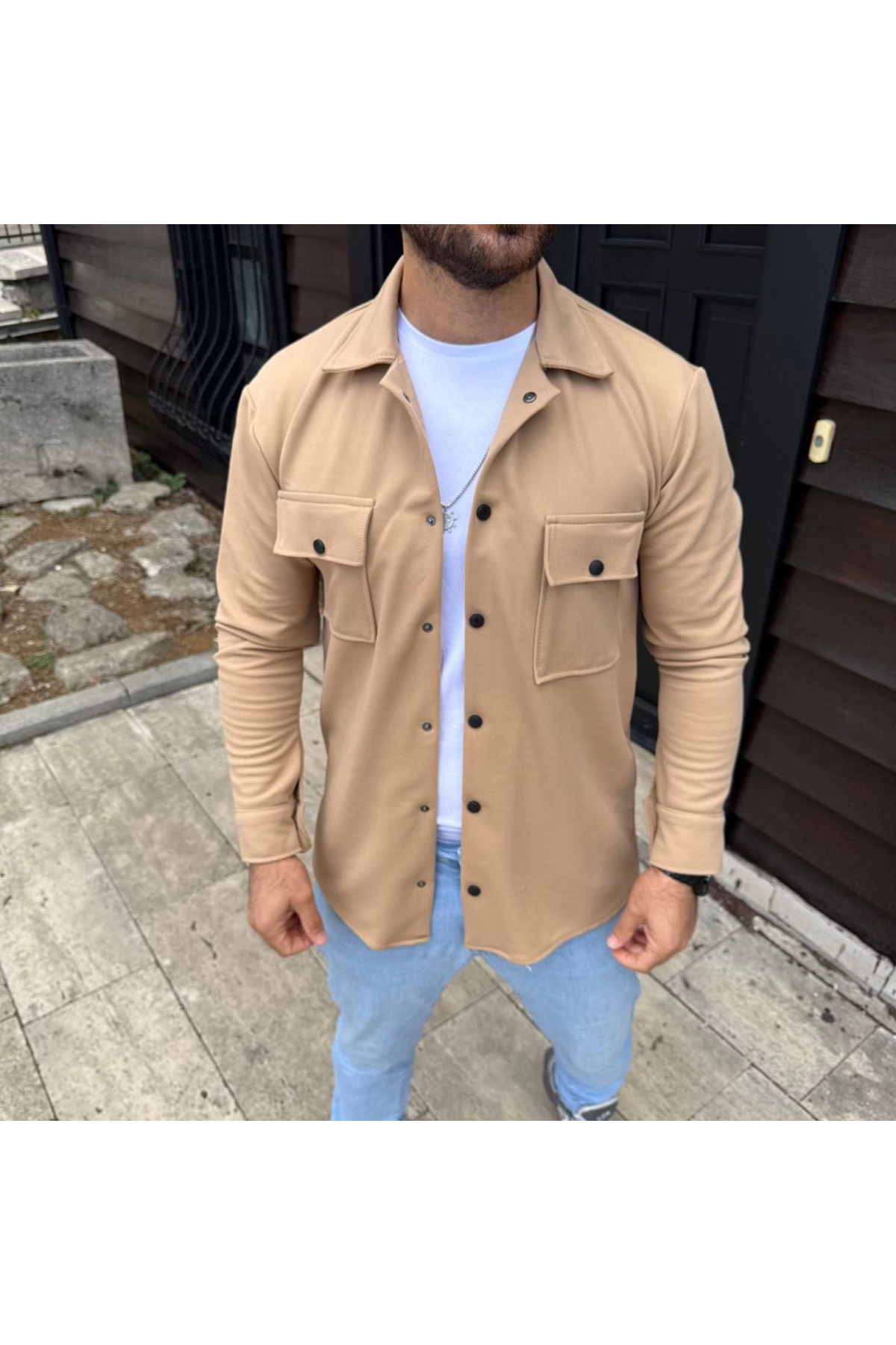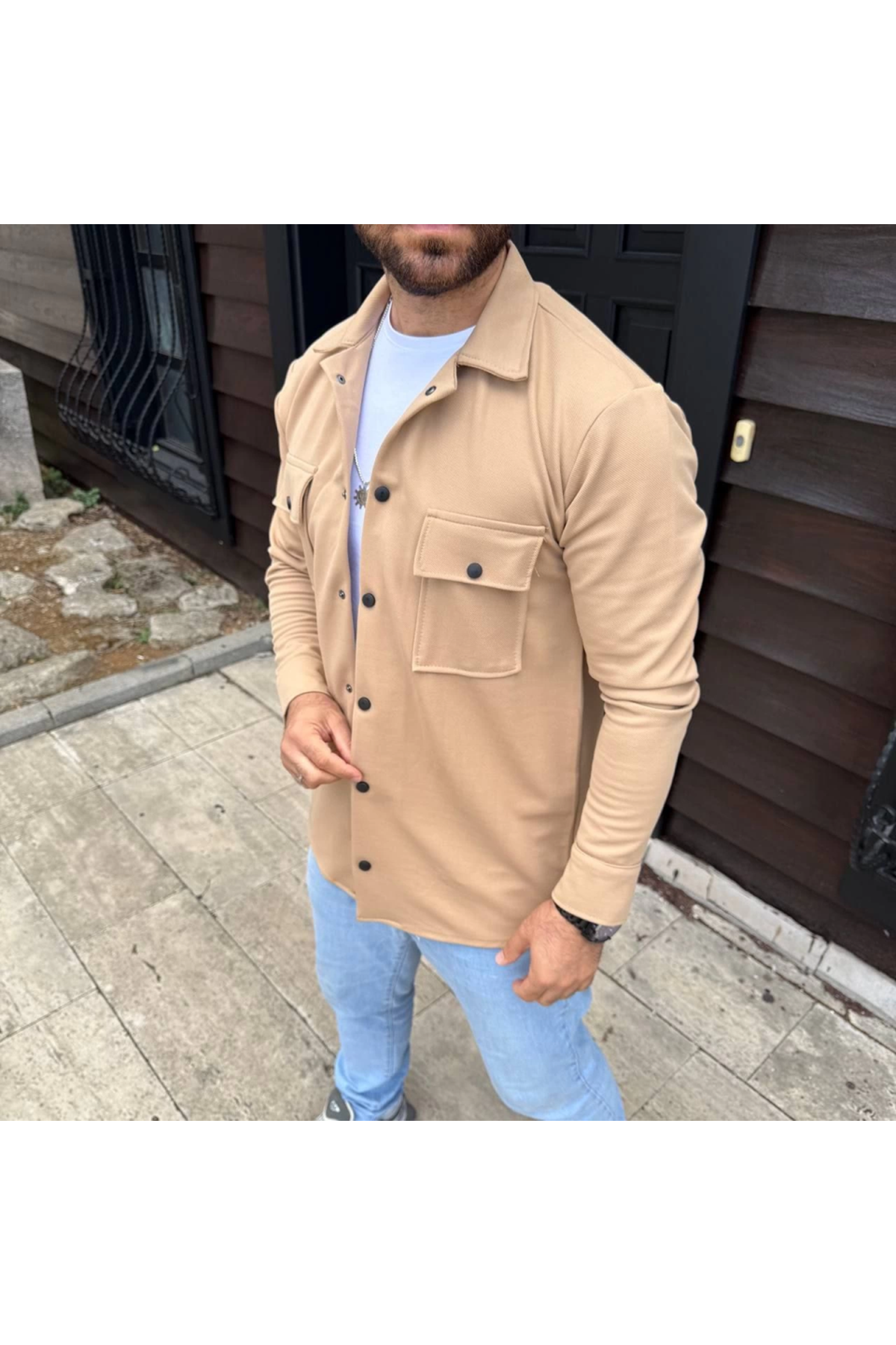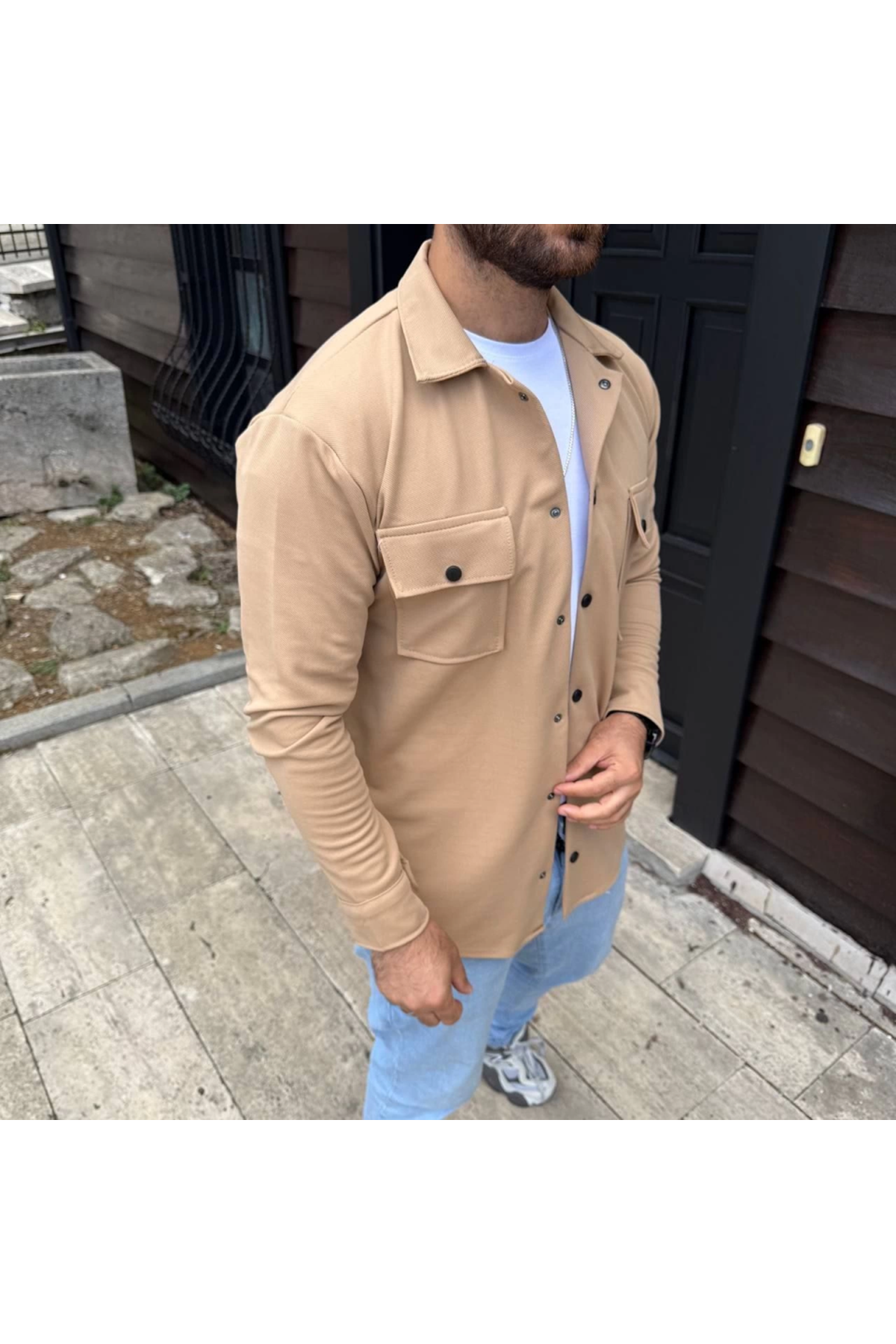 Erkek Diagonal Kumaş Cepli Çıtçıtlı Uzun Kollu, Gömlek Oversize Rahat Kalıp Günlük Şık Stil - Bej
