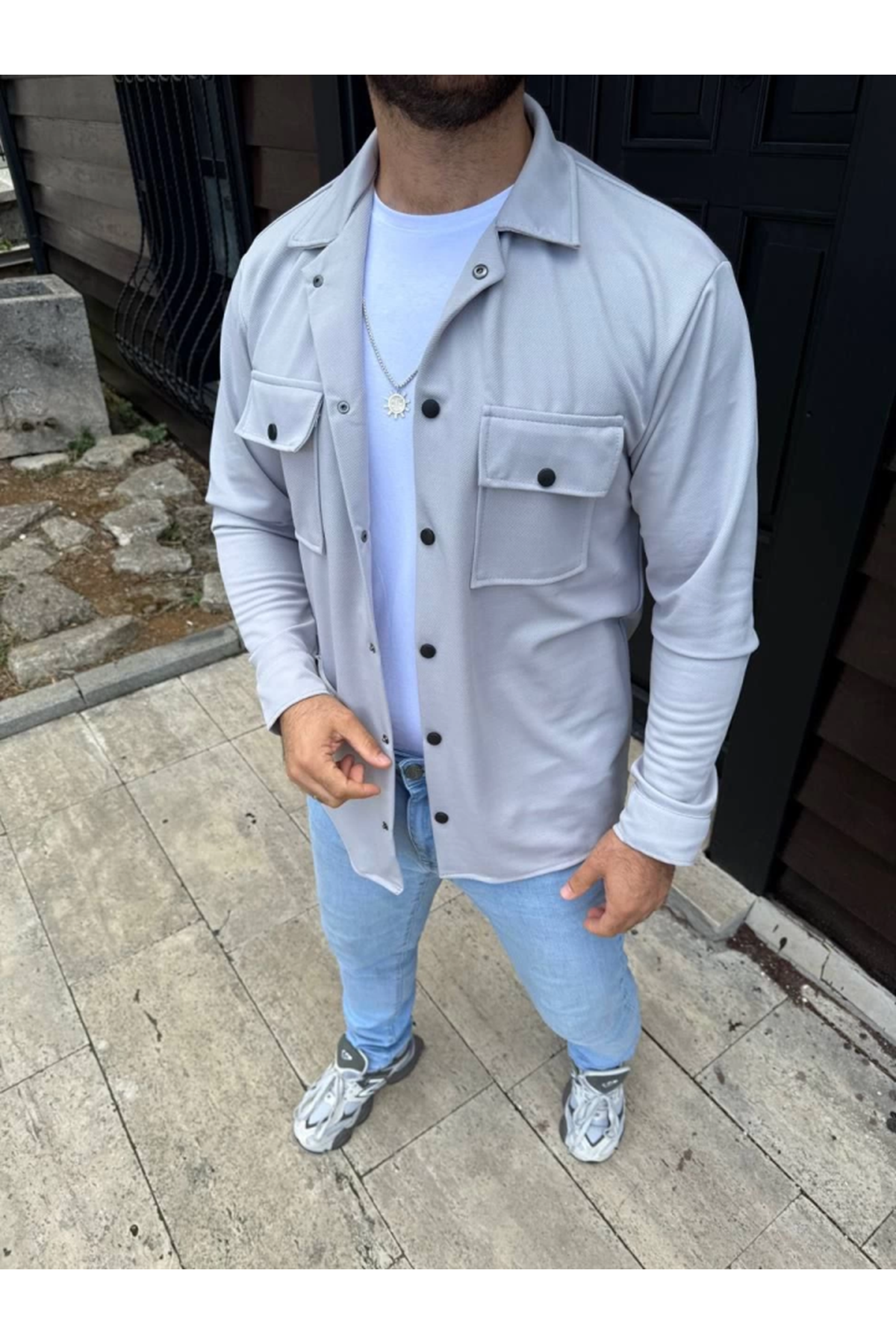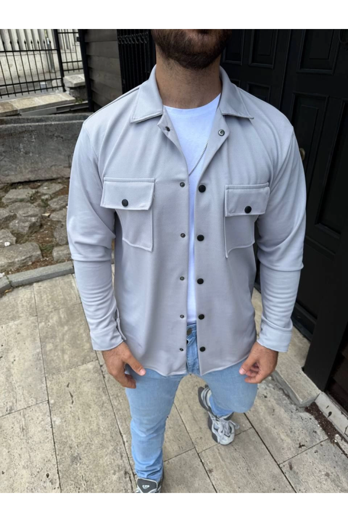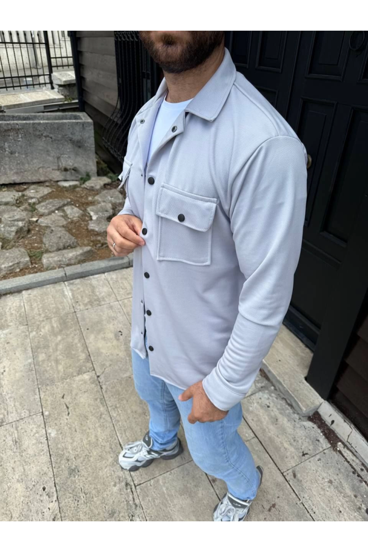 Erkek Diagonal Kumaş Cepli Çıtçıtlı Uzun Kollu, Gömlek Oversize Rahat Kalıp Günlük Şık Stil - Gri