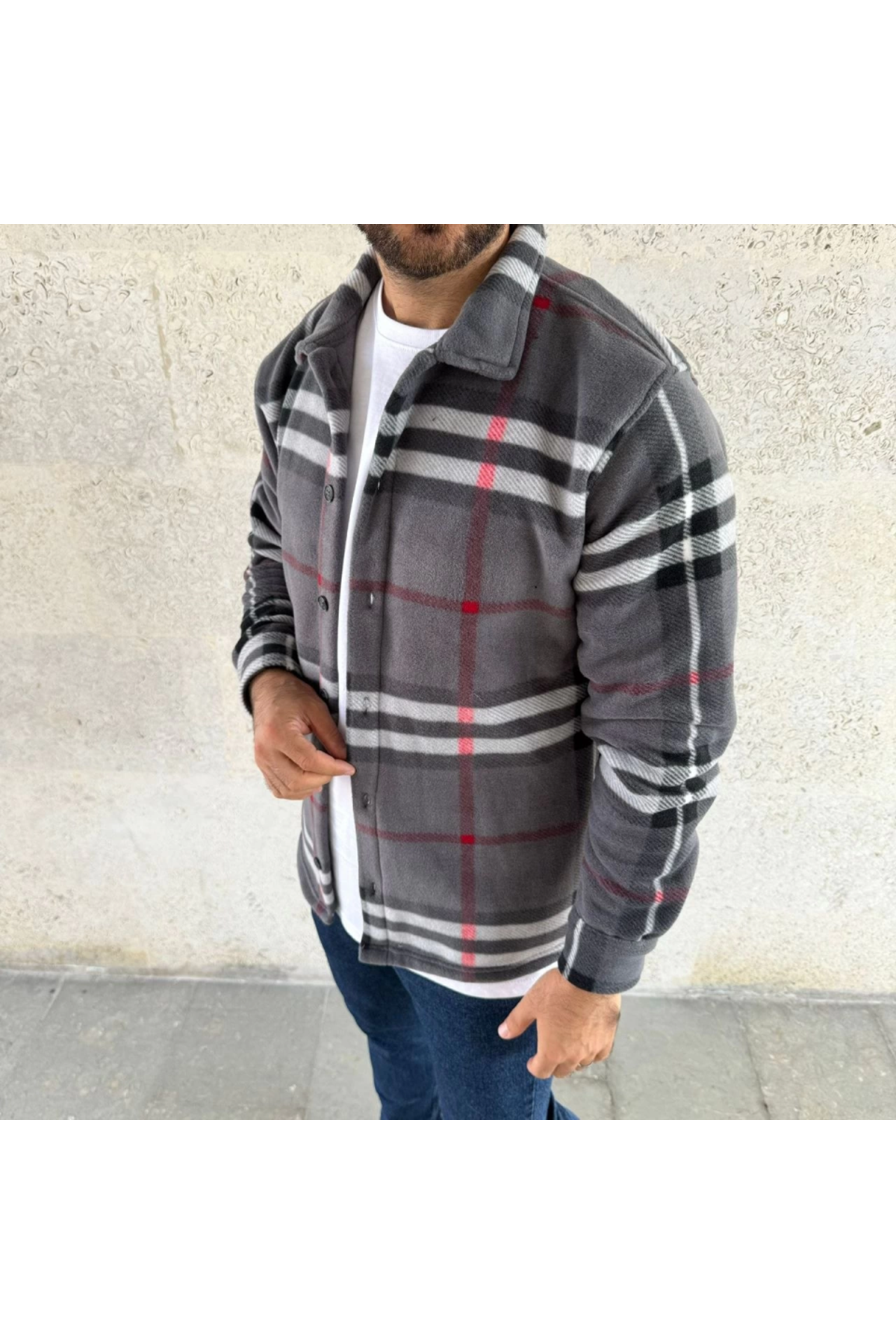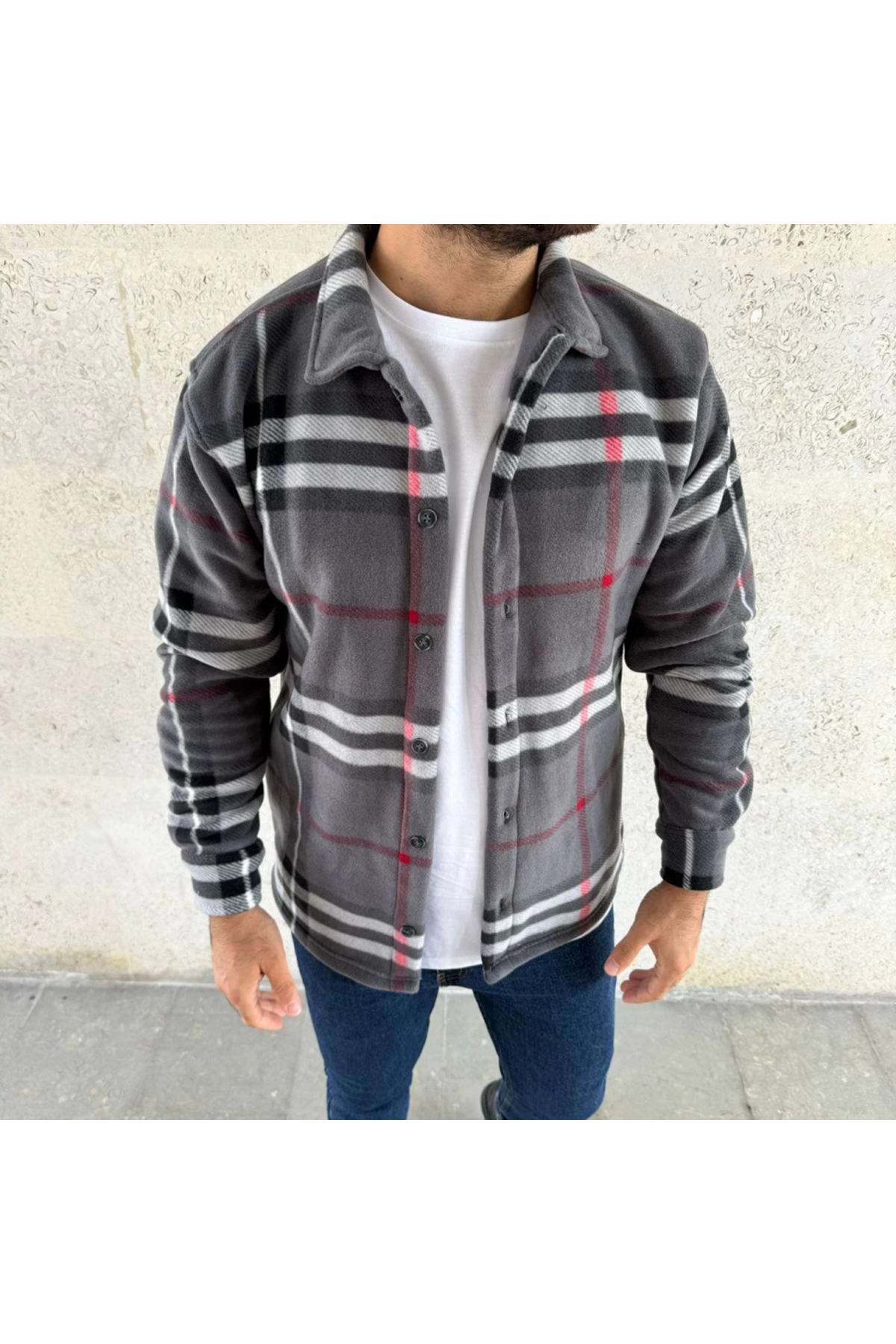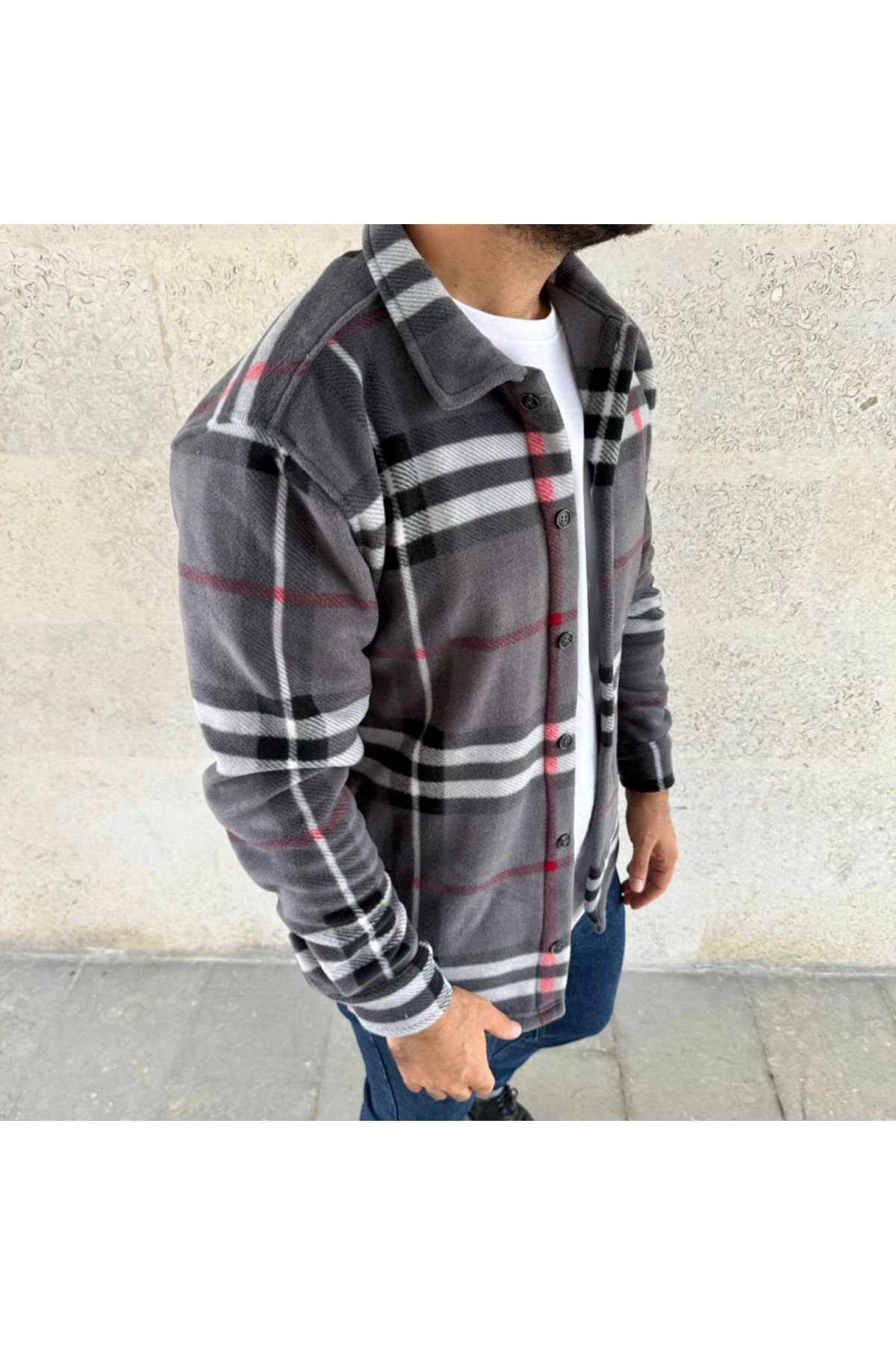 Erkek Ekose Desenli Düğmeli Polar Yakalı Uzun Kollu Gömlek Oversize Rahat Kalıp - Füme