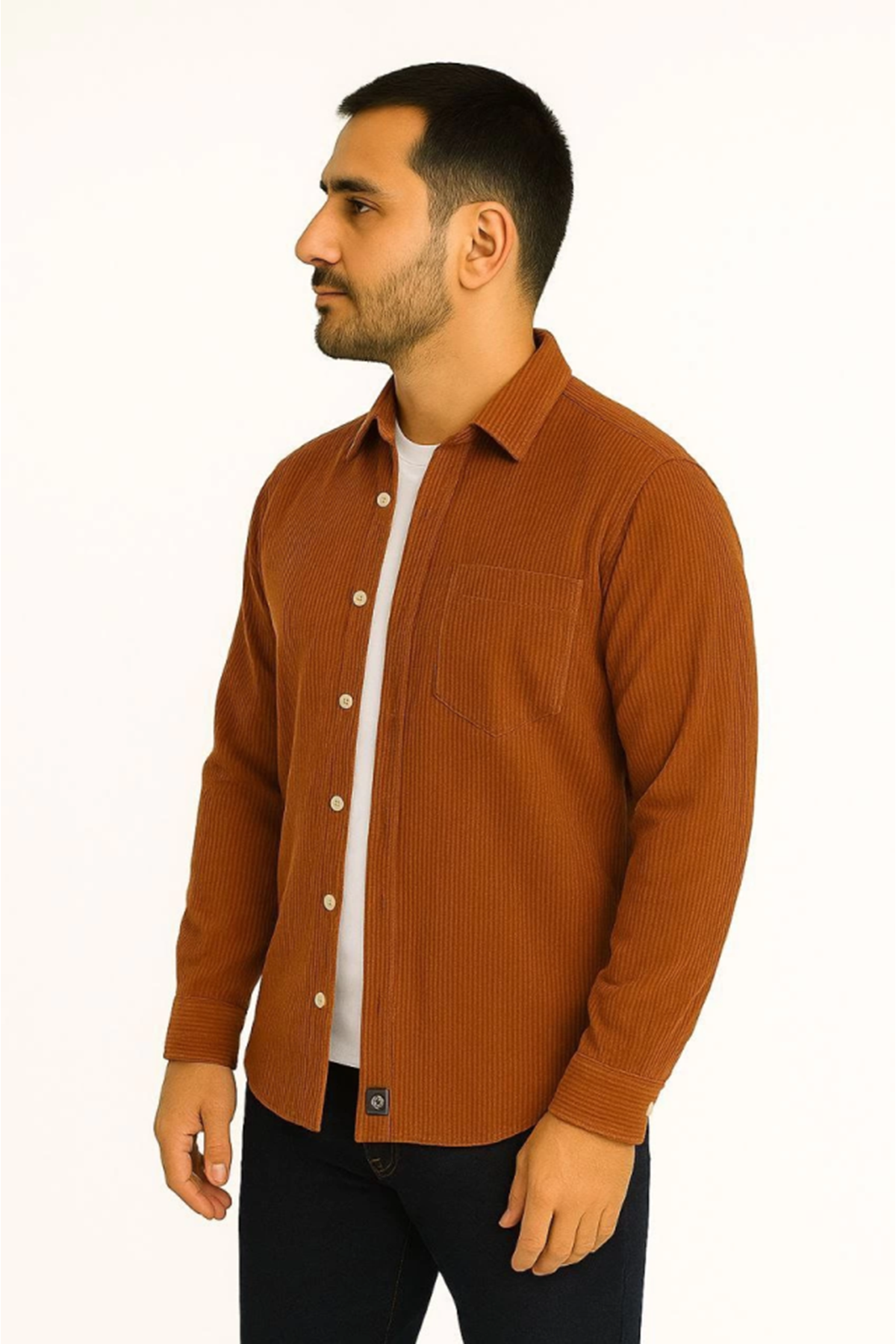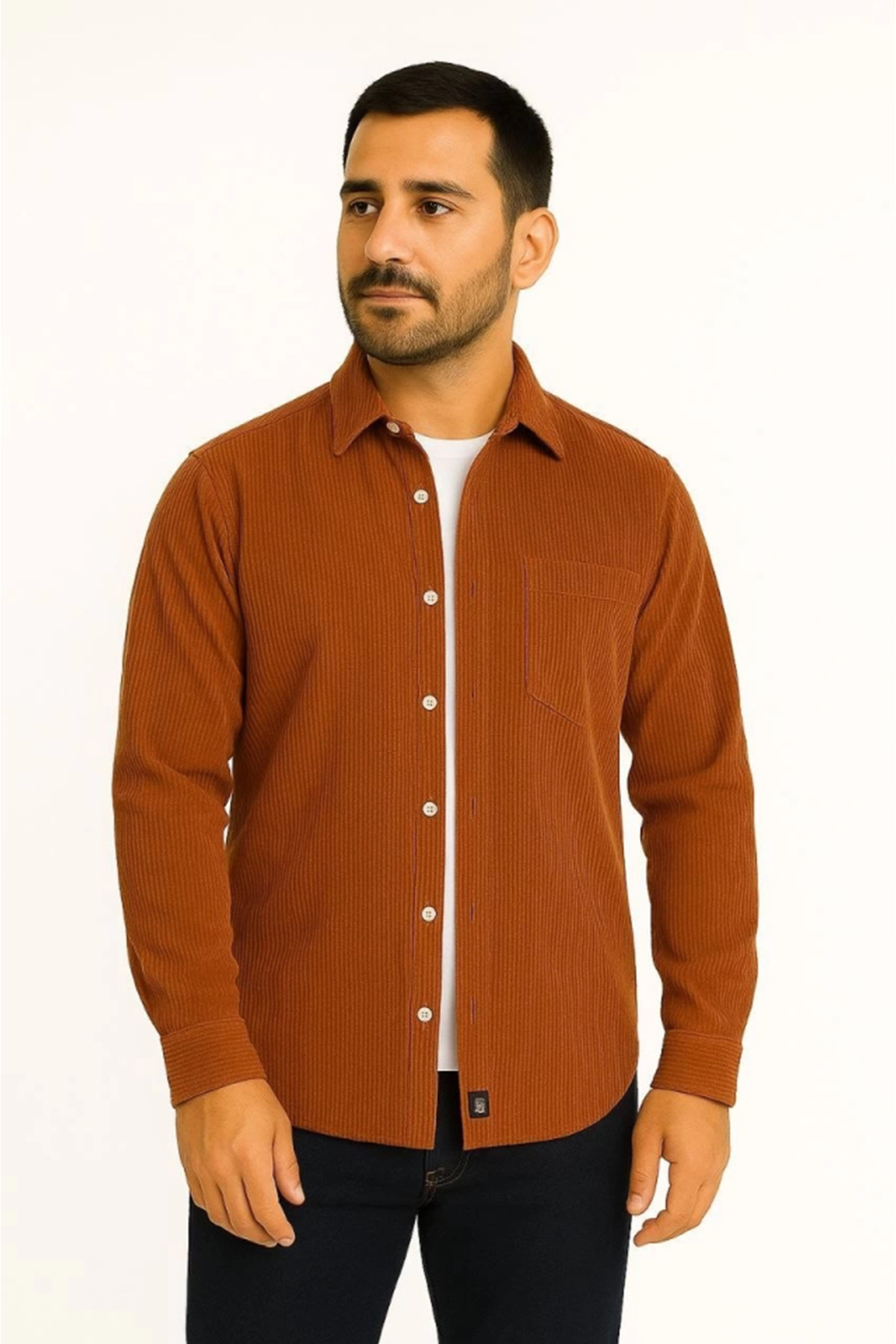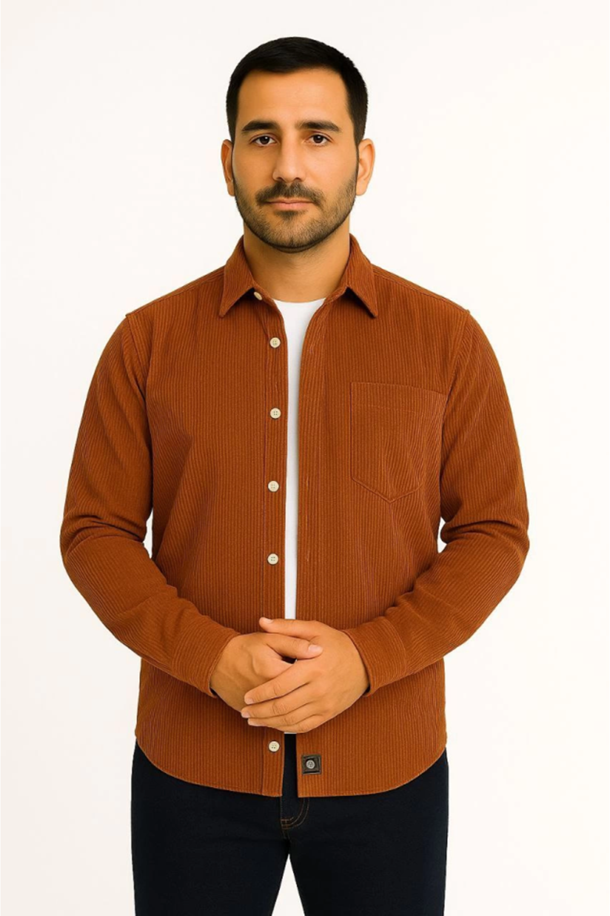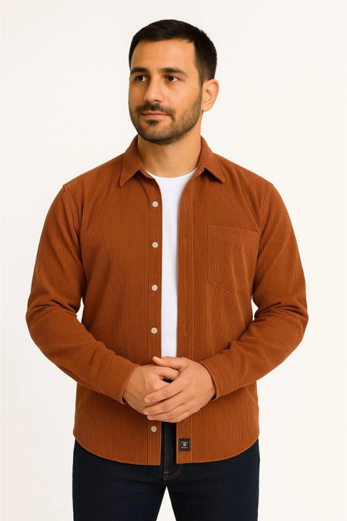 Erkek Fitilli Kadife Cepli Gömlek Oversize Rahat Kalıp - Kahverengi