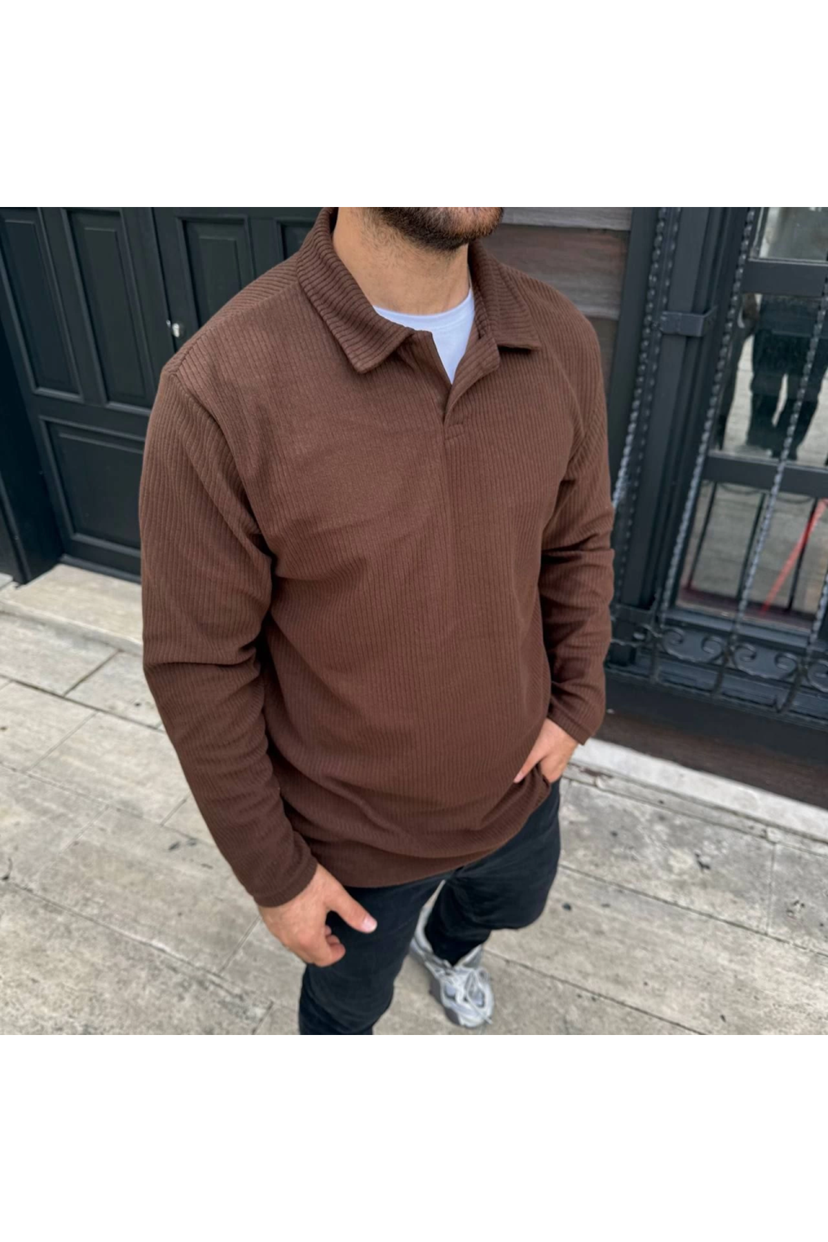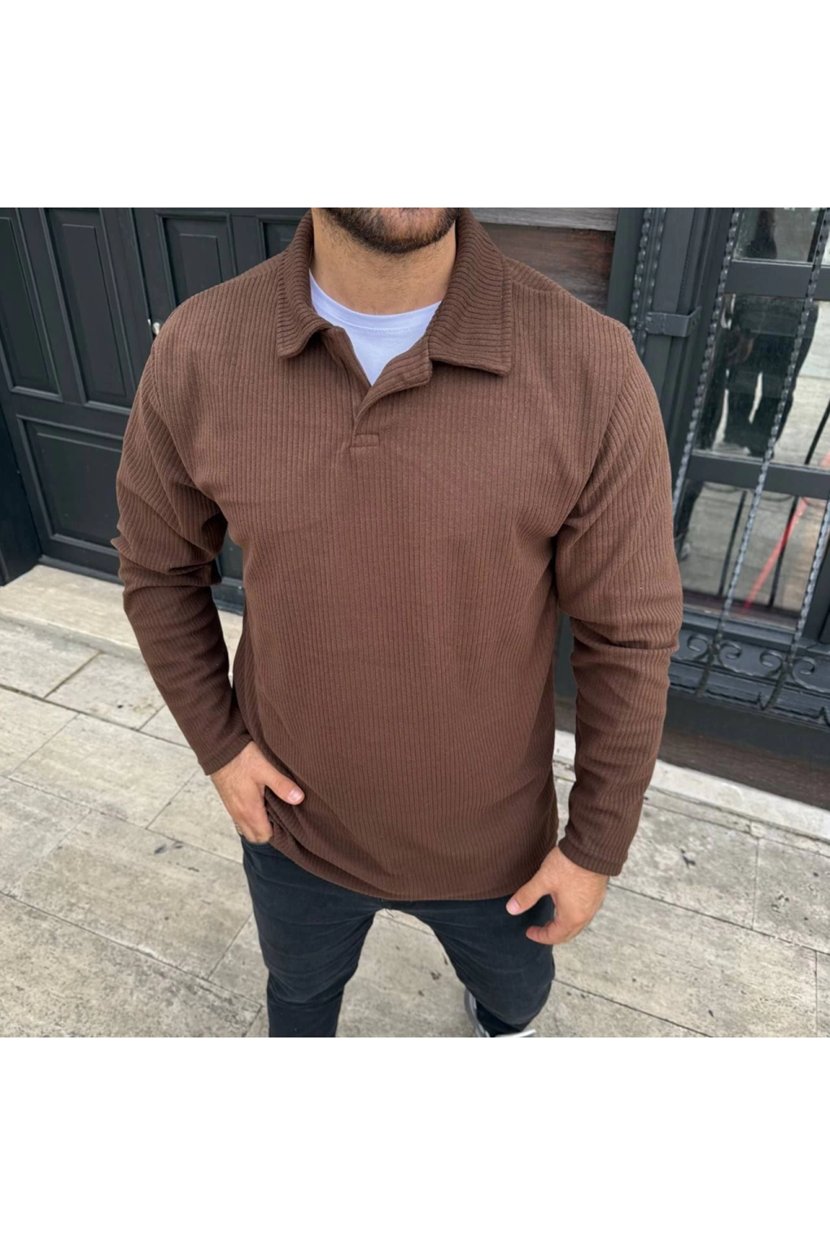 Erkek Fitilli Polar Sweatshirt – Düğmesiz Polo Yaka, Oversize Rahat Kalıp, Kalın Polar Kumaş, Kışlık Ve Baharlık Şık Günlük Üst - Kahverengi