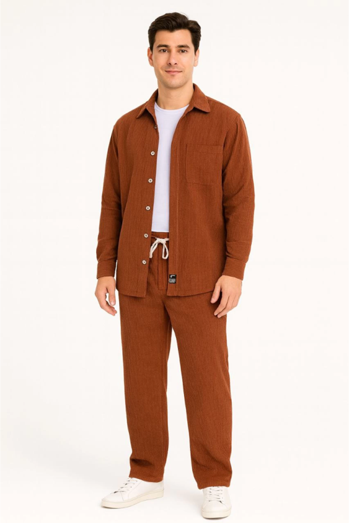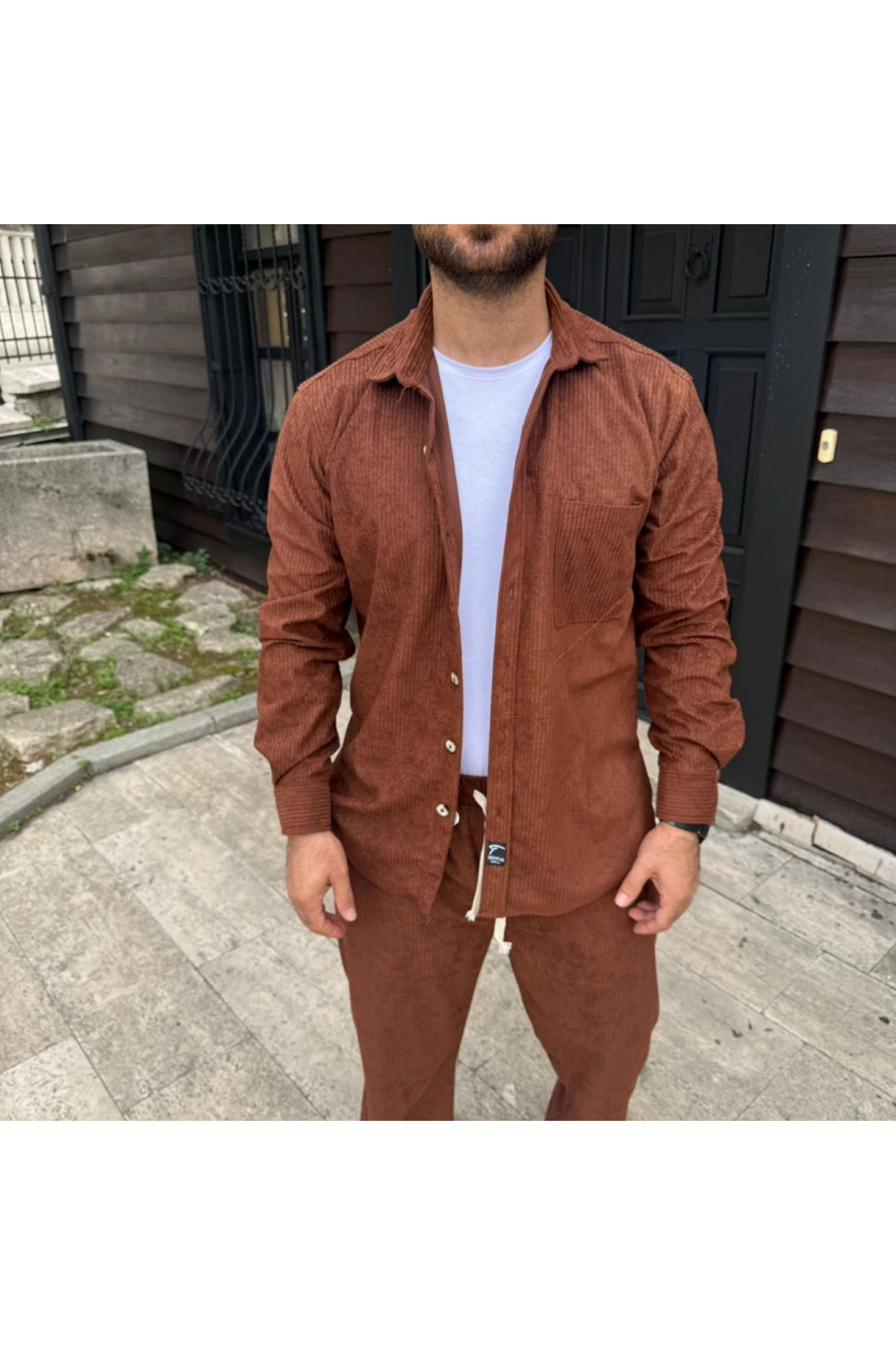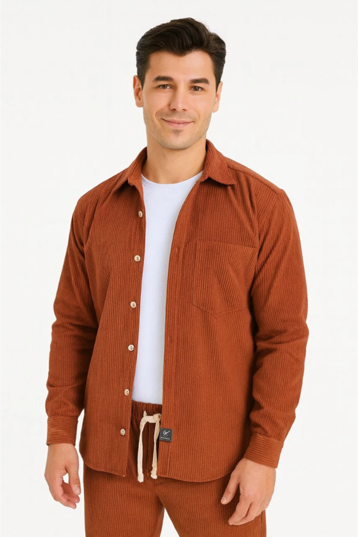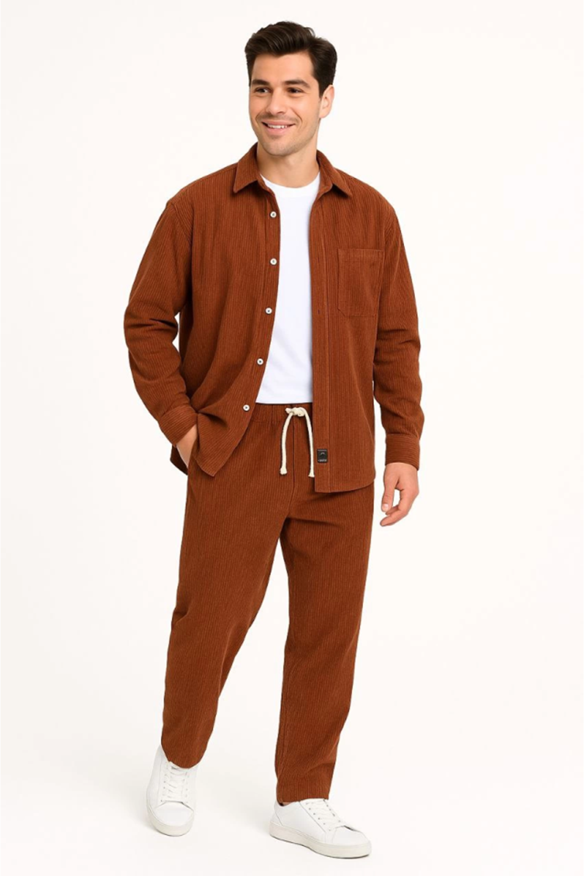 Erkek Kadife Oversize Takım – Gömlek Ve Pantolon İkili Set Füme Corduroy Şıklığı, Rahat Ve Zarif Duruş Yumuşak Dokulu Kadife Kumaş, Düğmeli Gömlek Üst Ve Lastikli Pantolon Alt Parça Ile Gün Boyu Konfor- Kiremit