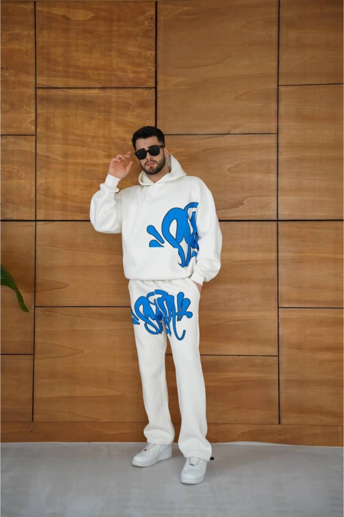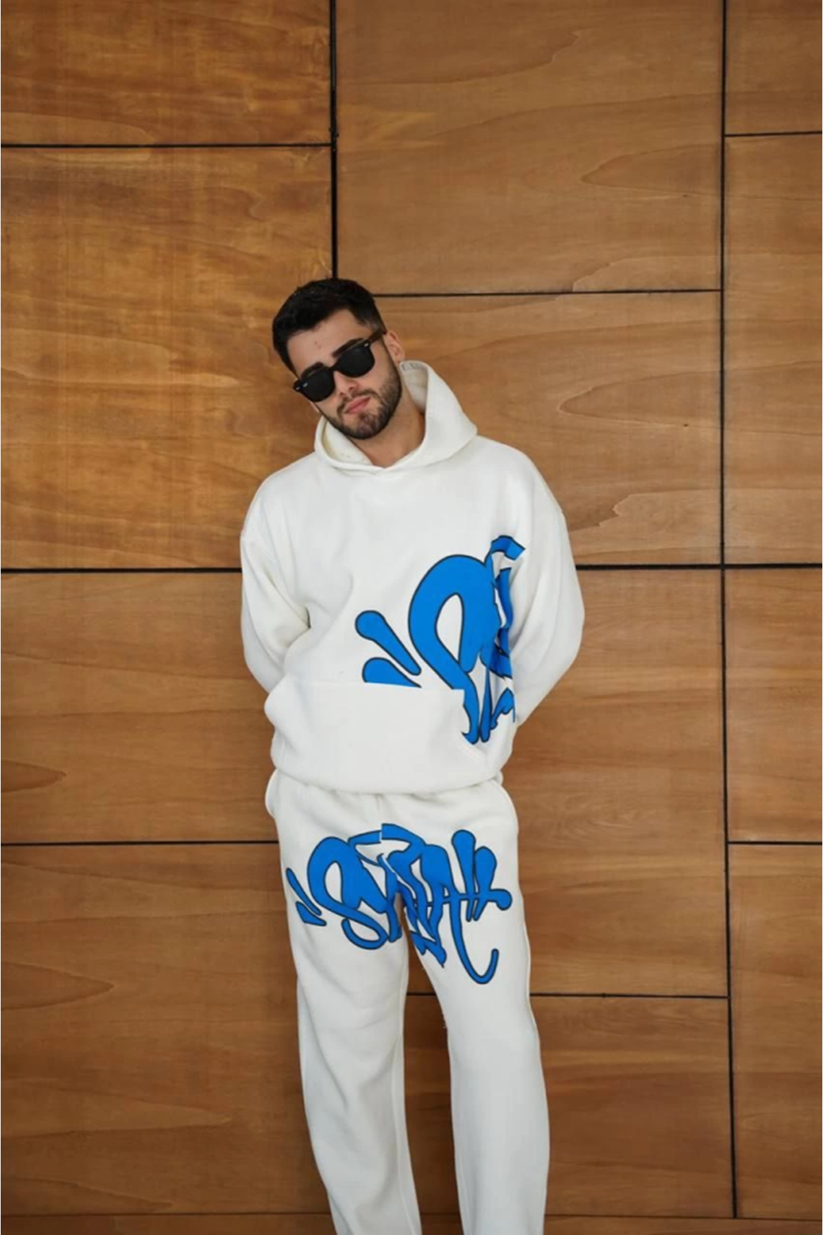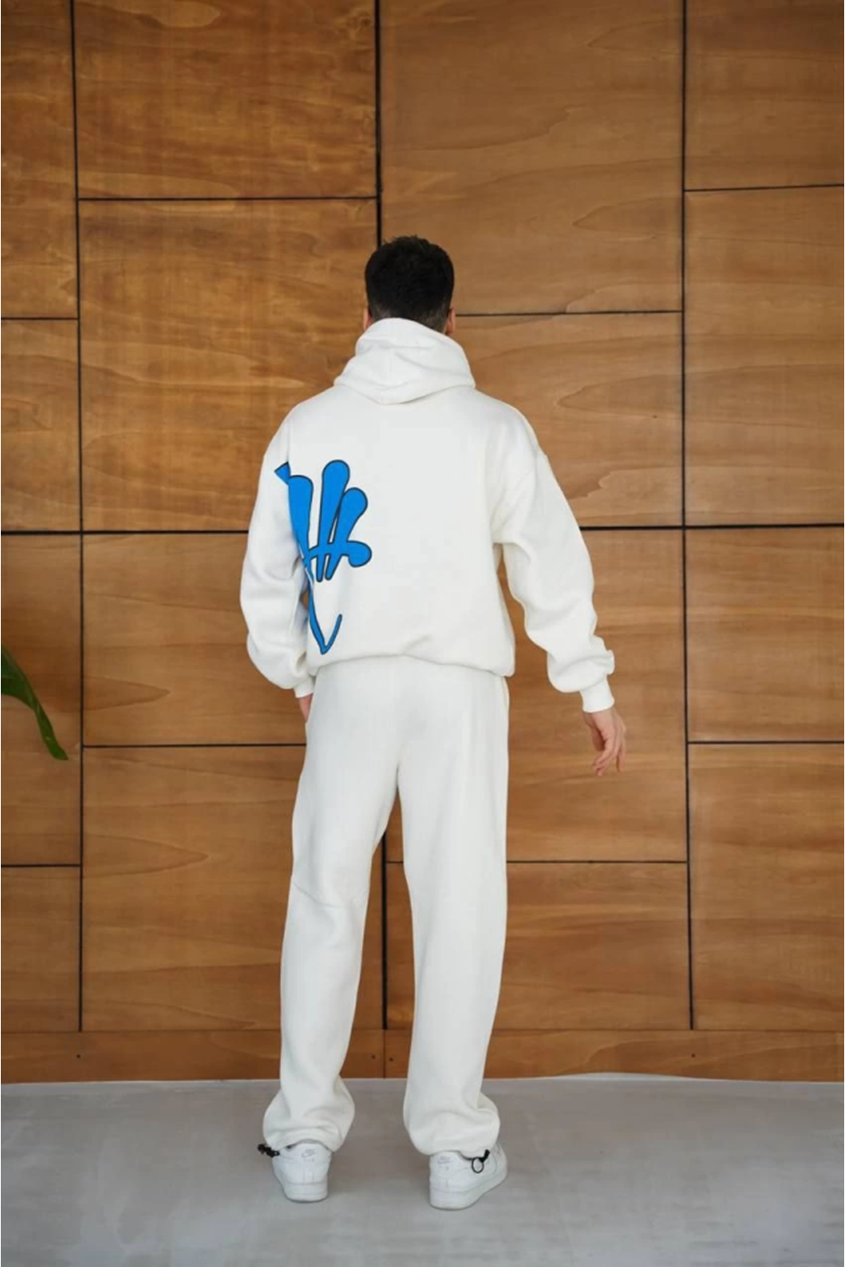 Erkek Kapüşonlu Eşofman Takım Graffiti Baskılı Oversize Rahat Kalıp, Kanguru Cepli, Streetwear Tarzında Premium Ürün 3 Iplik Pamuklu - Beyaz