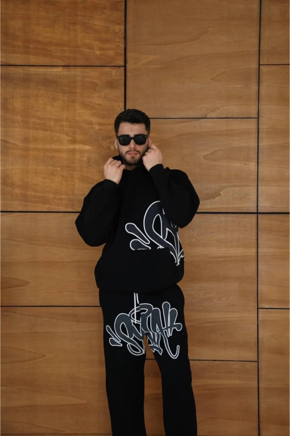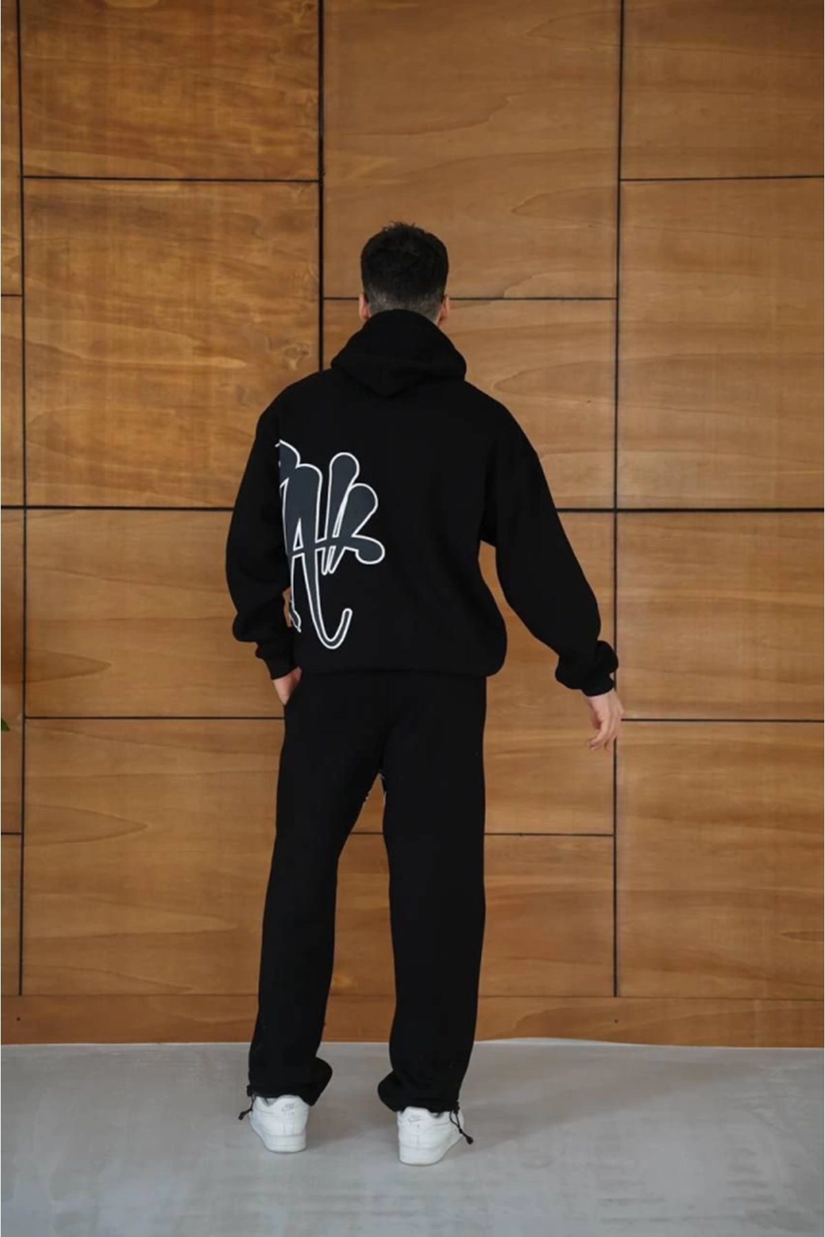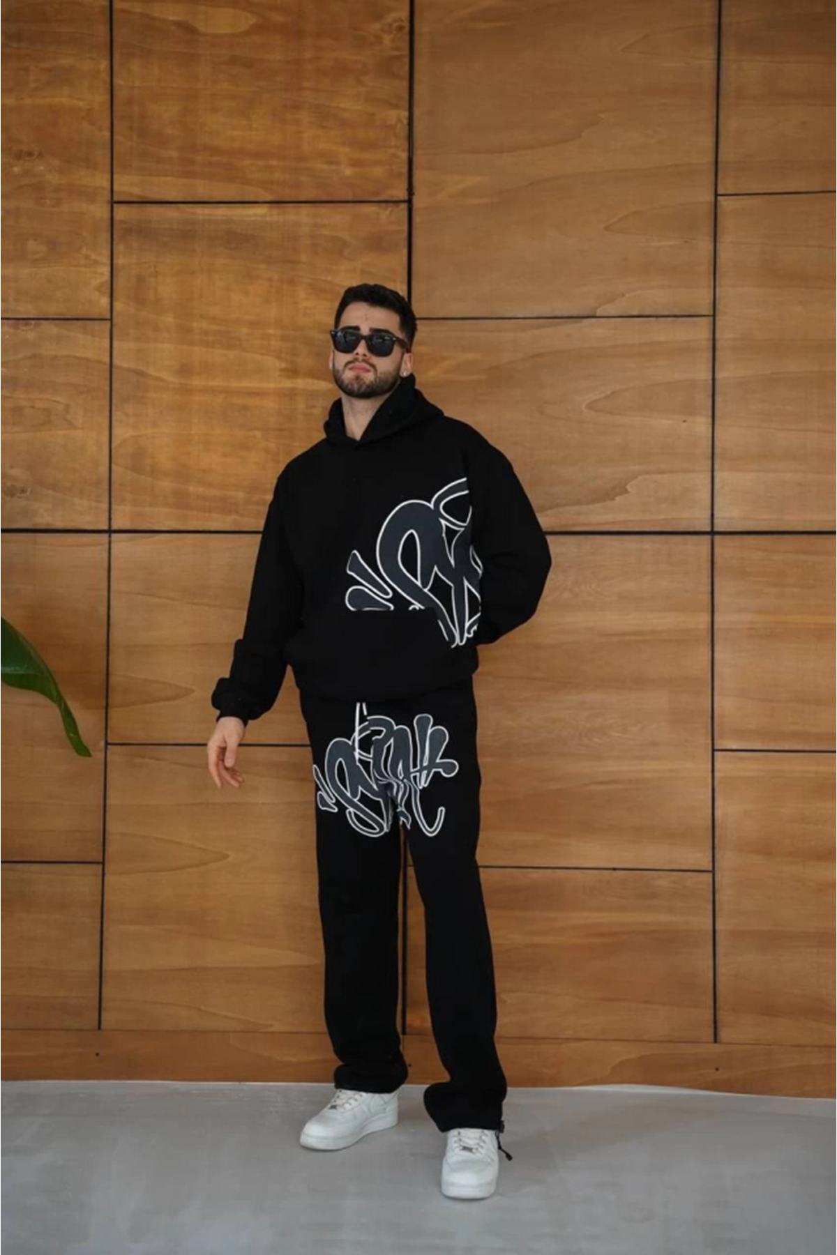 Erkek Kapüşonlu Eşofman Takım Graffiti Baskılı Oversize Rahat Kalıp, Kanguru Cepli, Streetwear Tarzında Premium Ürün 3 Iplik Pamuklu - Siyah