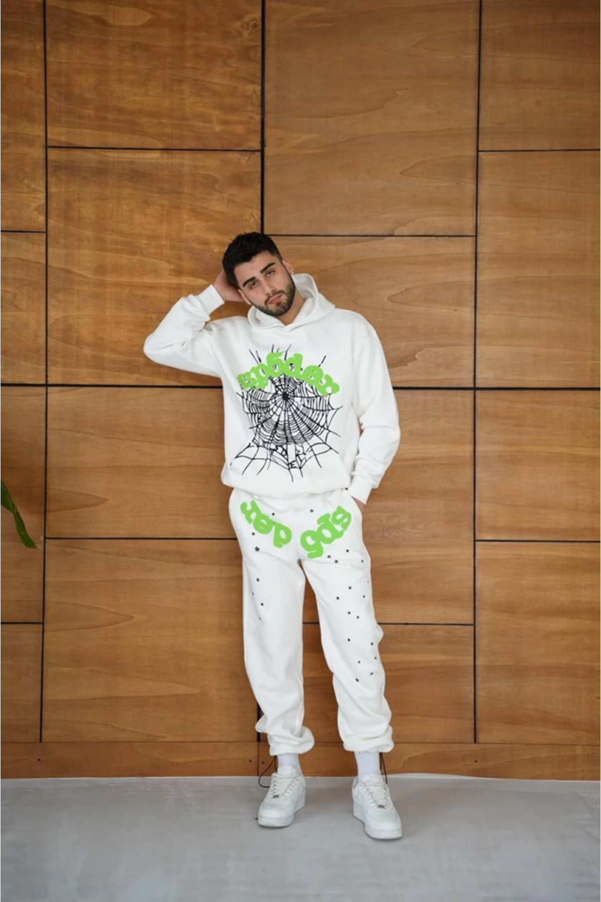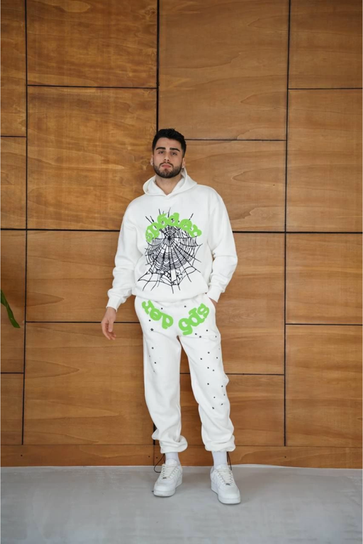 Erkek Kapüşonlu Eşofman Takım Örümcek Ağı Ve Neon Yeşil Baskılı Kanguru Cepli Oversize Rahat Kalıp, Premium Üç İplik Kumaş - Beyaz