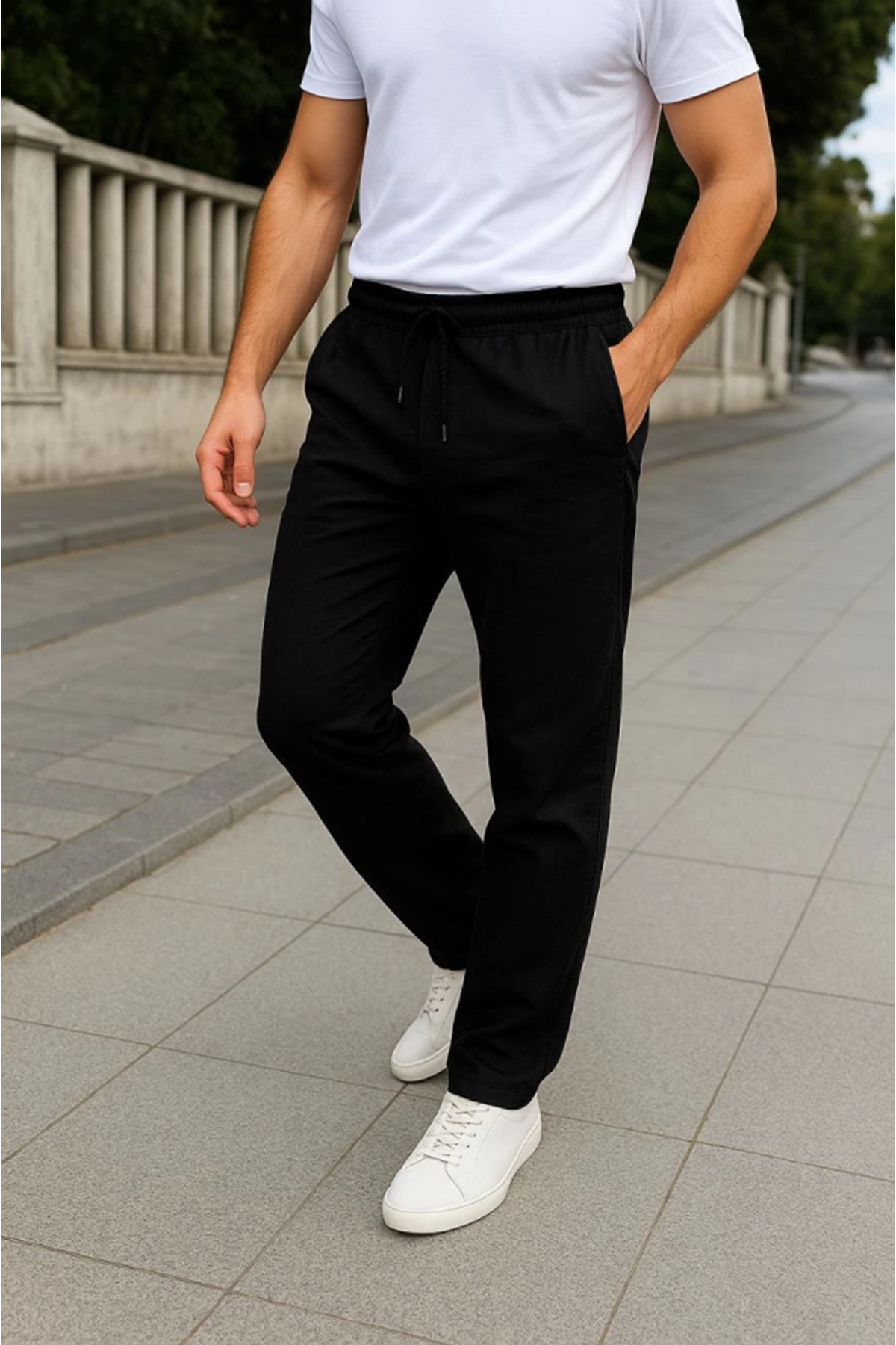 Erkek Keten Pantolon – Cepli, Beli Lastikli Ve Bağcıklı, Nefes Alan Rahat Kalıp, Yazlık Ve Baharlık Günlük Giyim, Şık - Konforlu Boru Paça Model - Siyah