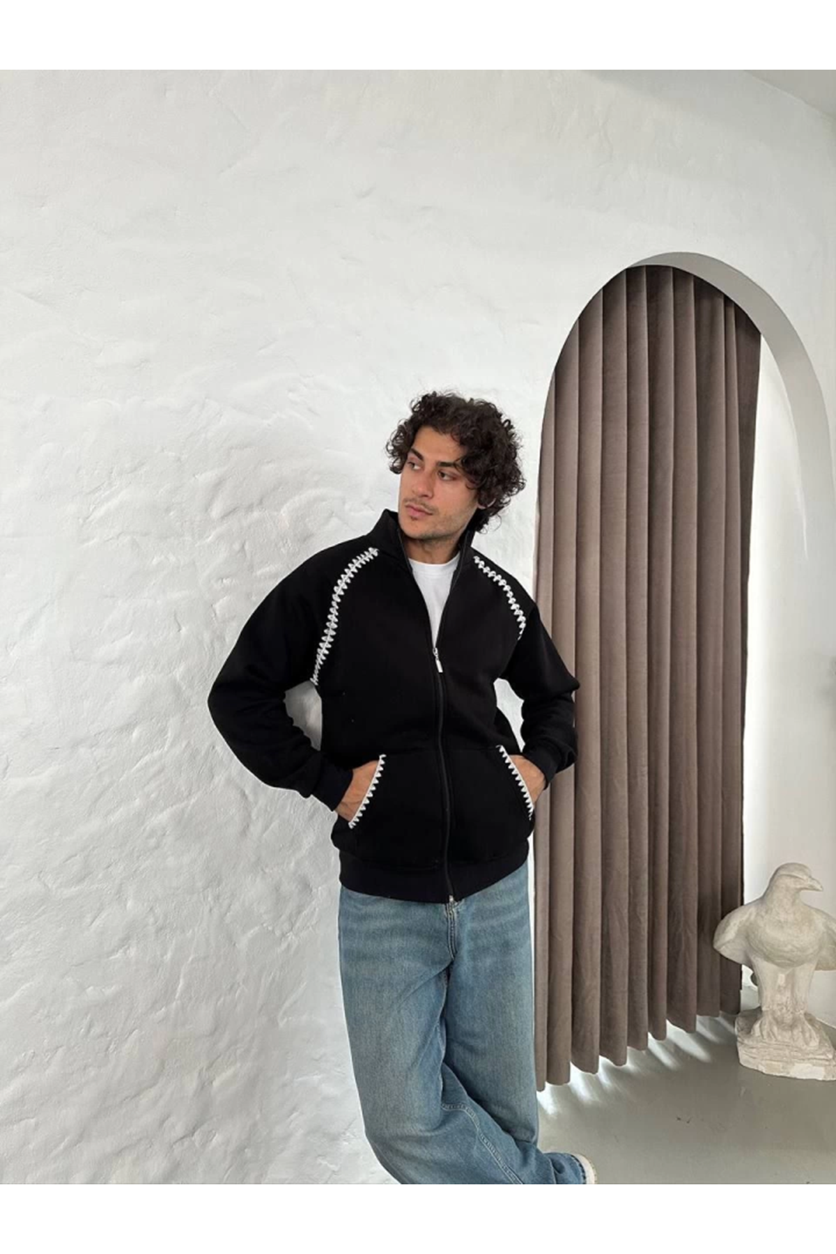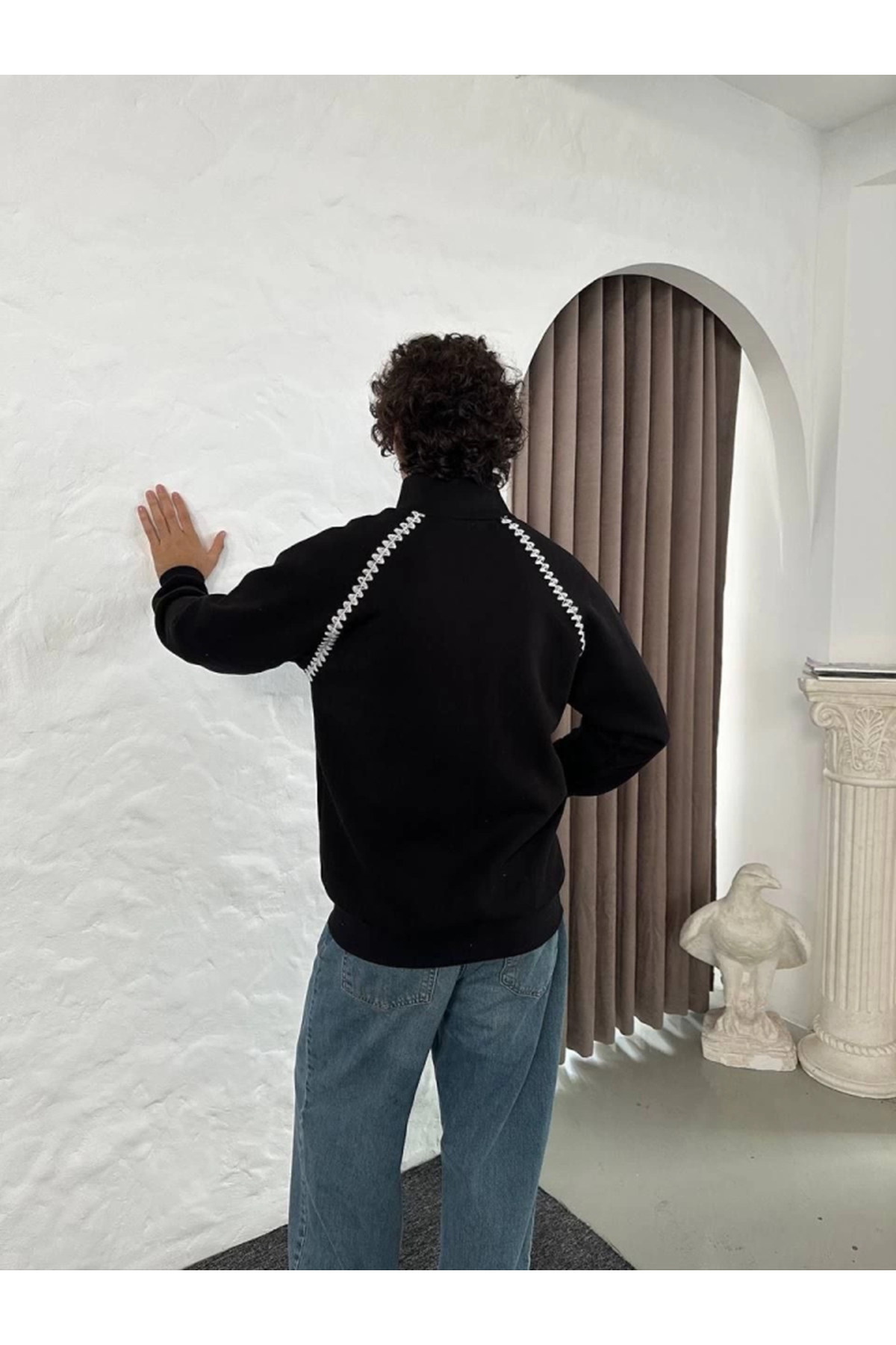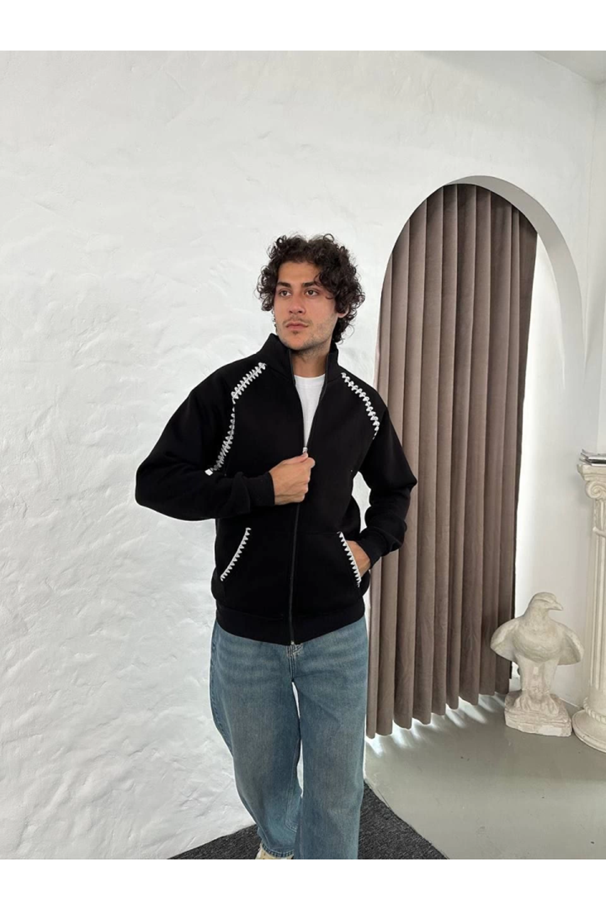 Erkek Oversize Dik Yaka Fermuarlı Sweatshirt - Zincir Nakışli Kanguru Cepli - Siyah