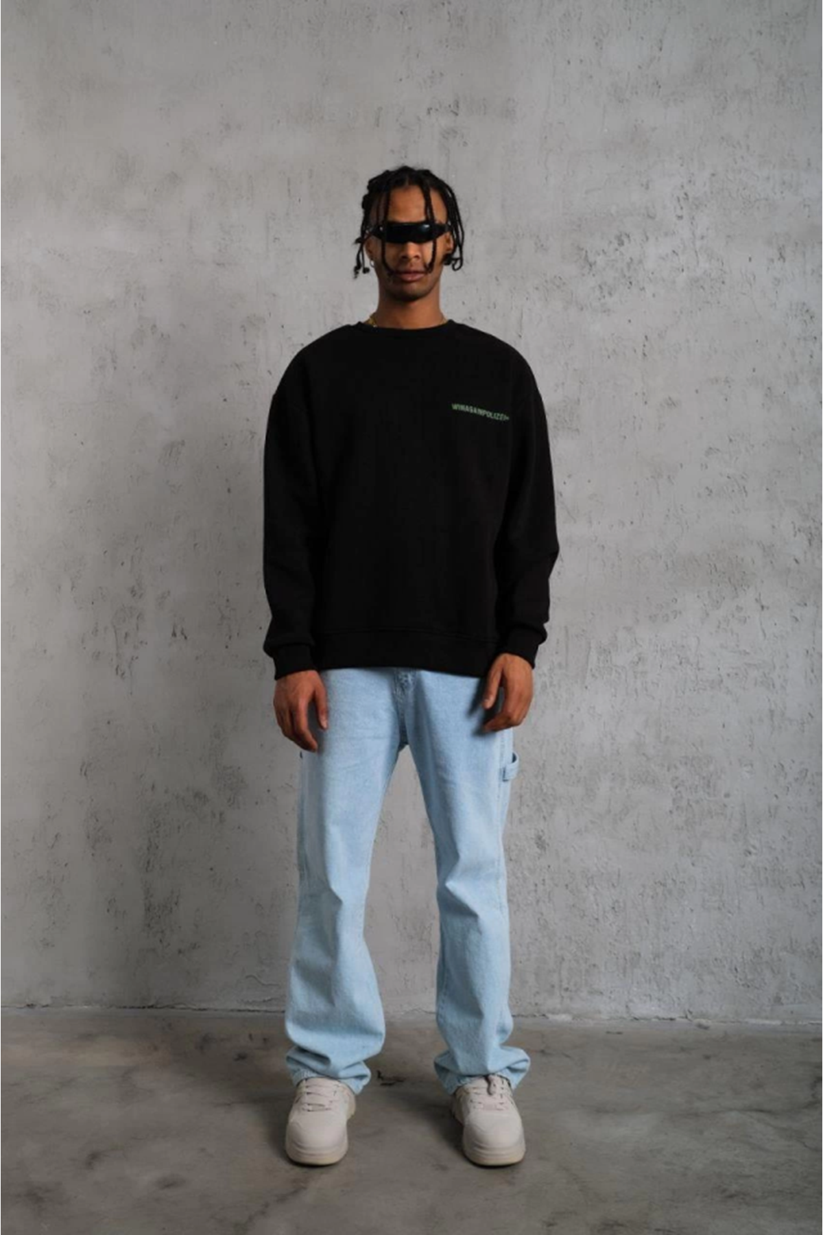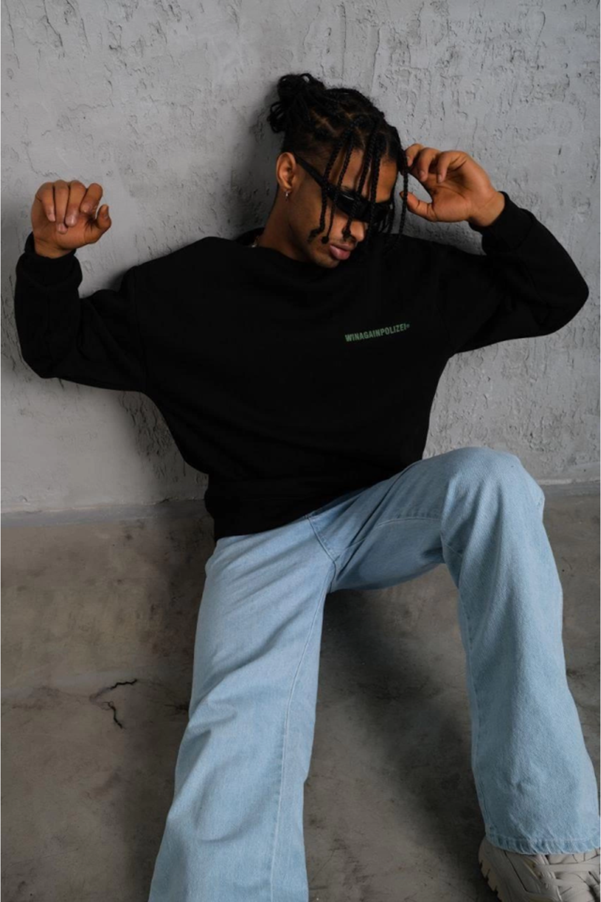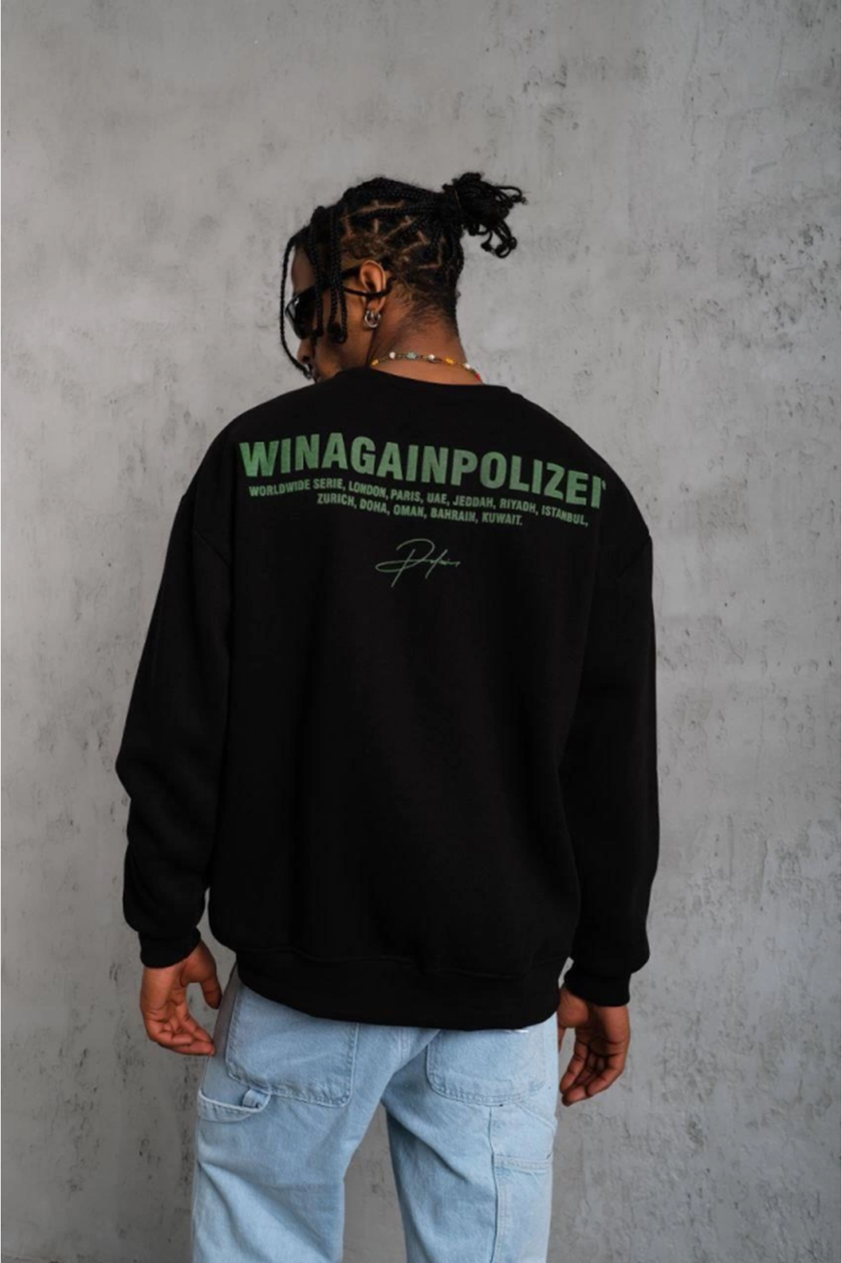 Erkek Oversize Sweatshirt – Siyah Renk Ön Ve Sırt Baskılı, Üç İplik İçi Pamuklu Kumaş, Rahat Kalıp, Ribanalı Kışlık Sweat Winagain Polizei Serisi - Siyah