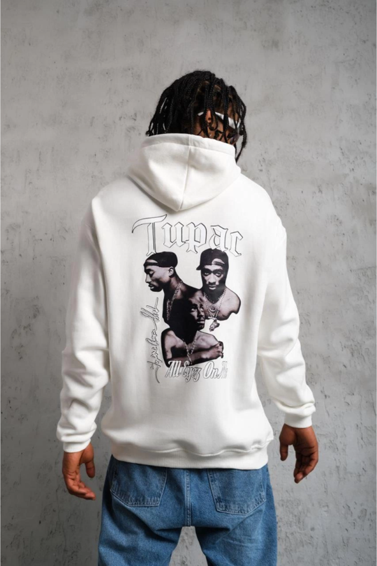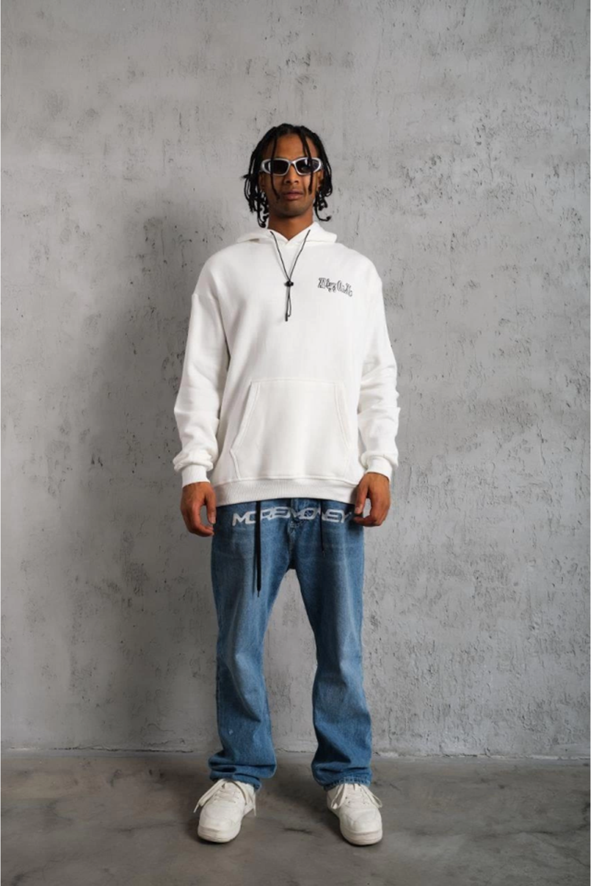 Erkek Oversize Üç İplik Kapüşonlu Sweat – Kol Ve Etek Ribana Detaylı, Ön Ve Sırt Baskılı, Kanguru Cepli Rahat Kalıp Model - Beyaz
