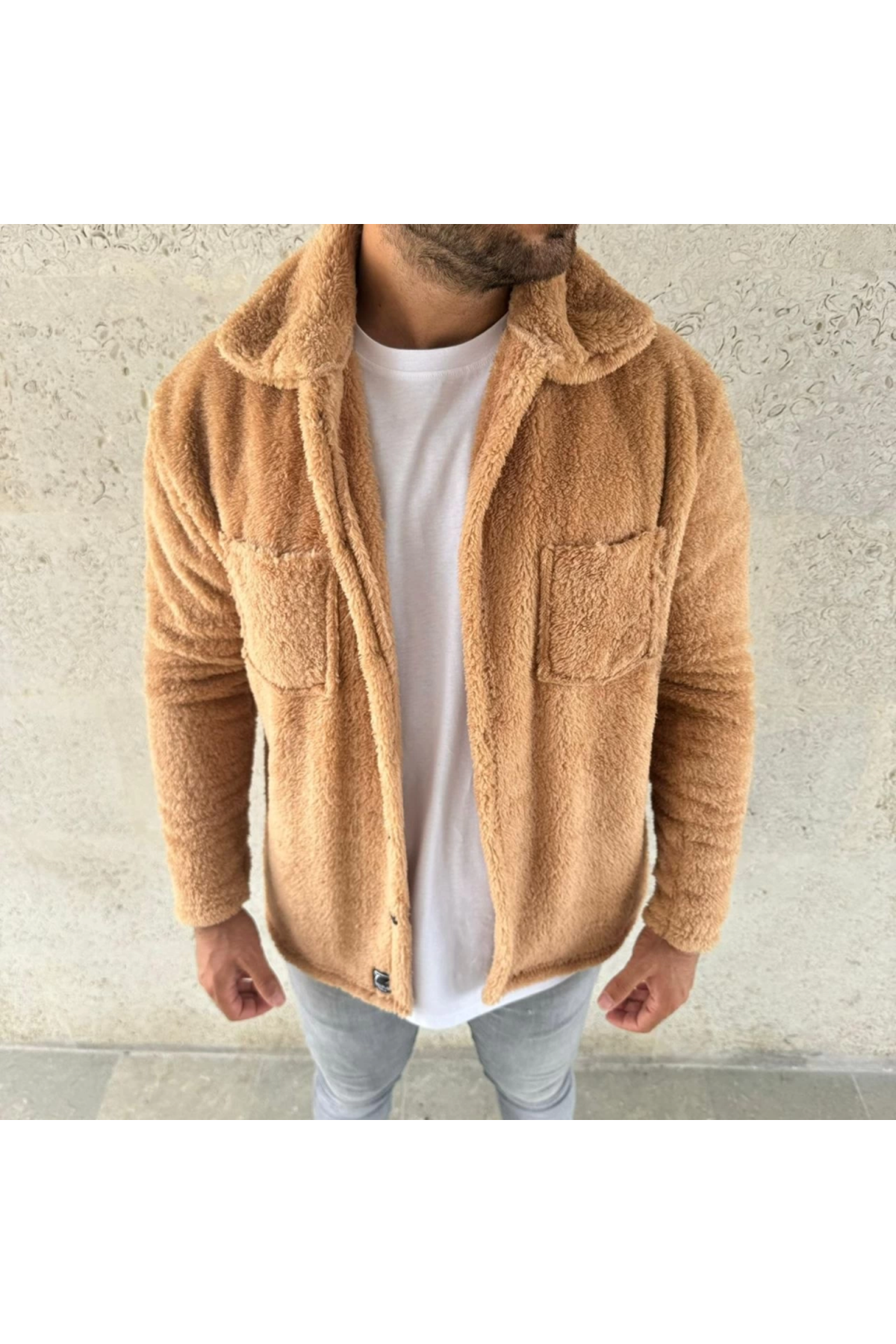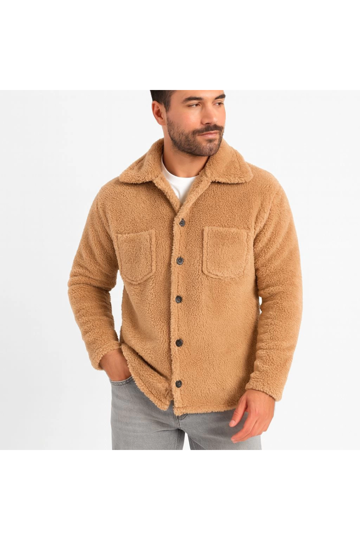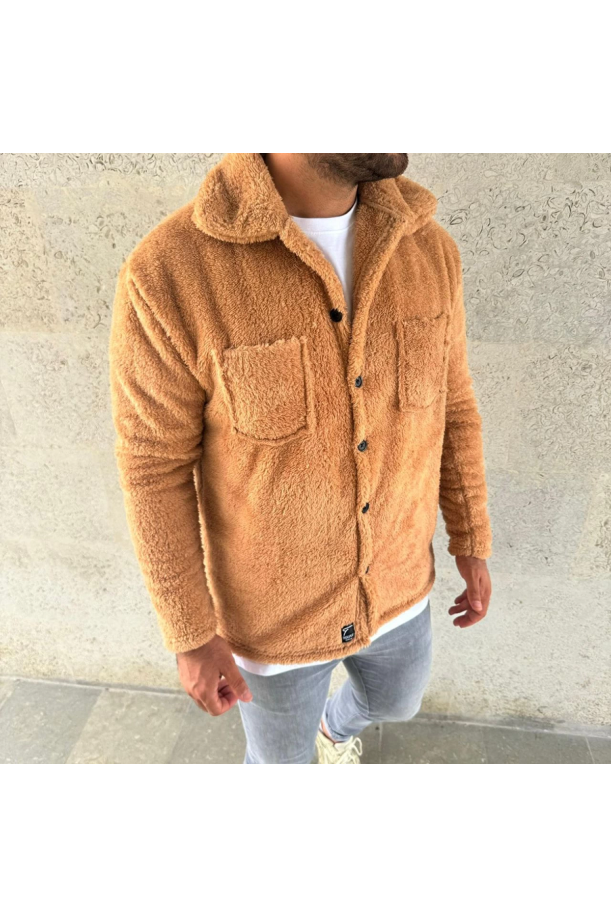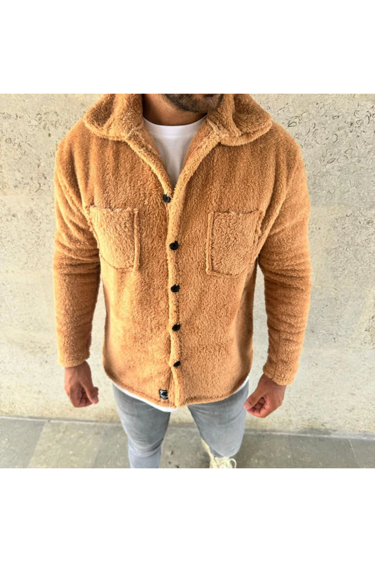 Erkek Pelüş Polar Hırka Gömlek – Yakalı, İlik Düğmeli, Göğüs Cepli, Yumuşak Dokulu Kışlık Regular Fit Rahat Günlük Model - Açık Kahve