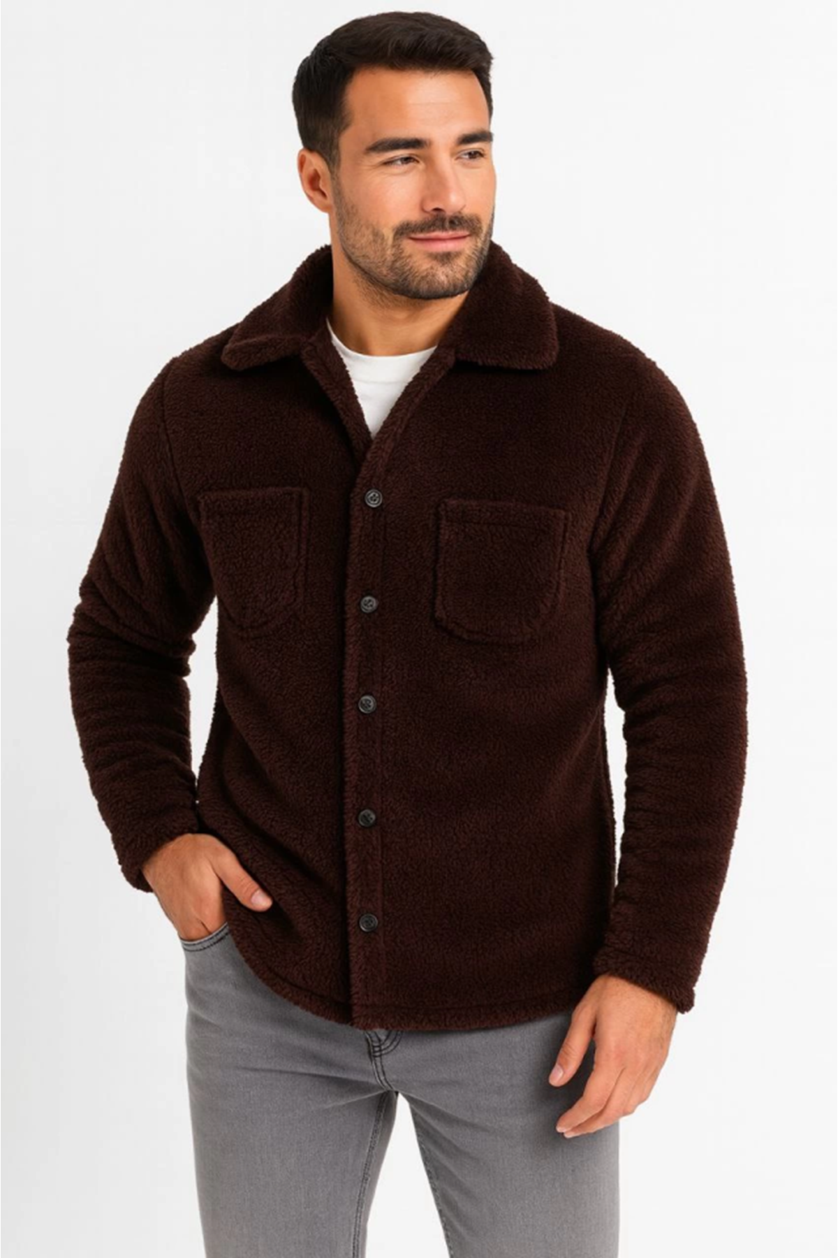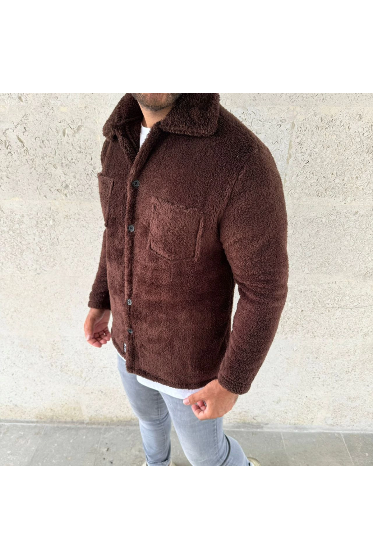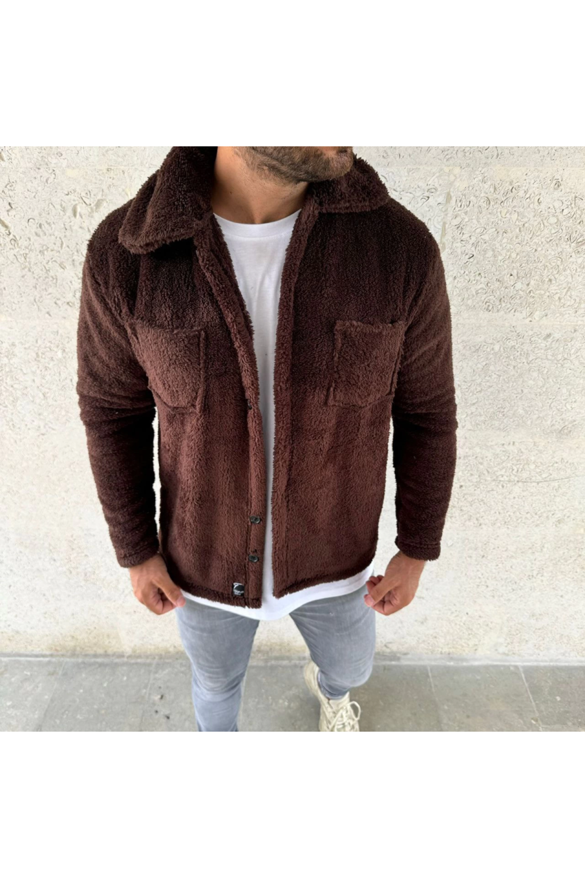 Erkek Pelüş Polar Hırka Gömlek – Yakalı, İlik Düğmeli, Göğüs Cepli, Yumuşak Dokulu Kışlık Regular Fit Rahat Günlük Model - Kahverengi
