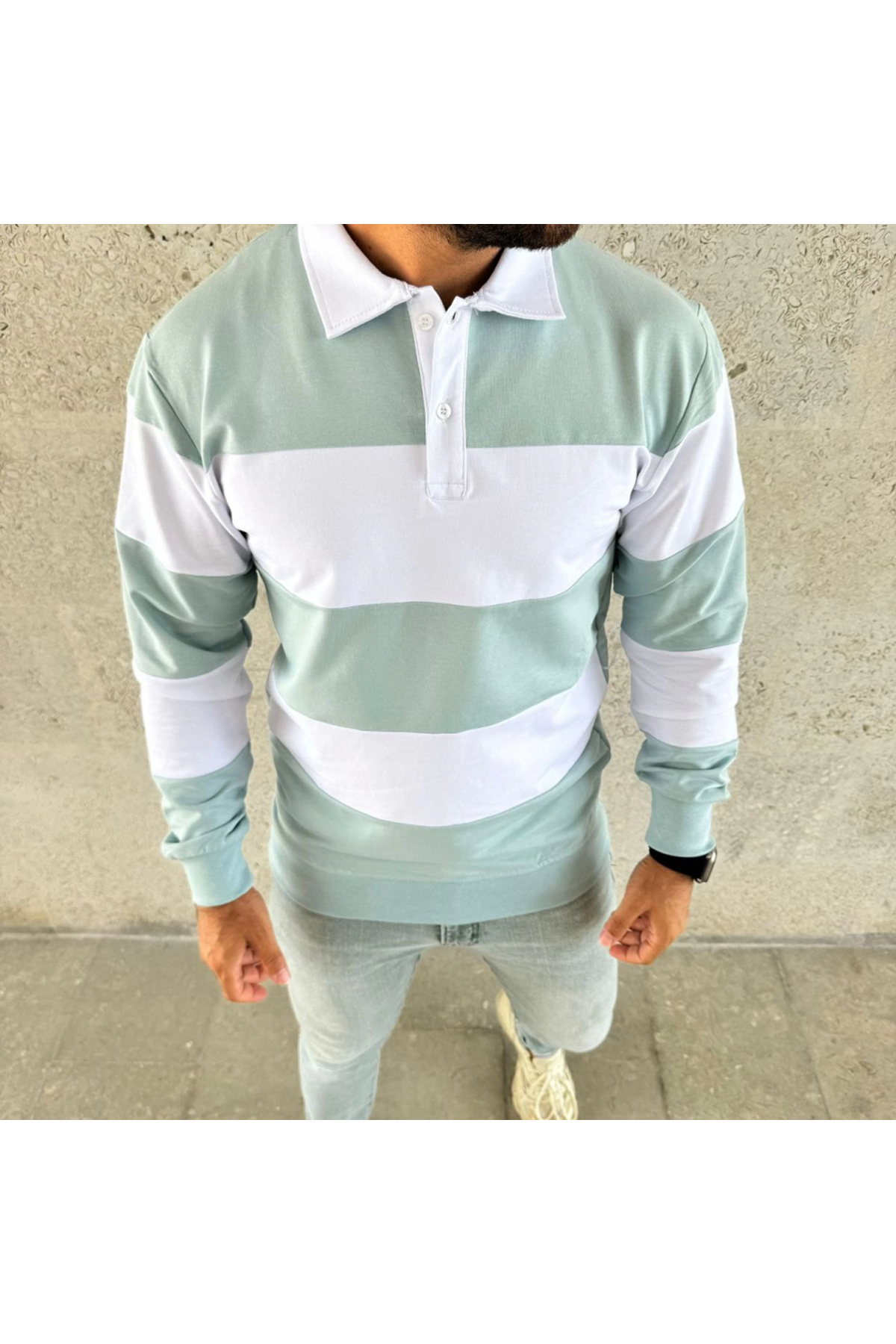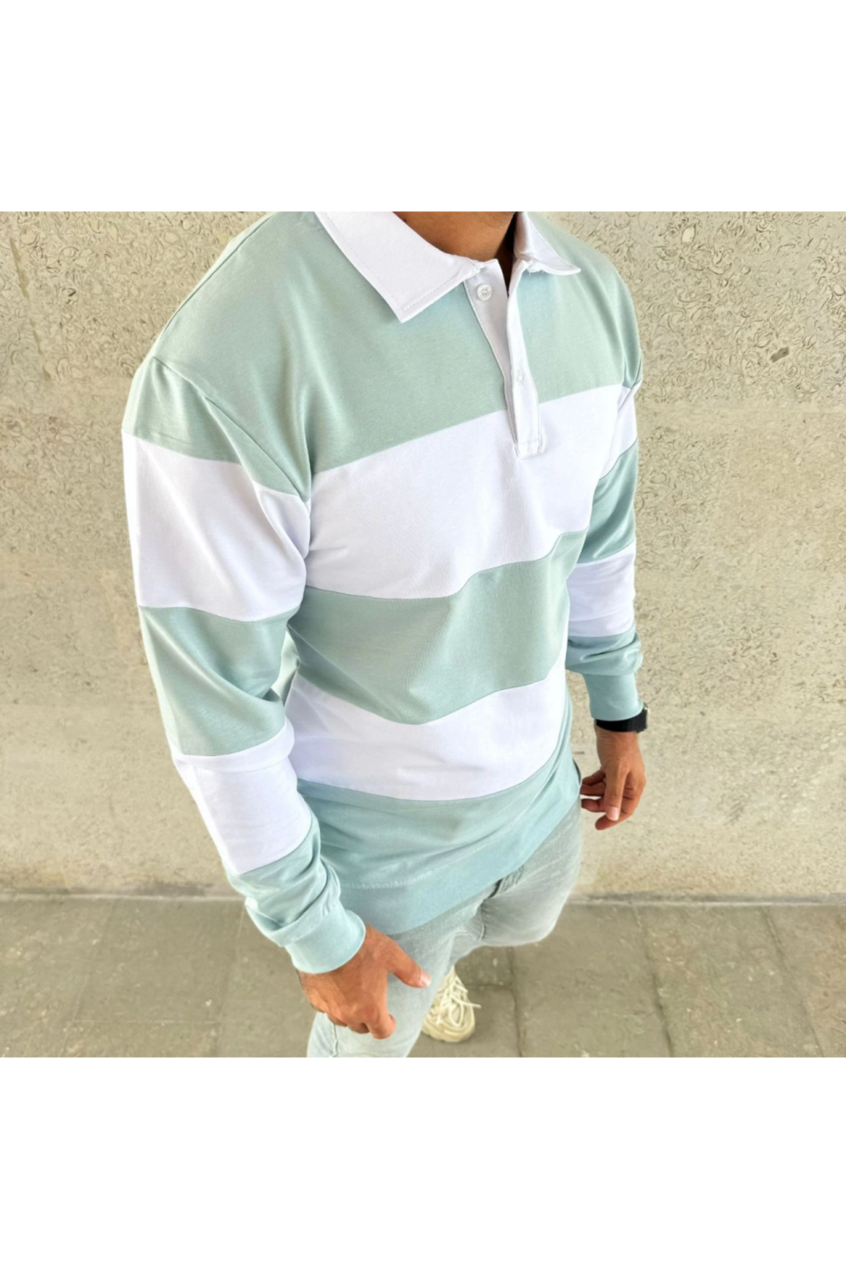 Erkek Polo Yaka Uzun Kollu Çizgili Sweatshirt Trend Rugby Stil - Çağla Yeşili