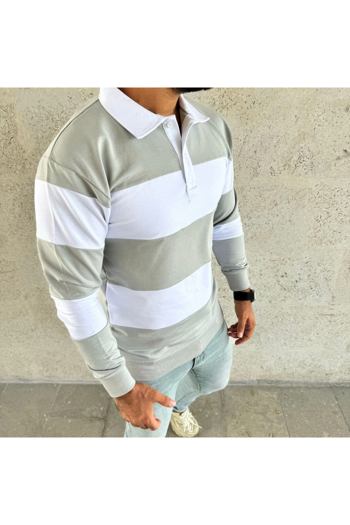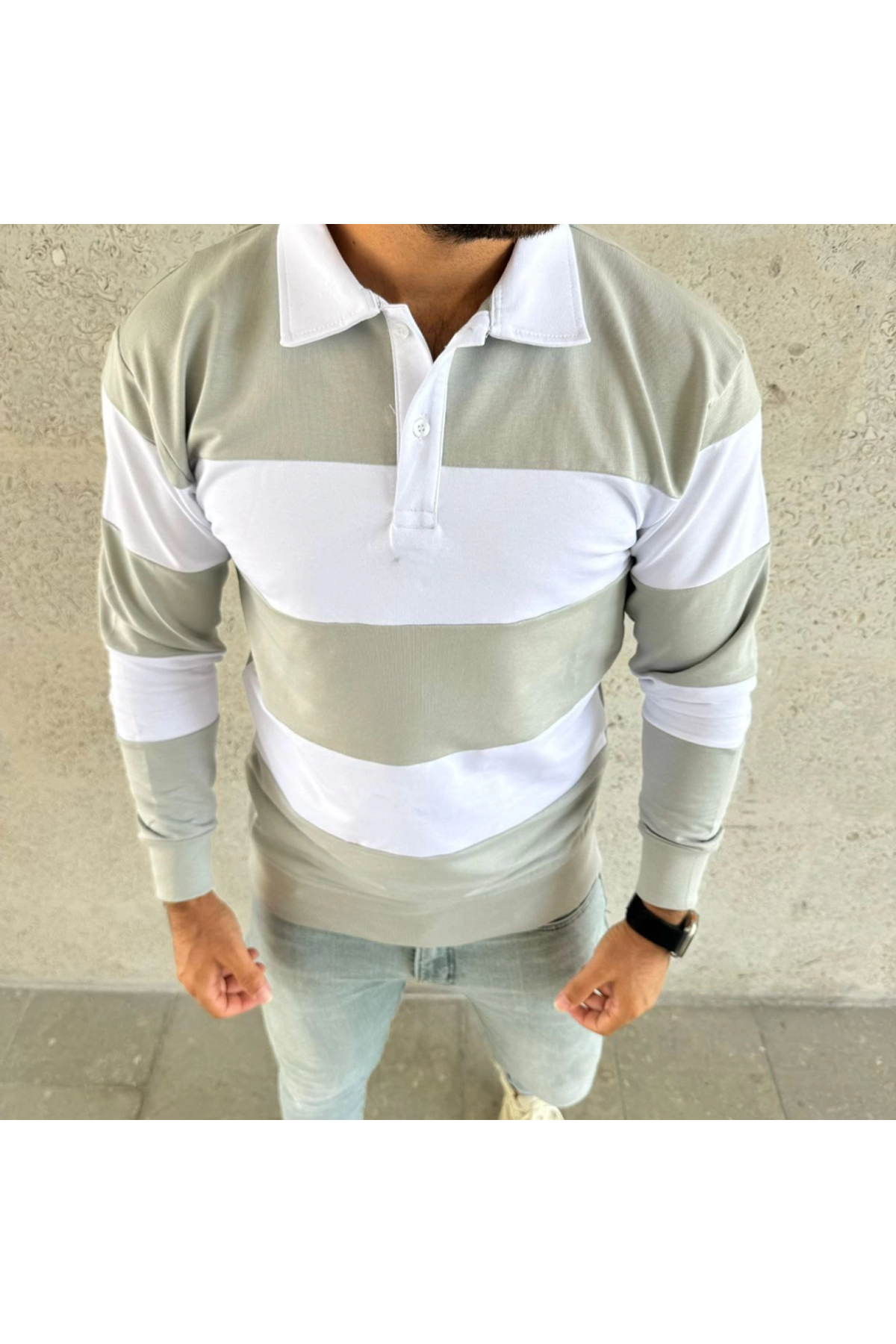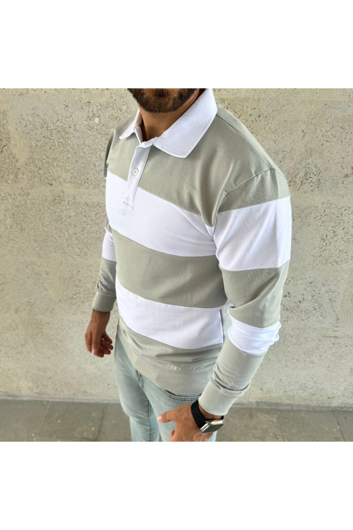 Erkek Polo Yaka Uzun Kollu Çizgili Sweatshirt Trend Rugby Stil - Mint Yeşili