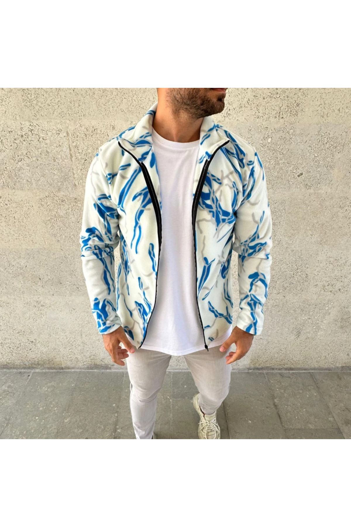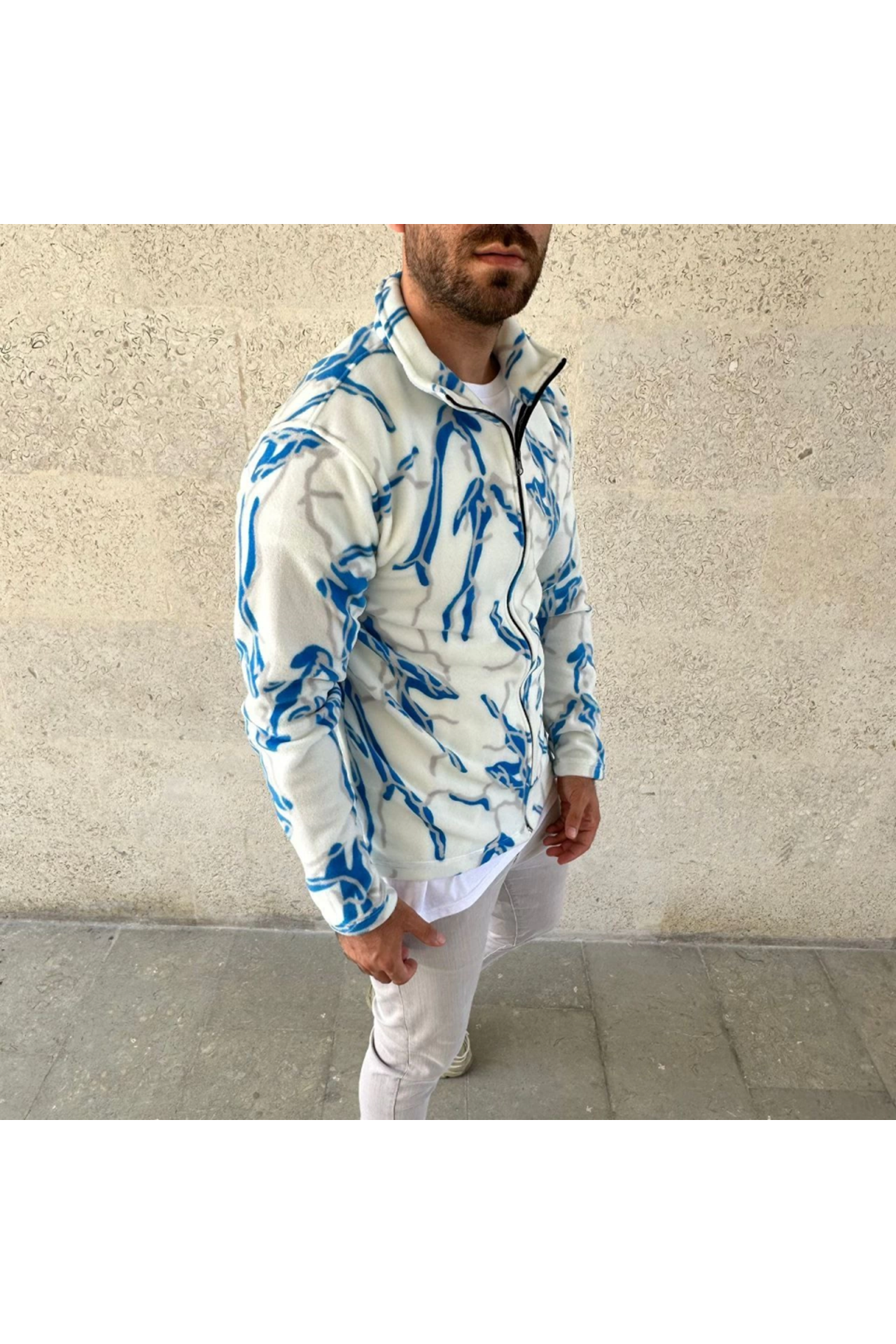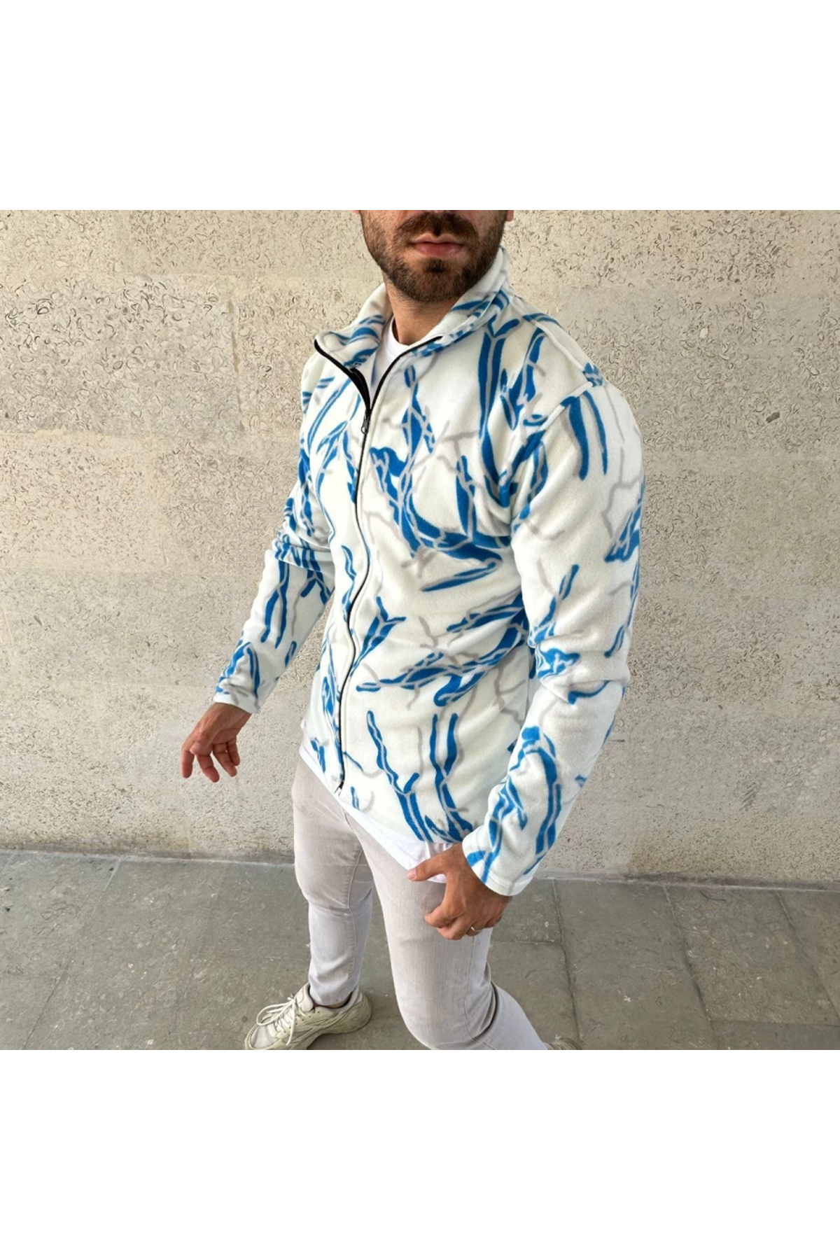 Erkek Tam Fermuarlı Desenli Polar Sweat Lightning Desen Yakalı, Uzun Kollu, Oversize Rahat Kalıp - Beyaz
