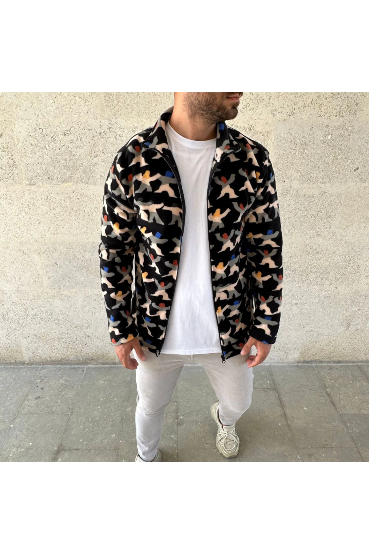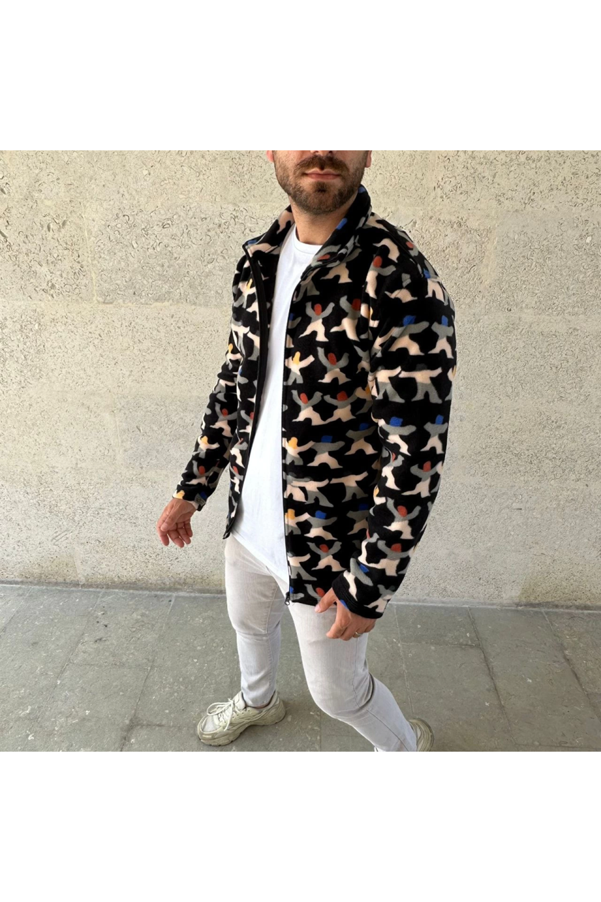 Erkek Tam Fermuarlı Desenli Polar Sweat – Siyah Multicolor Figür Desen Yakalı, Uzun Kollu, Oversize Rahat Kalıp- Siyah