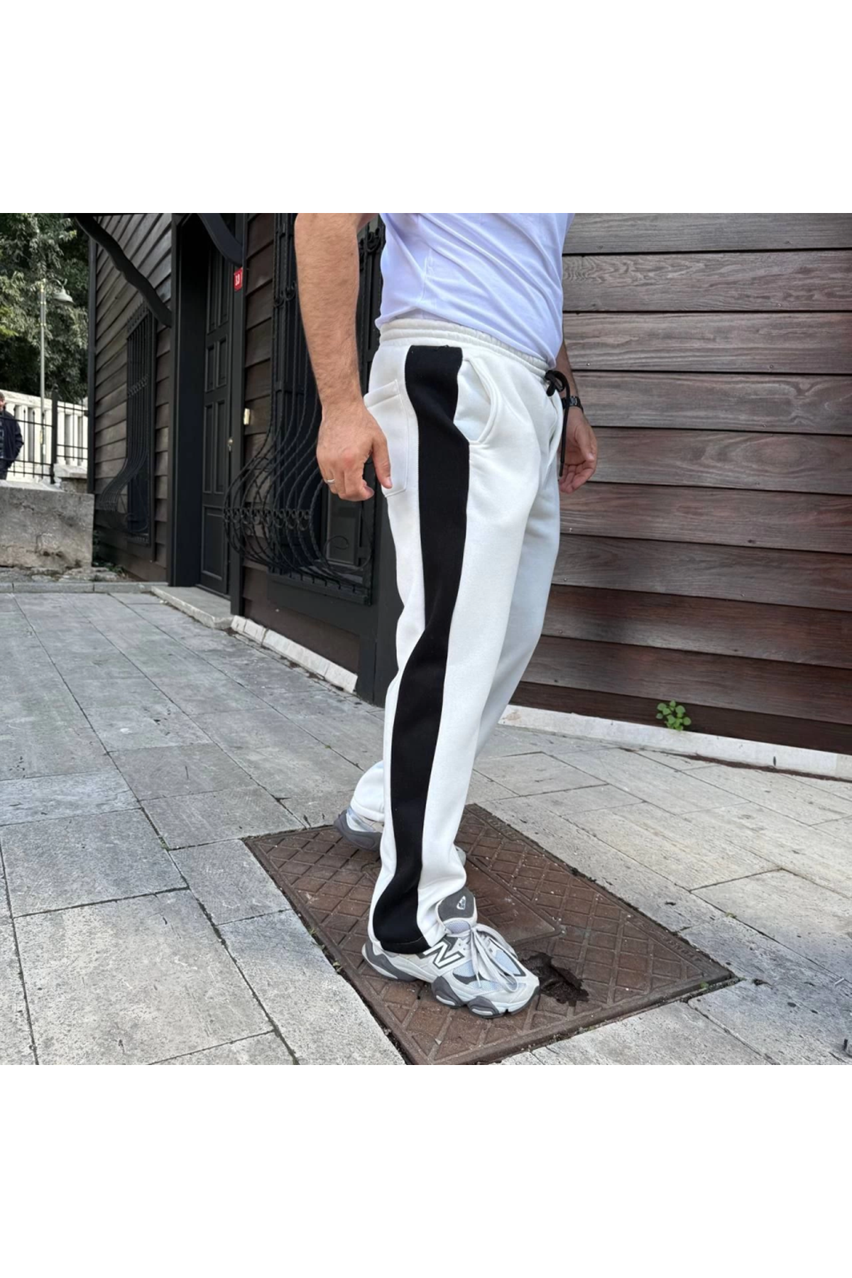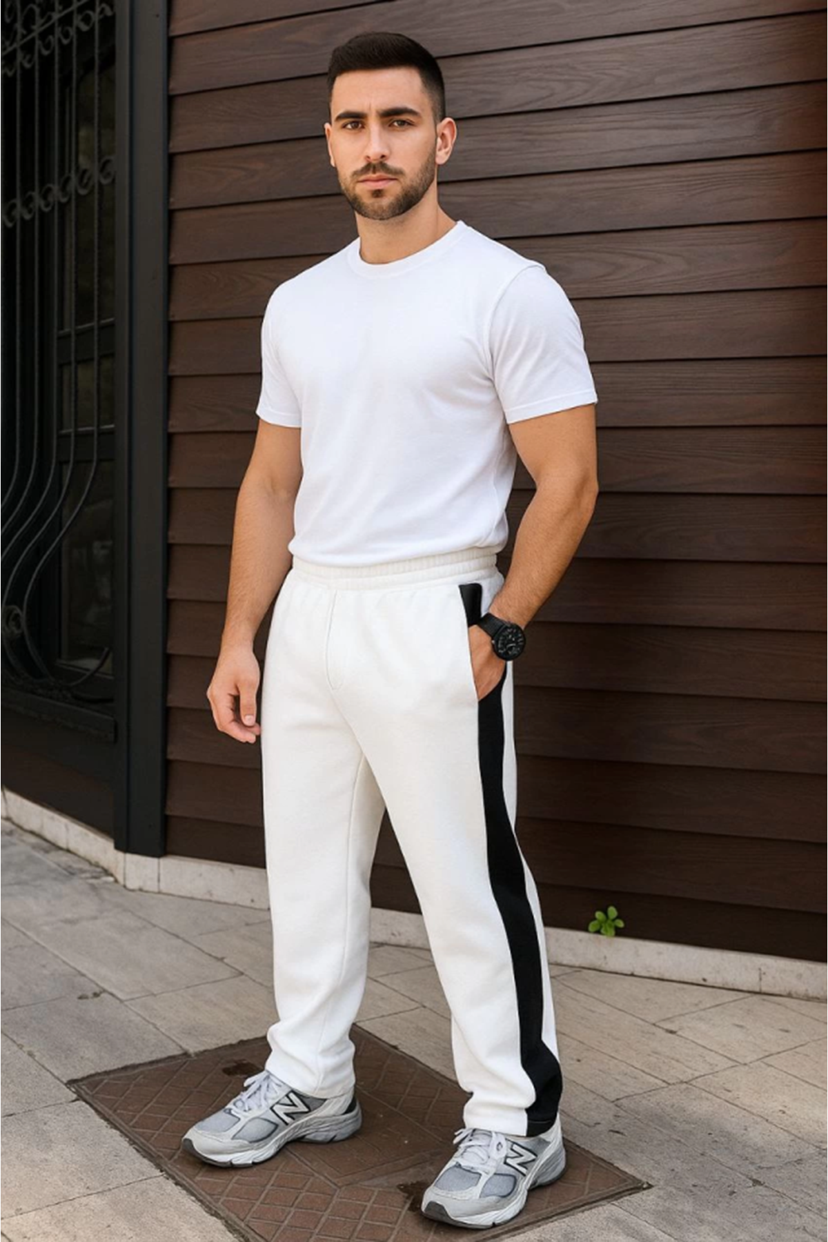 Erkek Üç İplik Kışlık Pamuklu Yandan Garneli Kalın Şeritli Cepli Eşofman Altı - Beyaz