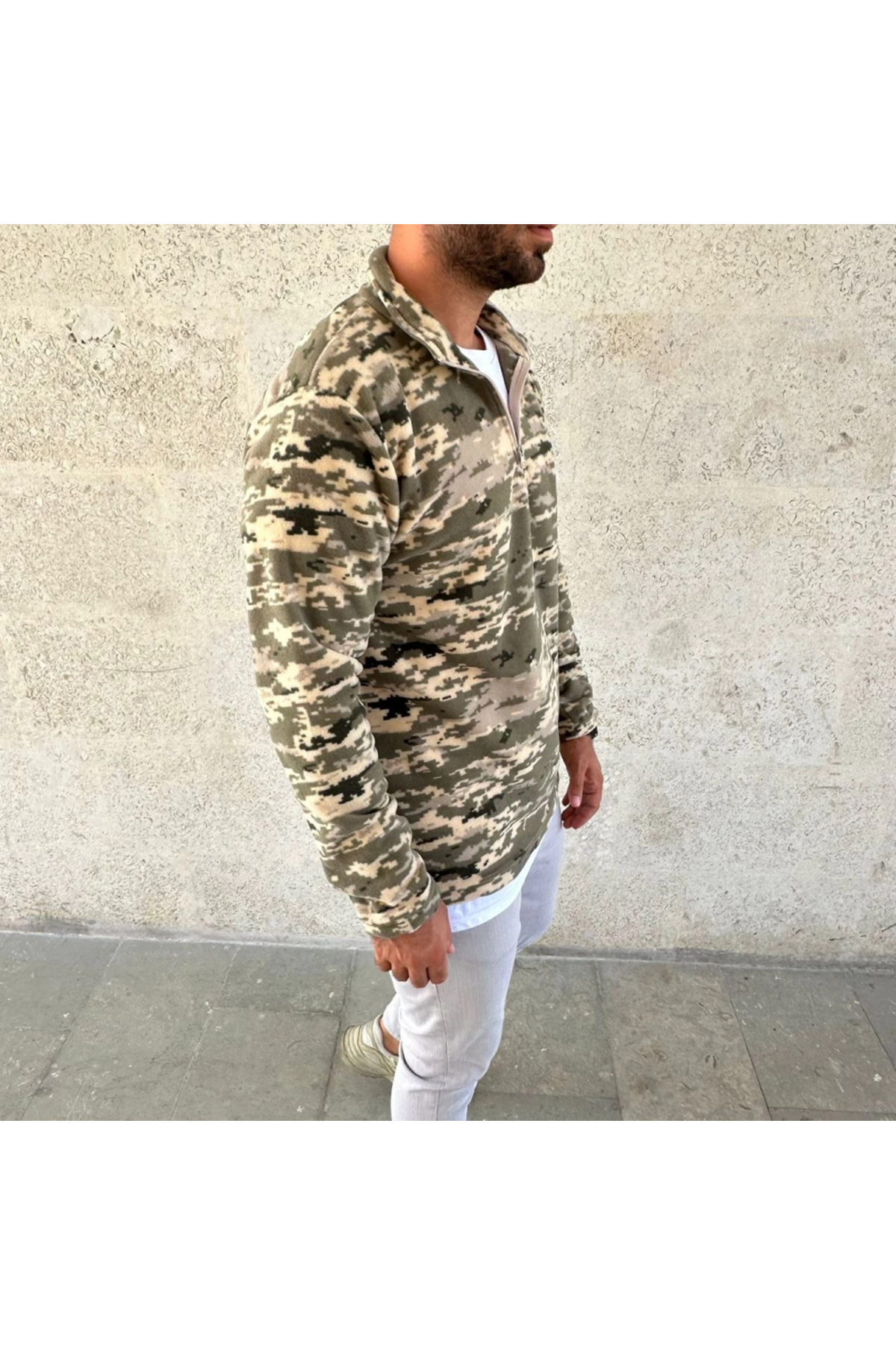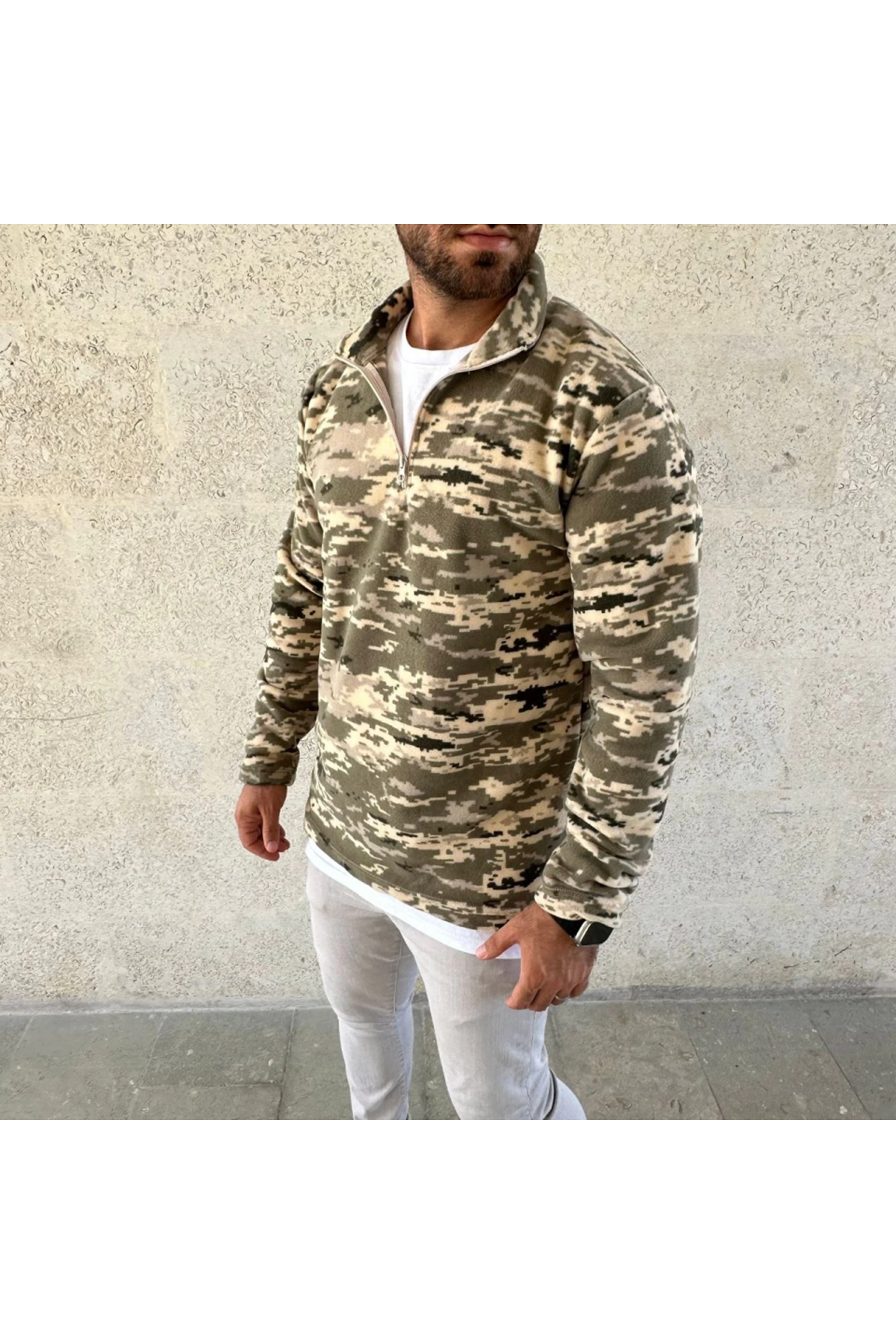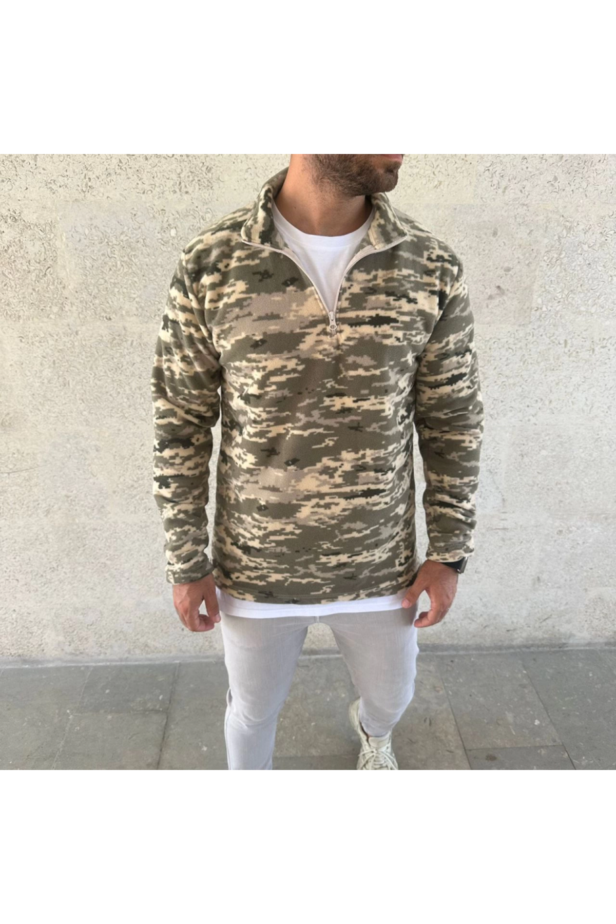 Erkek Yarım Fermuarlı Desenli Polar Sweat – Haki Kamuflaj Yakalı, Uzun Kollu, Oversize Rahat Kalıp - Haki
