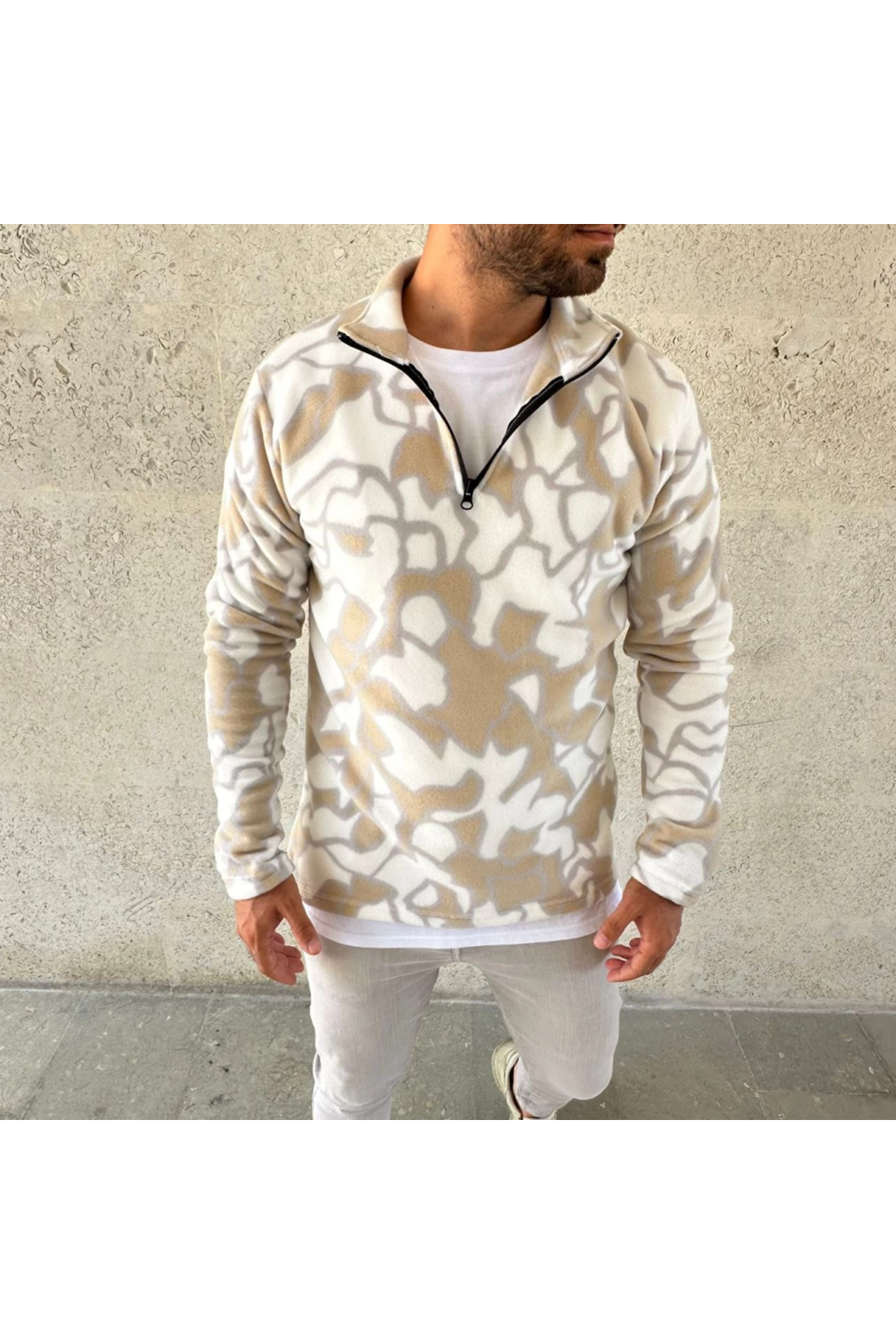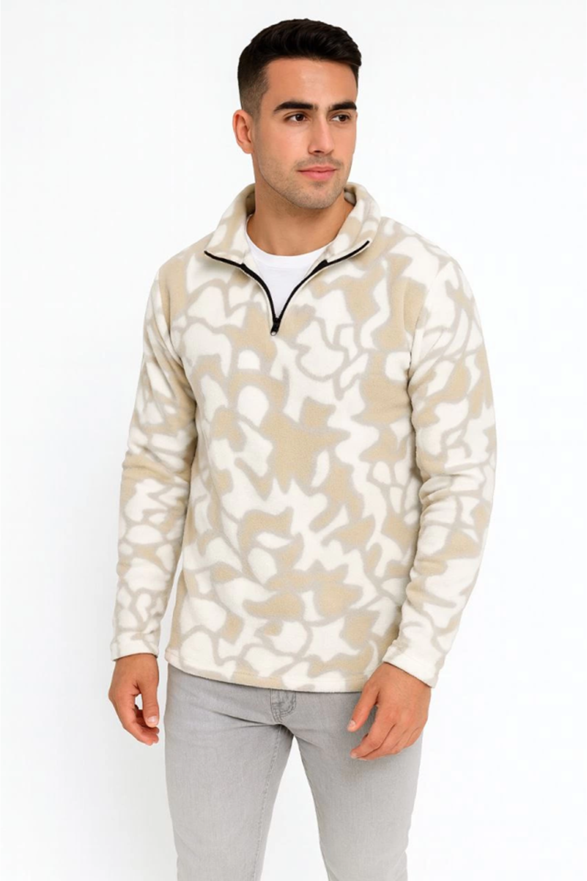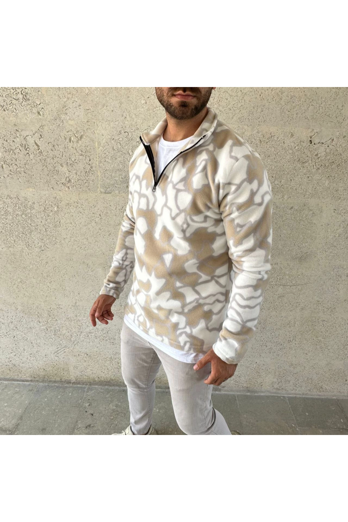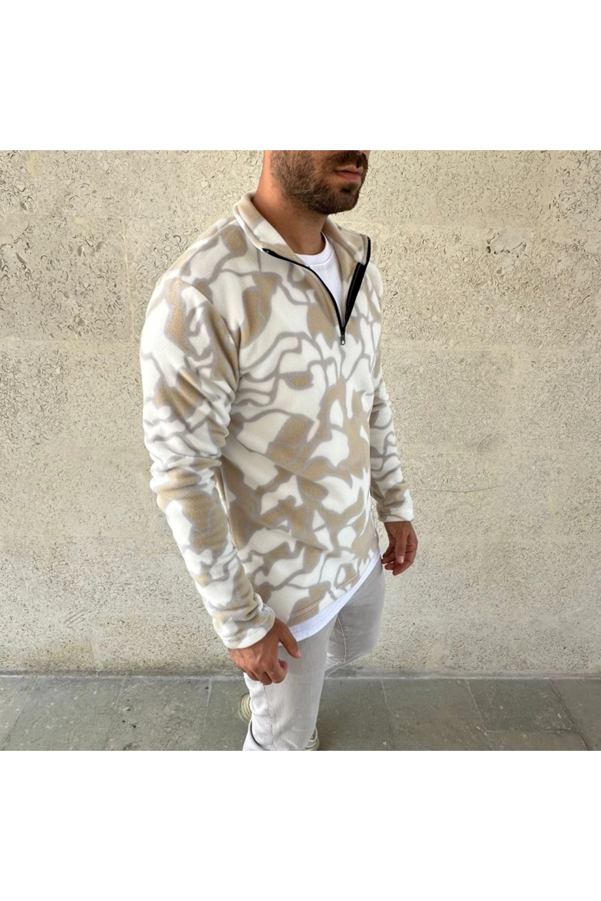 Erkek Yarım Fermuarlı Desenli Polar Sweat Yakalı, Uzun Kollu, Oversize Rahat Kalıp - Bej
