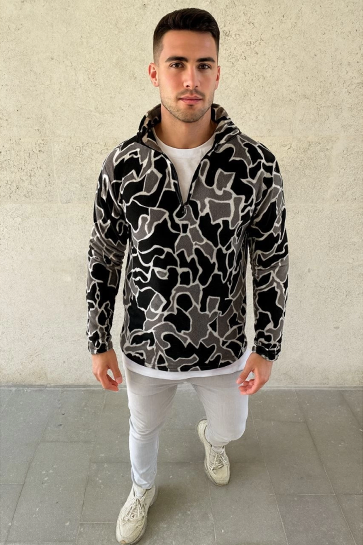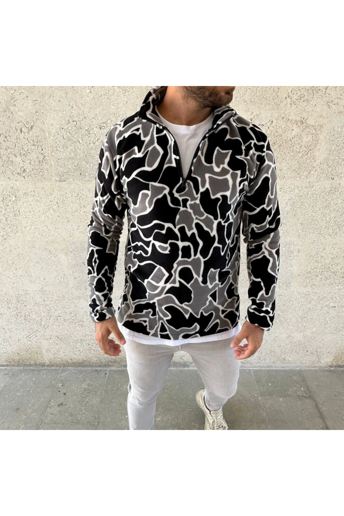 Erkek Yarım Fermuarlı Desenli Polar Sweat Yakalı, Uzun Kollu, Oversize Rahat Kalıp - Siyah